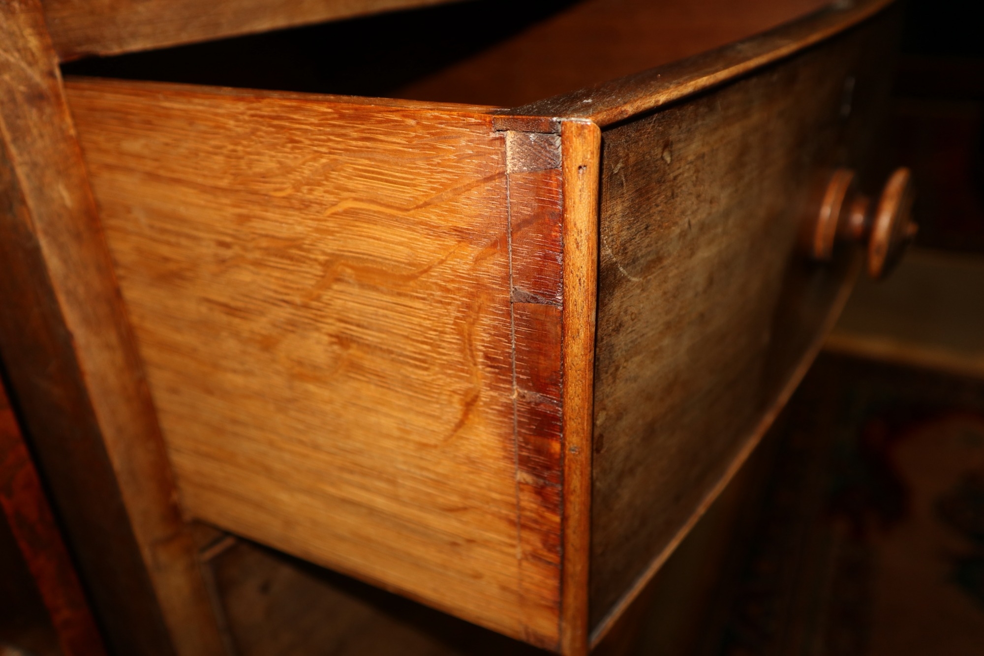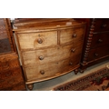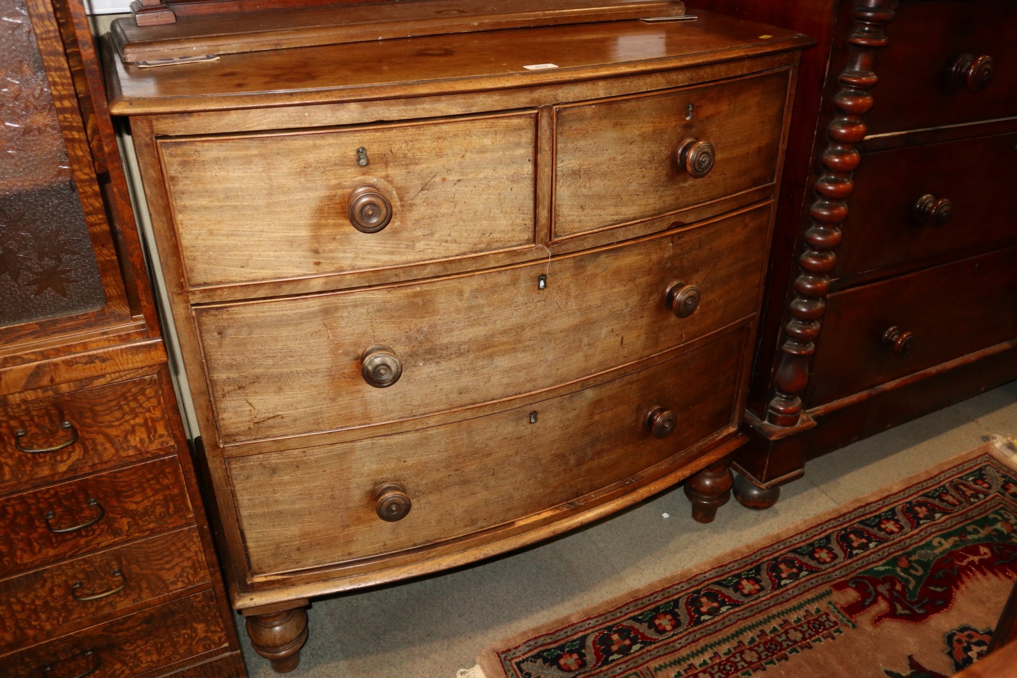 A 19th century mahogany bowfront chest of two short and two long drawers with knob handles, on turned supports, 36" wide x 20" deep x 36" high