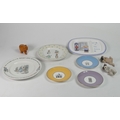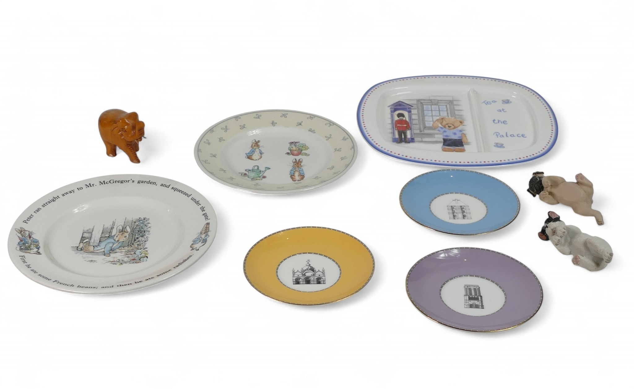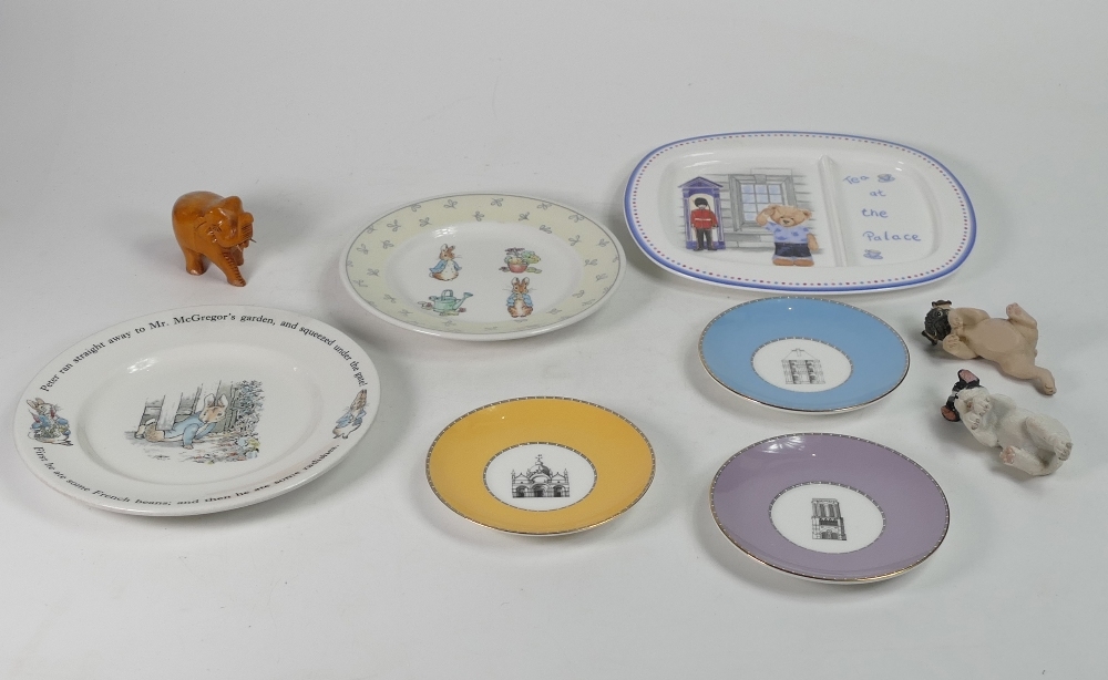 Wedgwood selection to include:- 'Tea at the Palace plate', two Peter Rabbit plates, three 'Grand Tour Collection' coloured decorative saucers together with two resin type climbing dogs and a small wooden elephant(1tray)