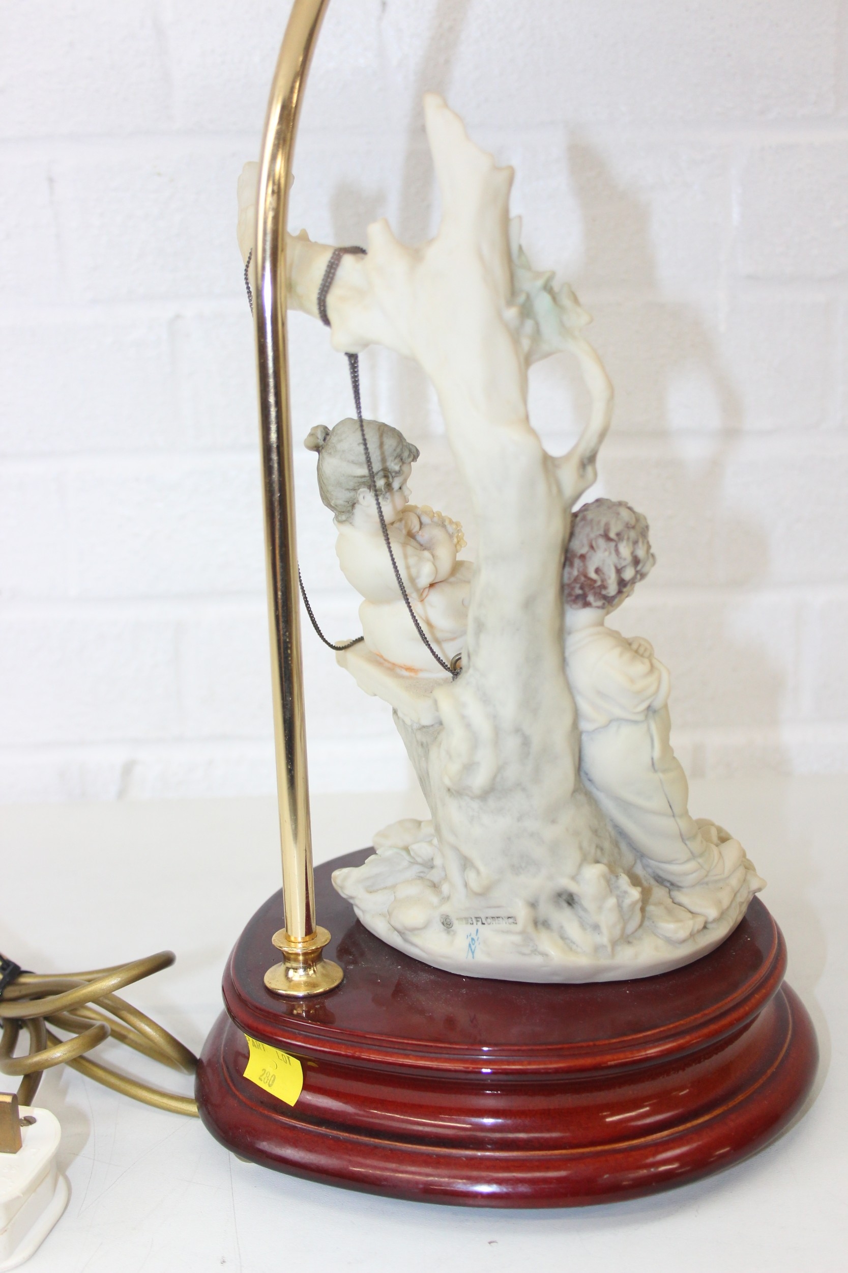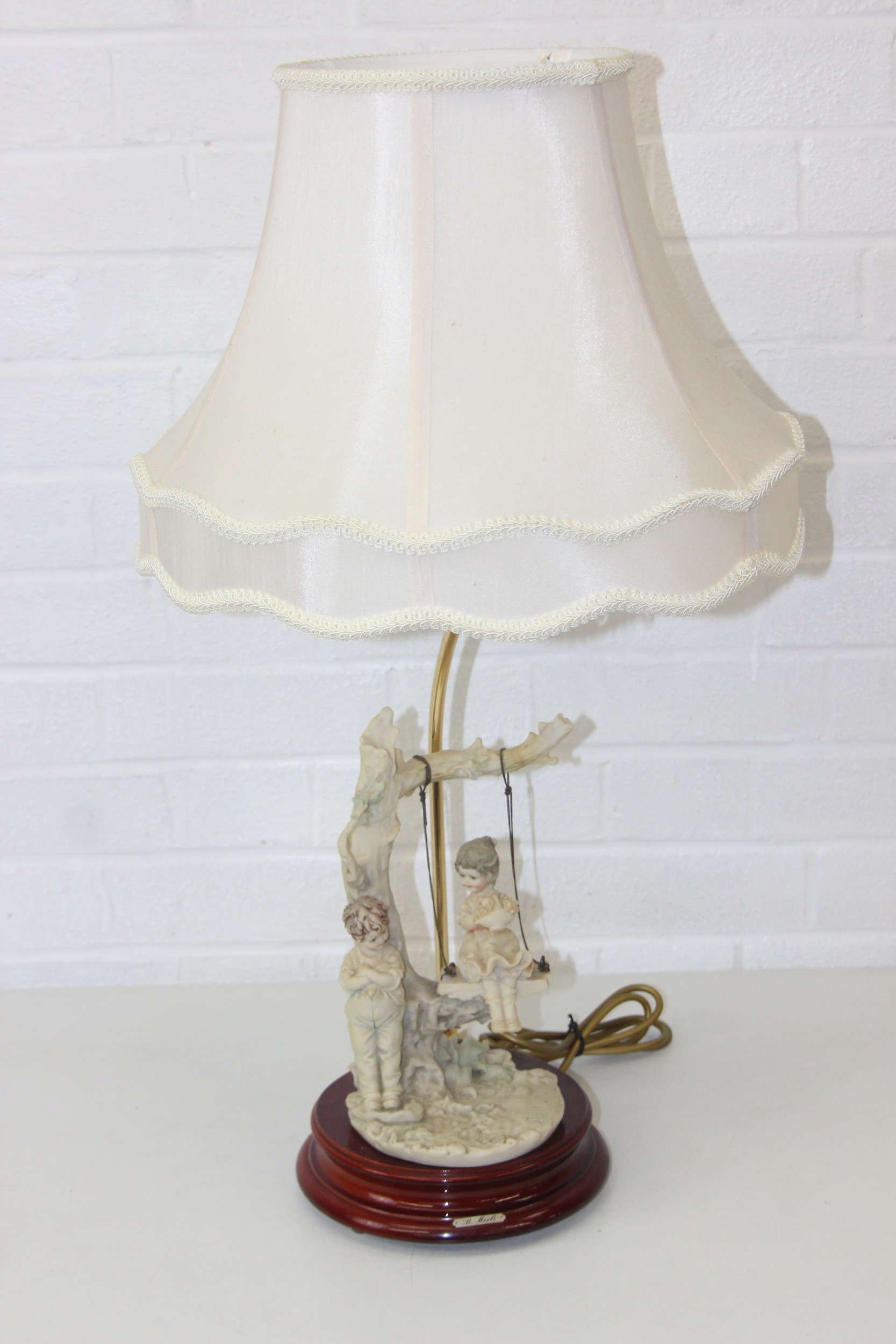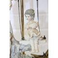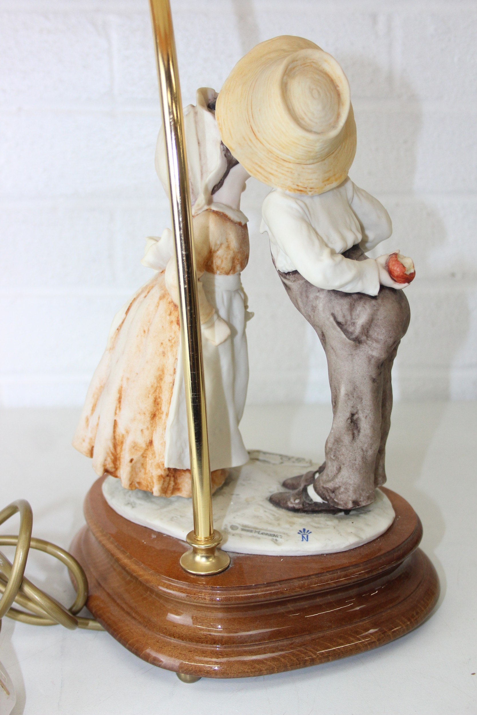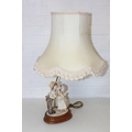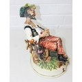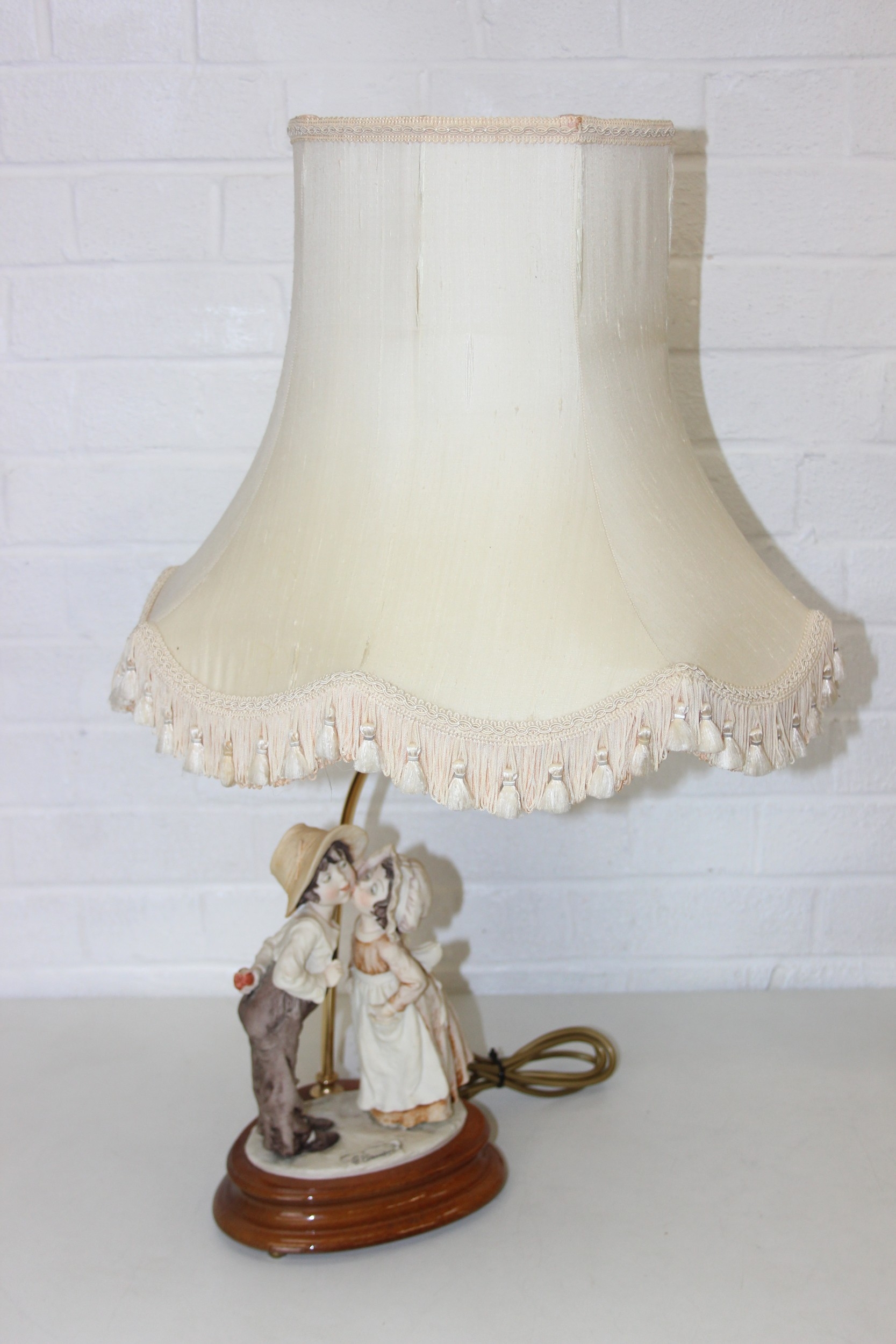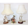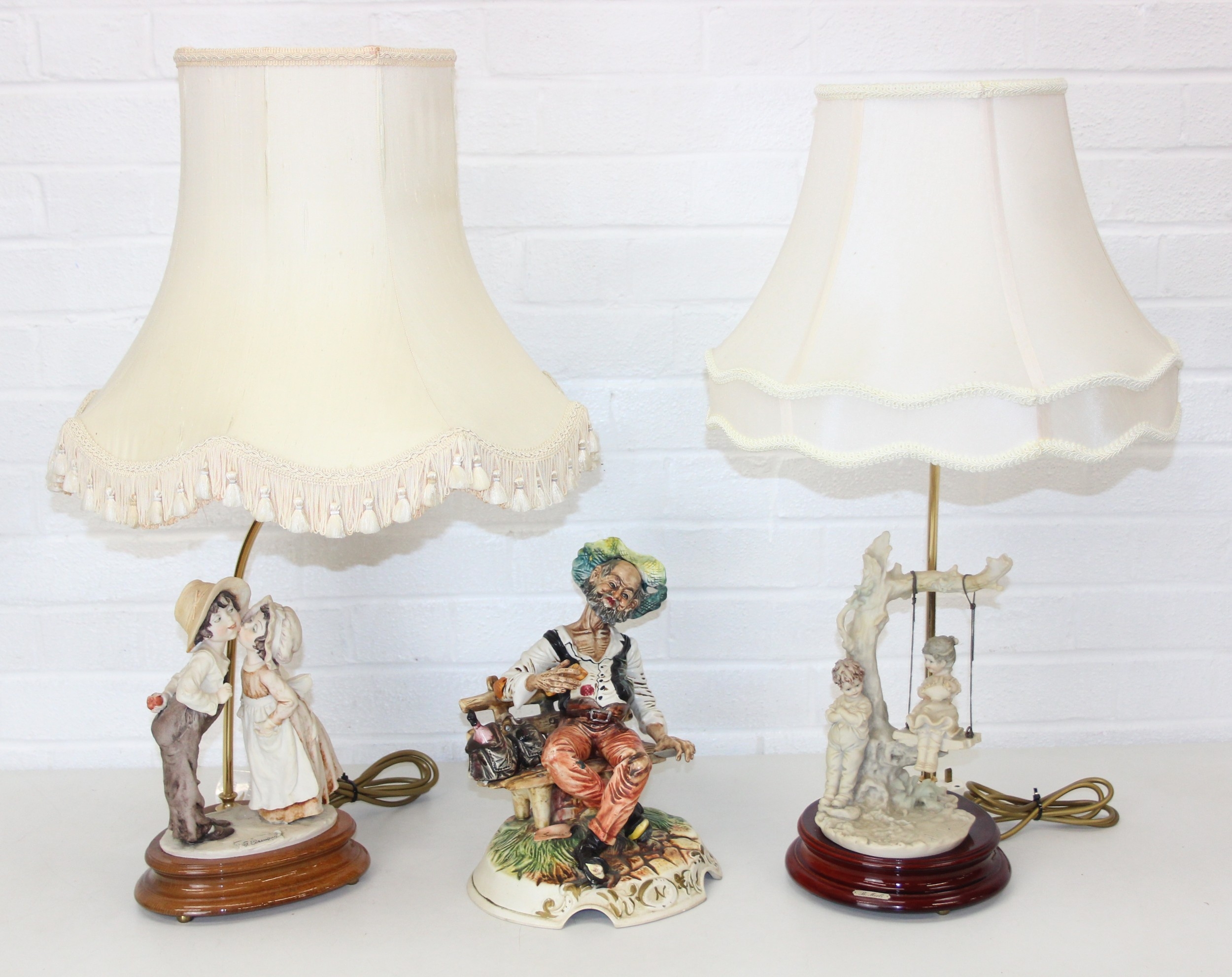 Two decorative figural table lamps with shades, one by B. Merti, the other Capodimonte and a Capodimonte pottery figure on bench, the largest lamp 80cm tall [3]