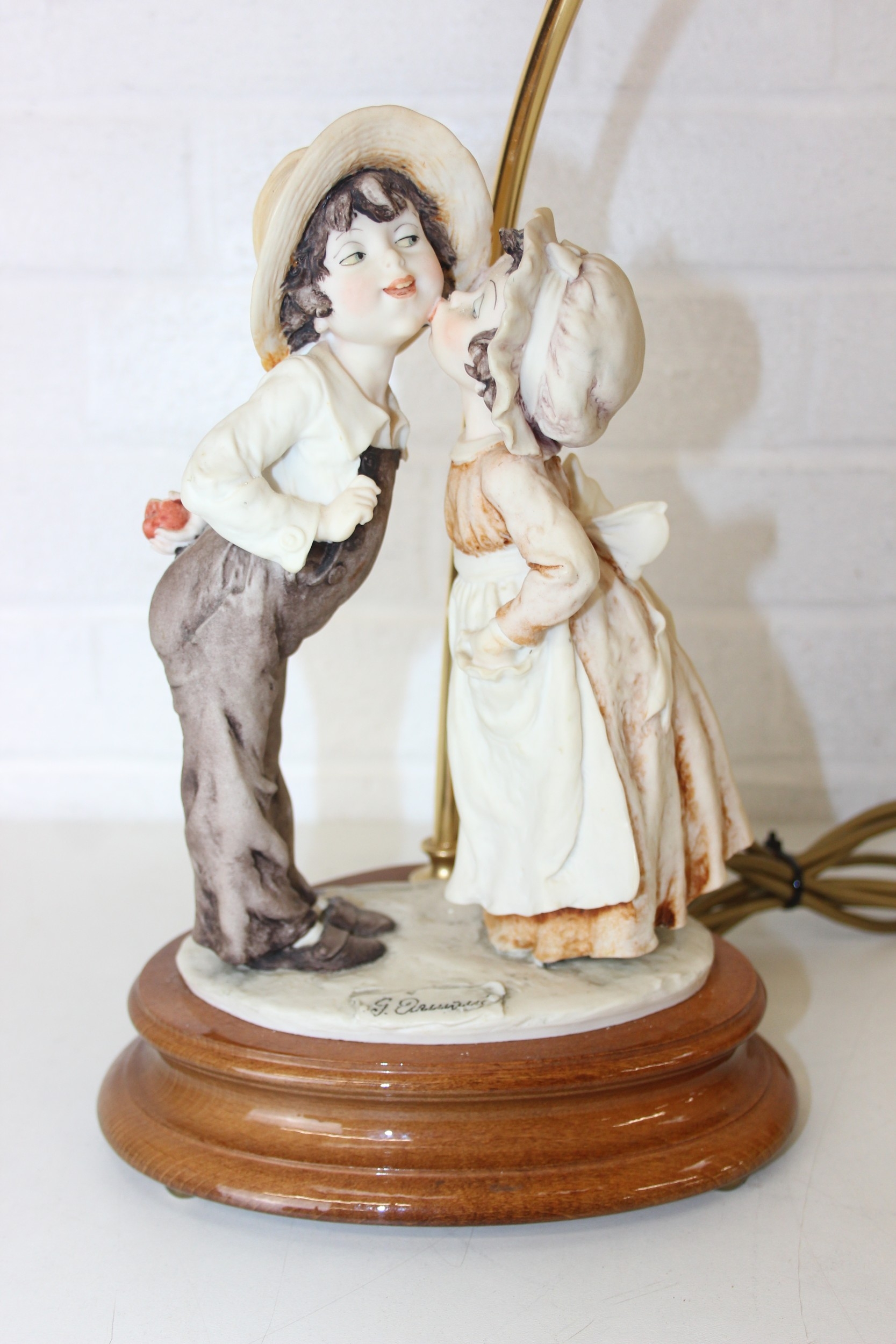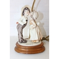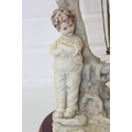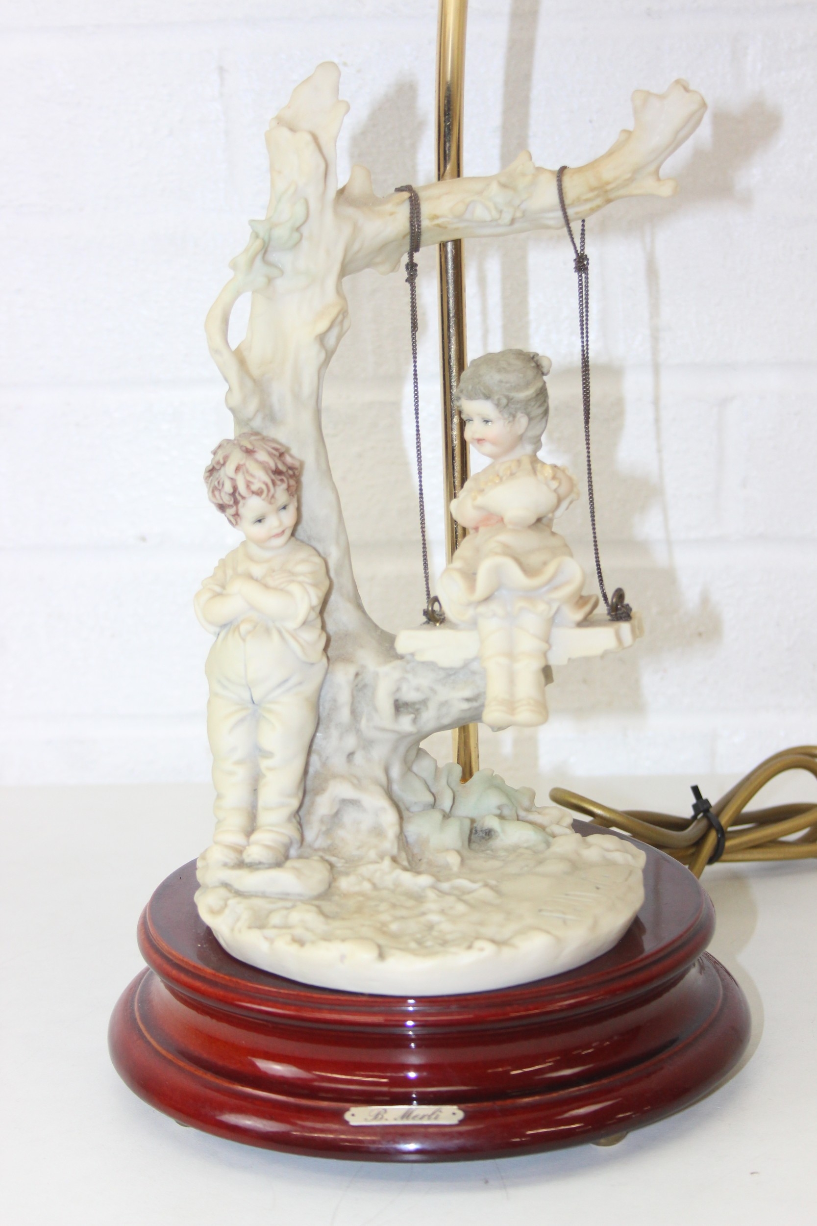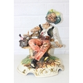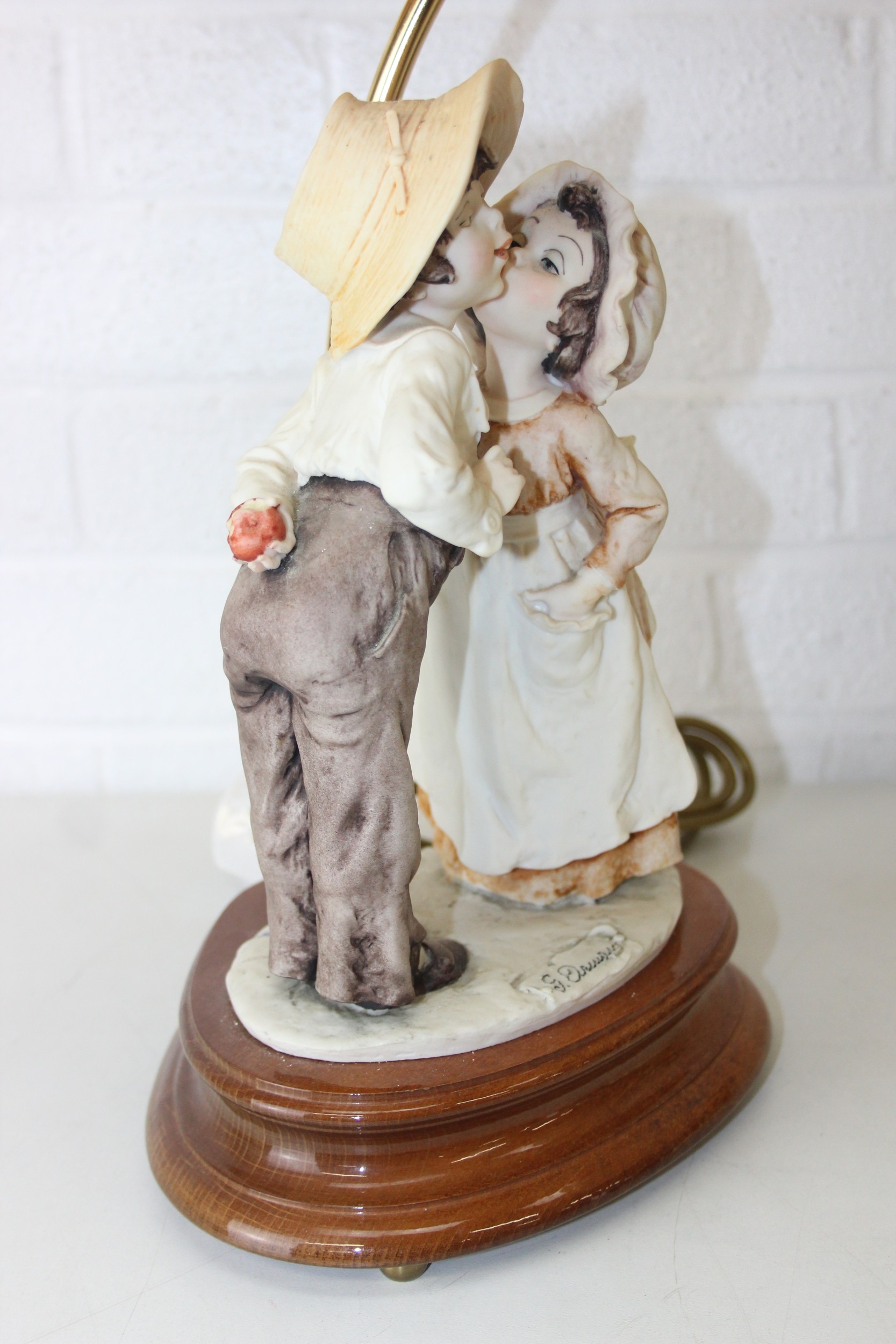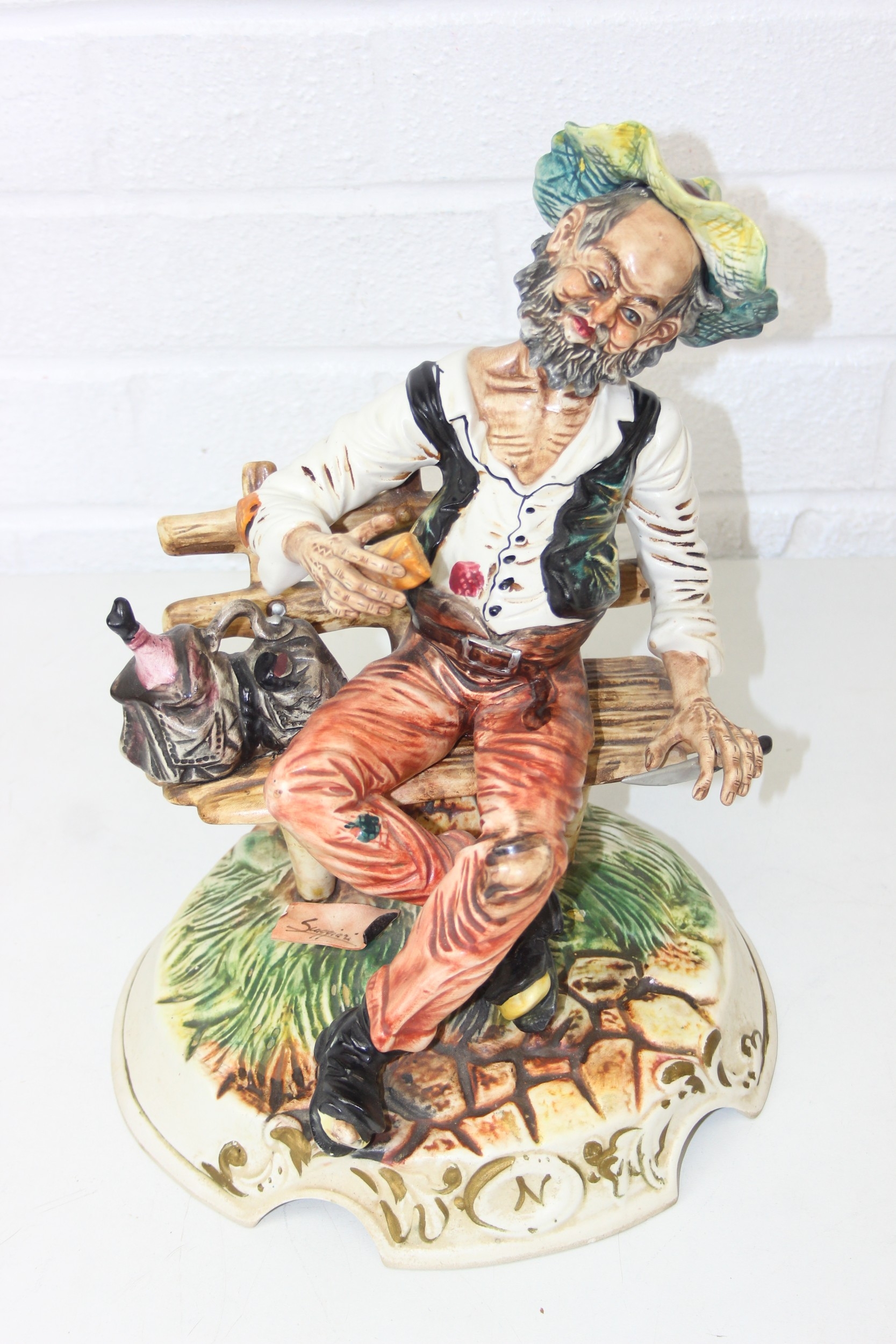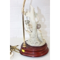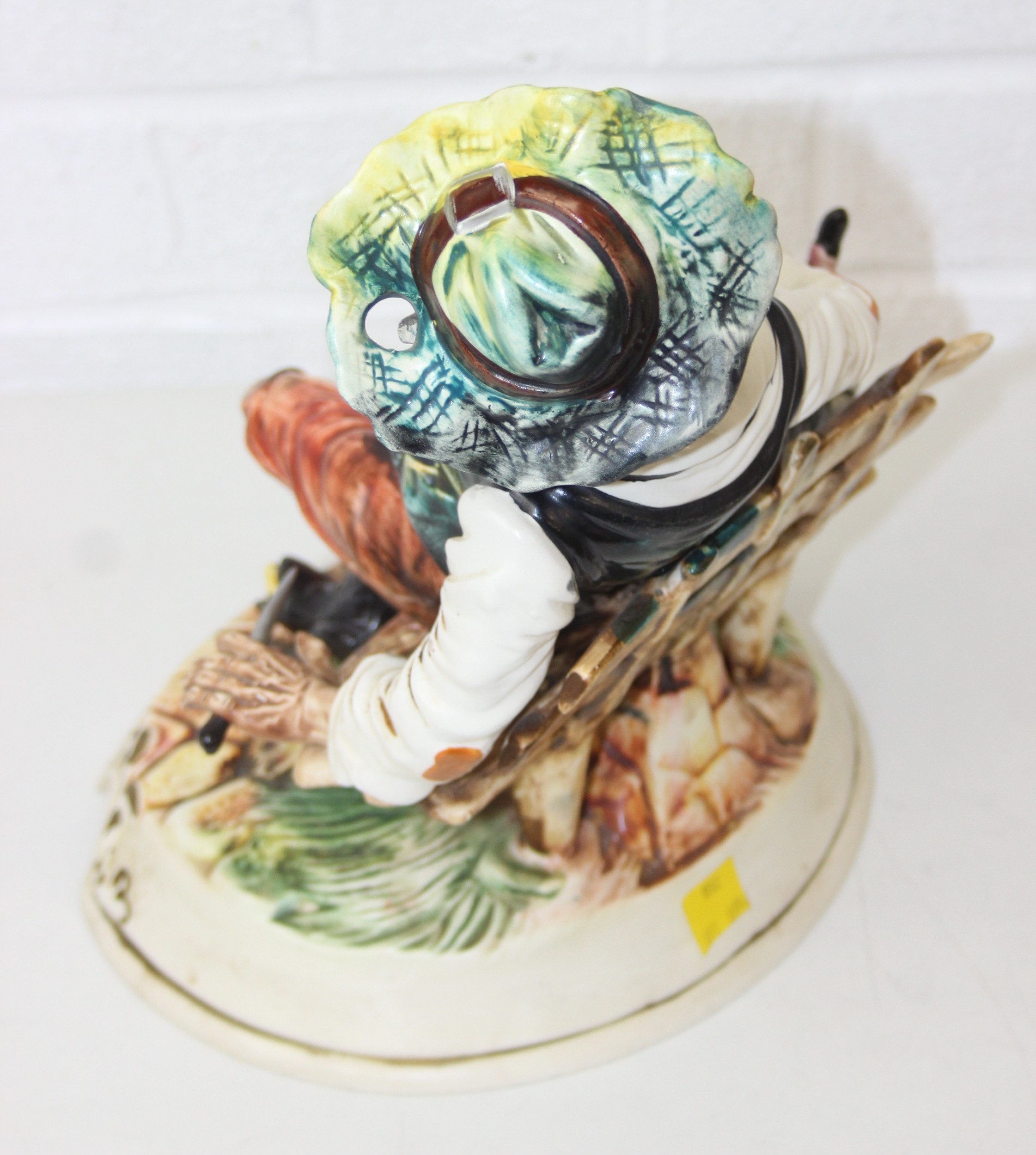 Two decorative figural table lamps with shades, one by B. Merti, the other Capodimonte and a Capodimonte pottery figure on bench, the largest lamp 80cm tall [3]