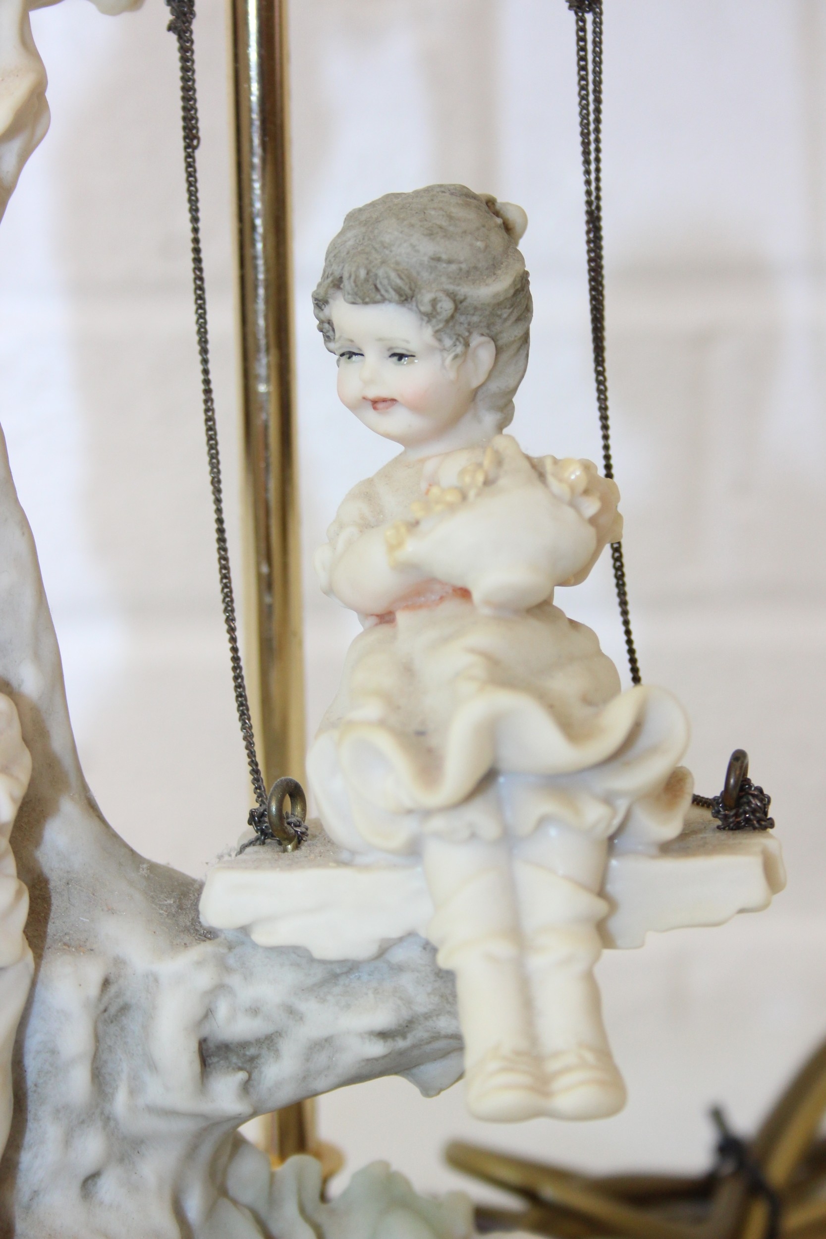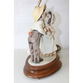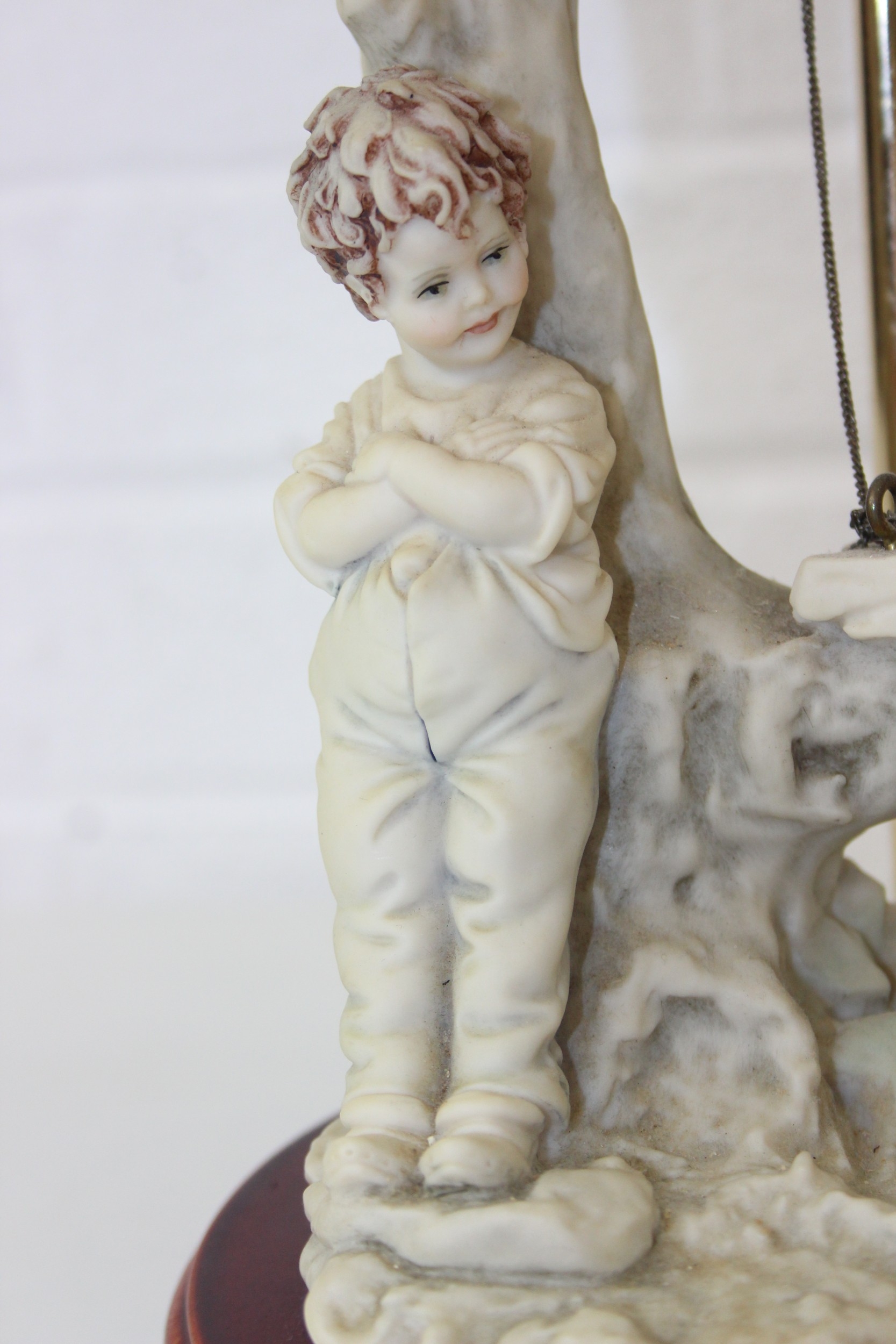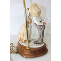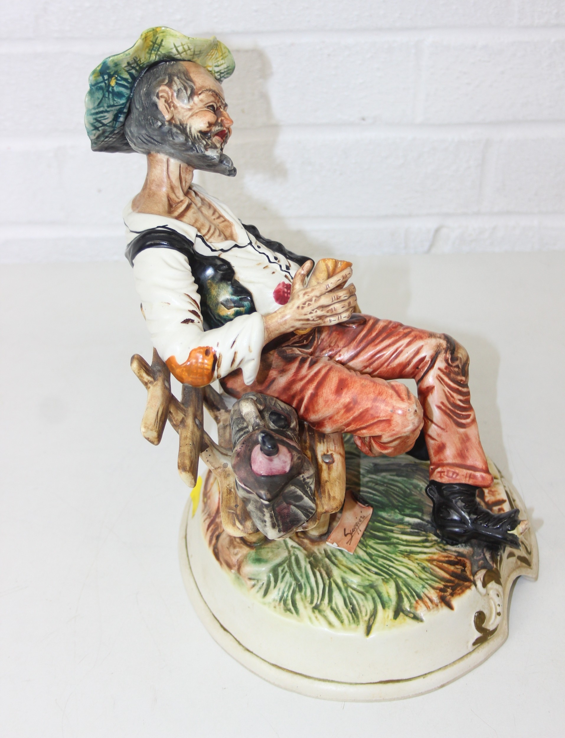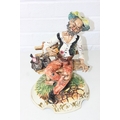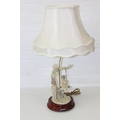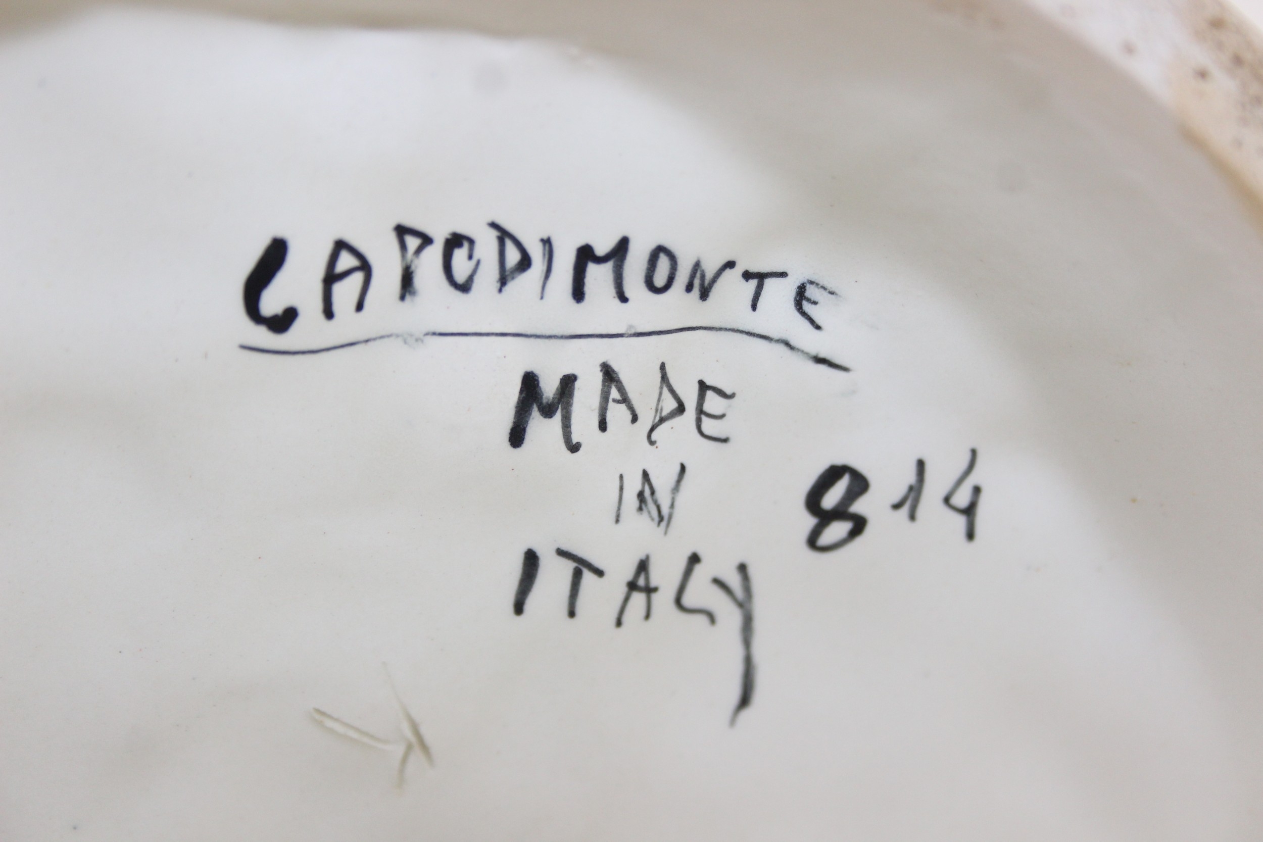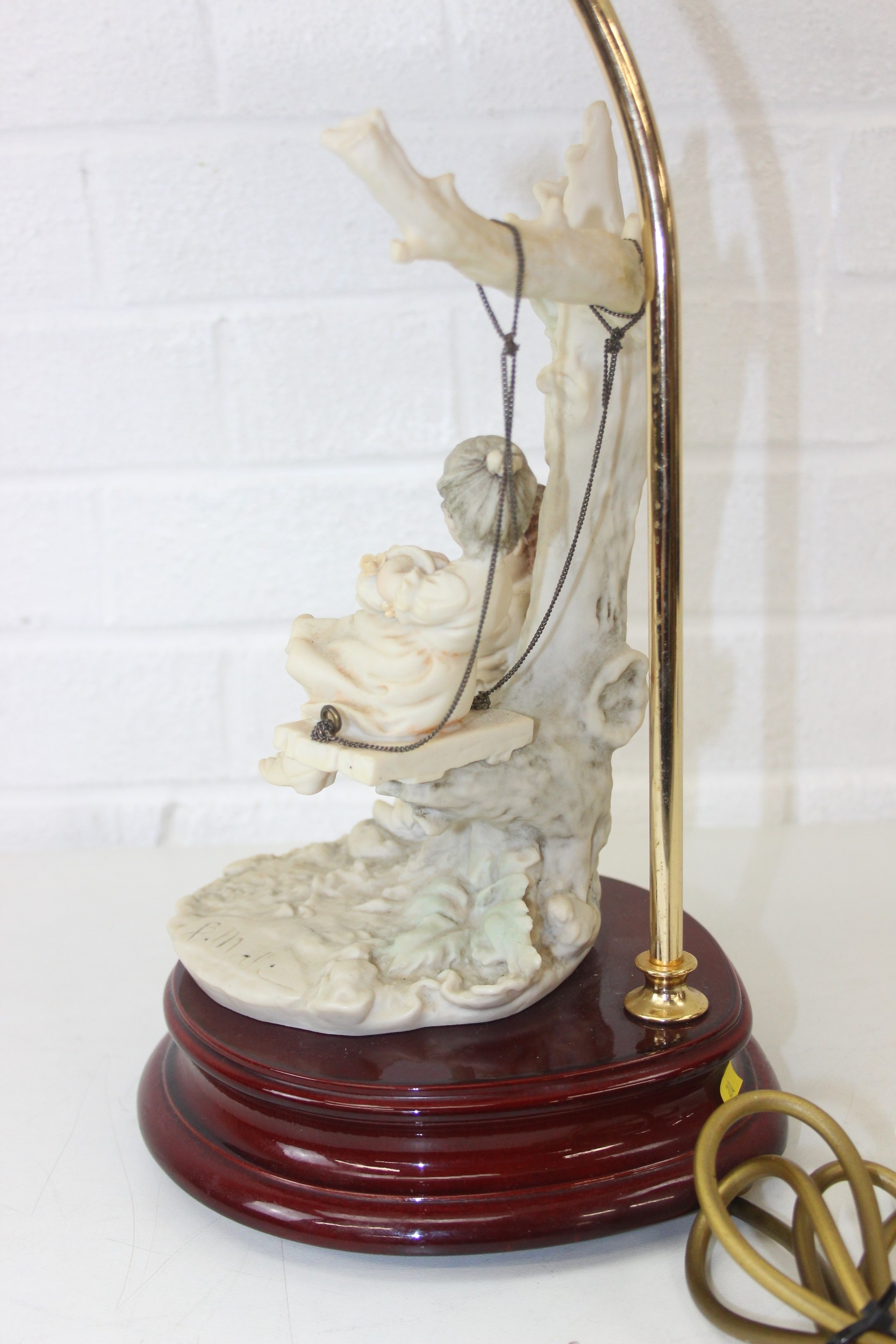 Two decorative figural table lamps with shades, one by B. Merti, the other Capodimonte and a Capodimonte pottery figure on bench, the largest lamp 80cm tall [3]