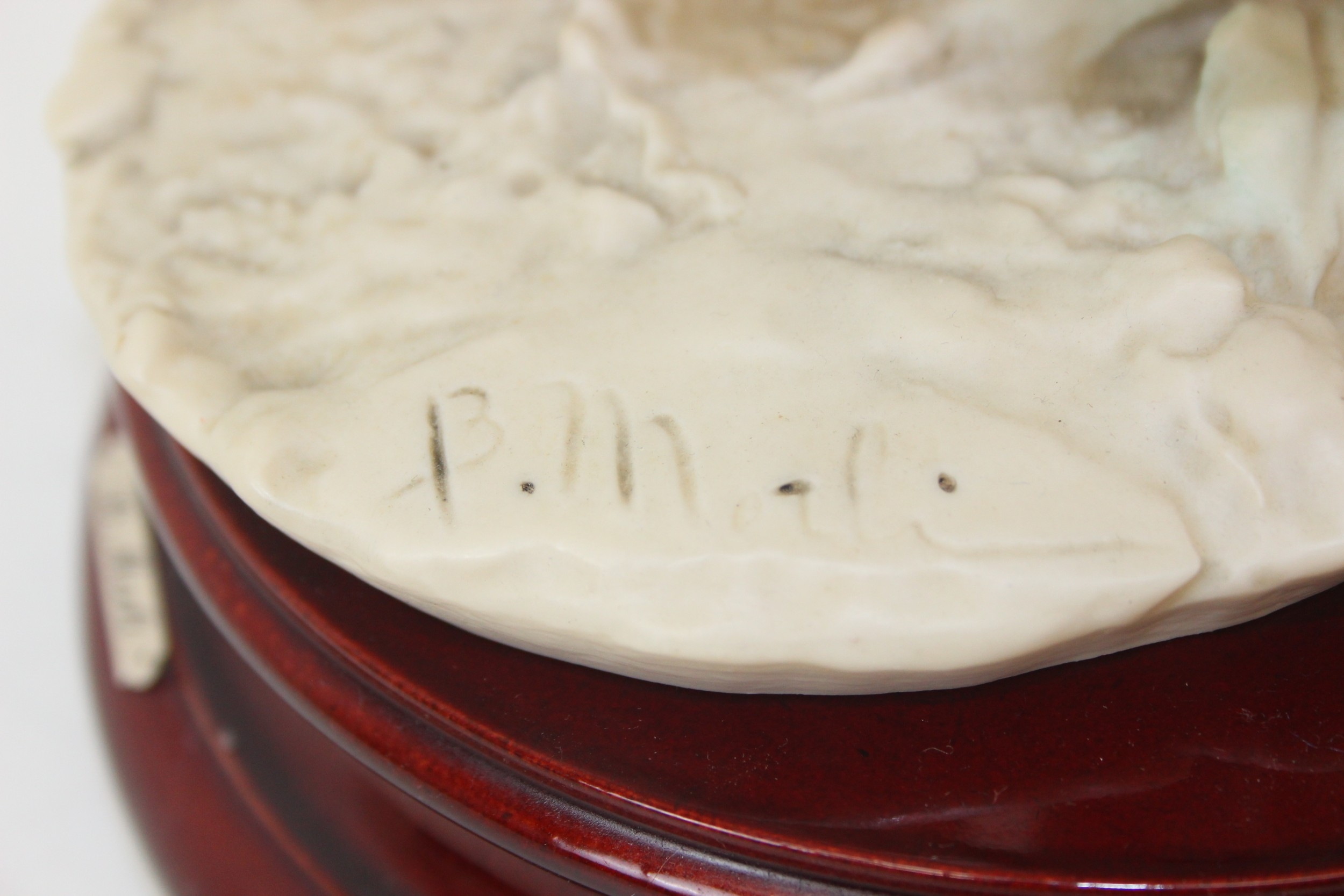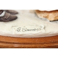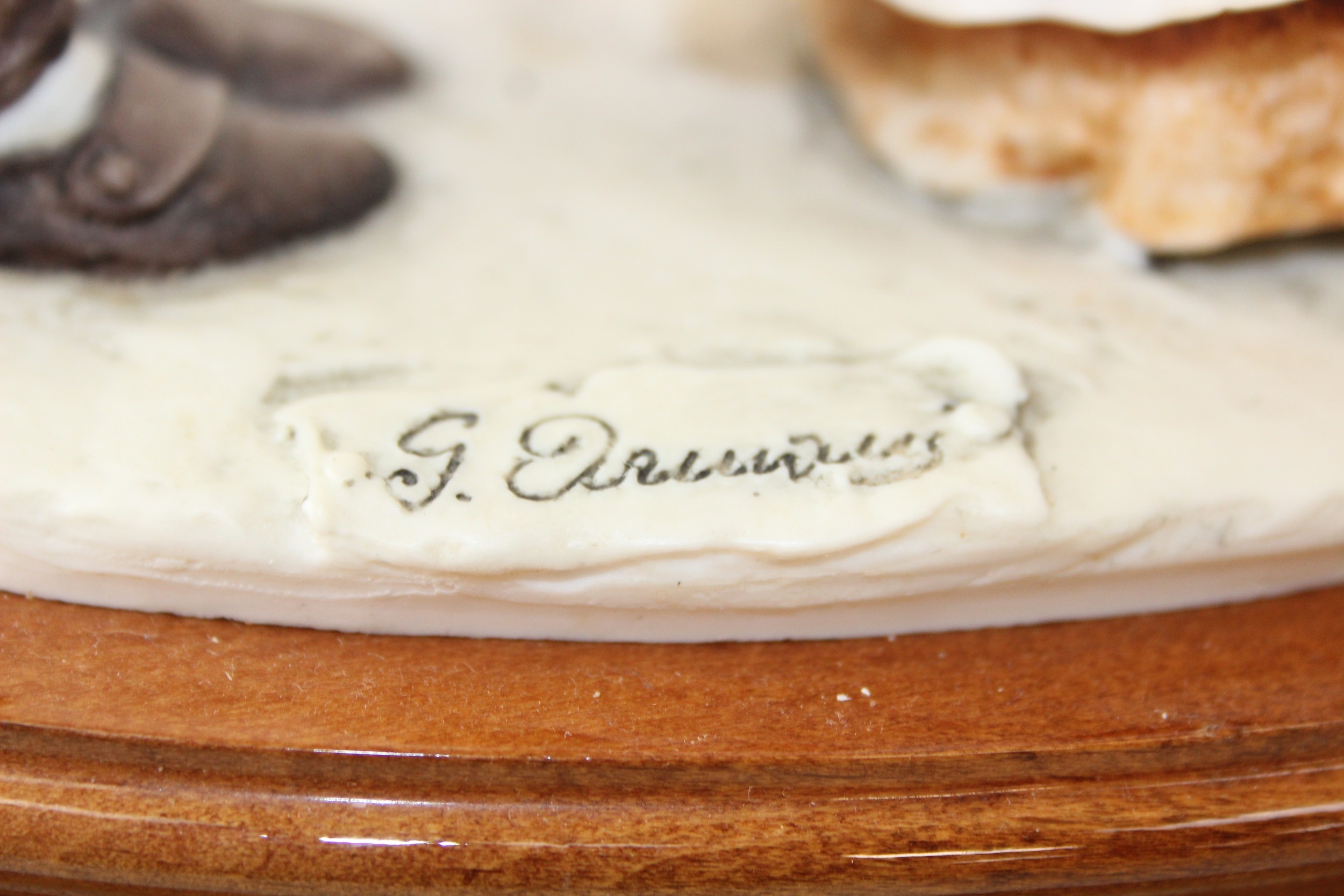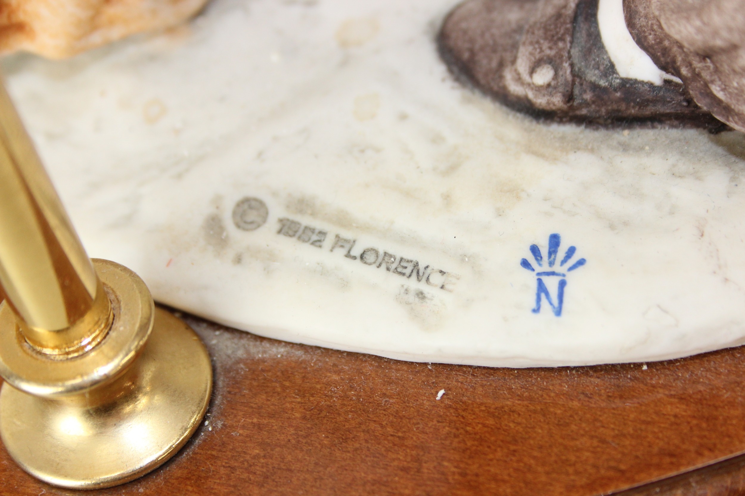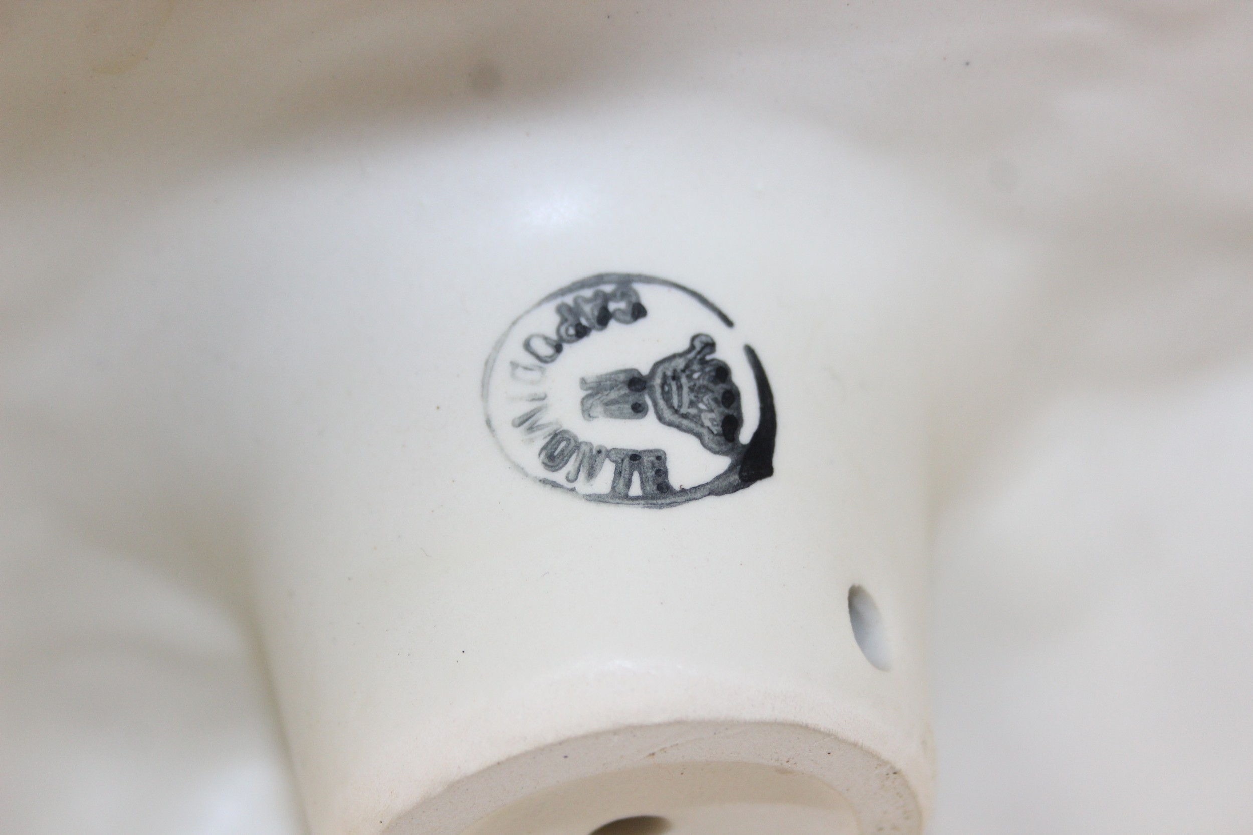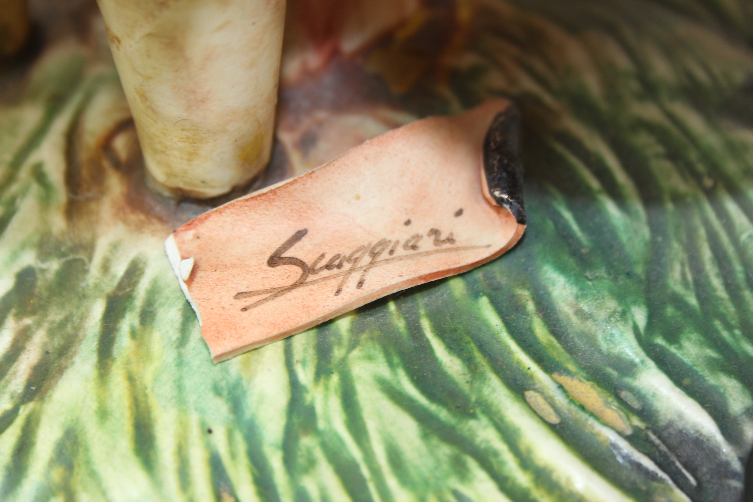 Two decorative figural table lamps with shades, one by B. Merti, the other Capodimonte and a Capodimonte pottery figure on bench, the largest lamp 80cm tall [3]