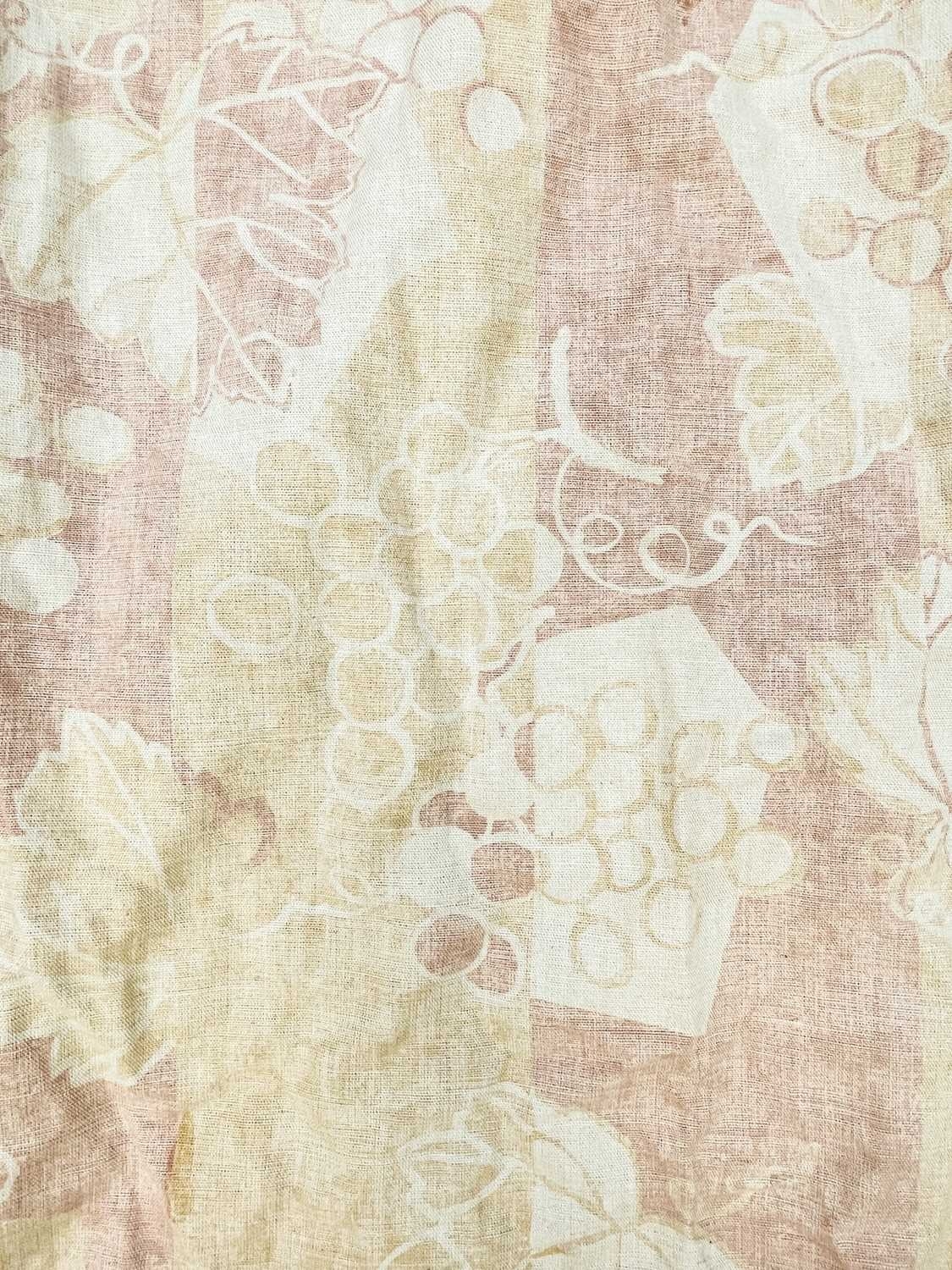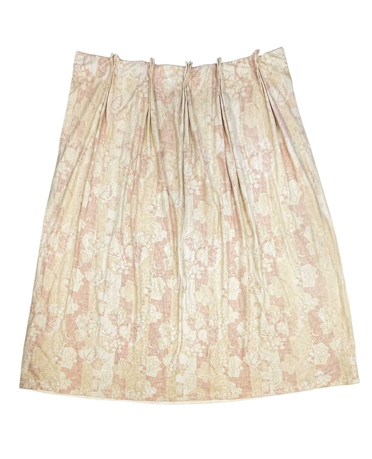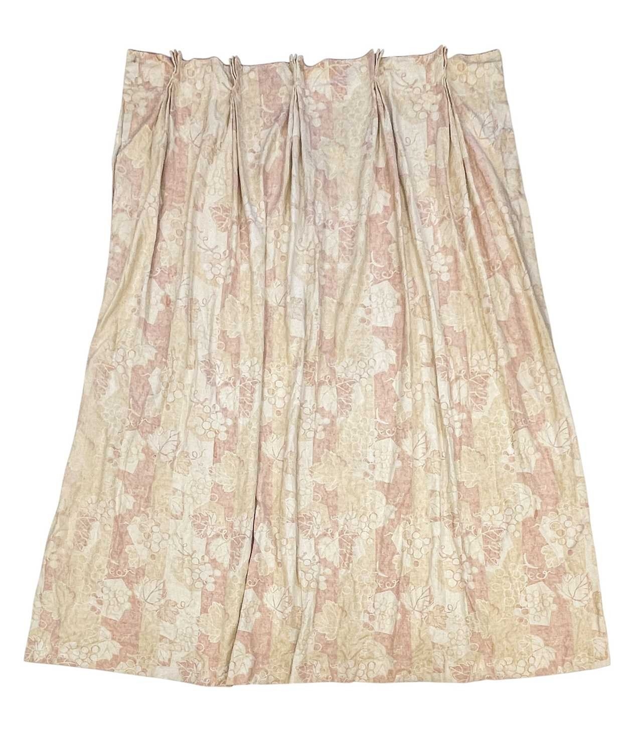 A pair of linen curtains. Patterned with fruiting vine leaves in pink and beige, pleat top with cotton lining and decorative twisted binding to the tops, width 145cm and length 240cm. Each curtain has a fixed pleat header of 140cm, so total width of 280cm. They have a couple of noticeable marks (see photos) but no serious staining. They would benefit from freshening up, but could easily be washed as not interlined.