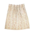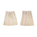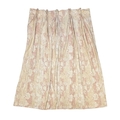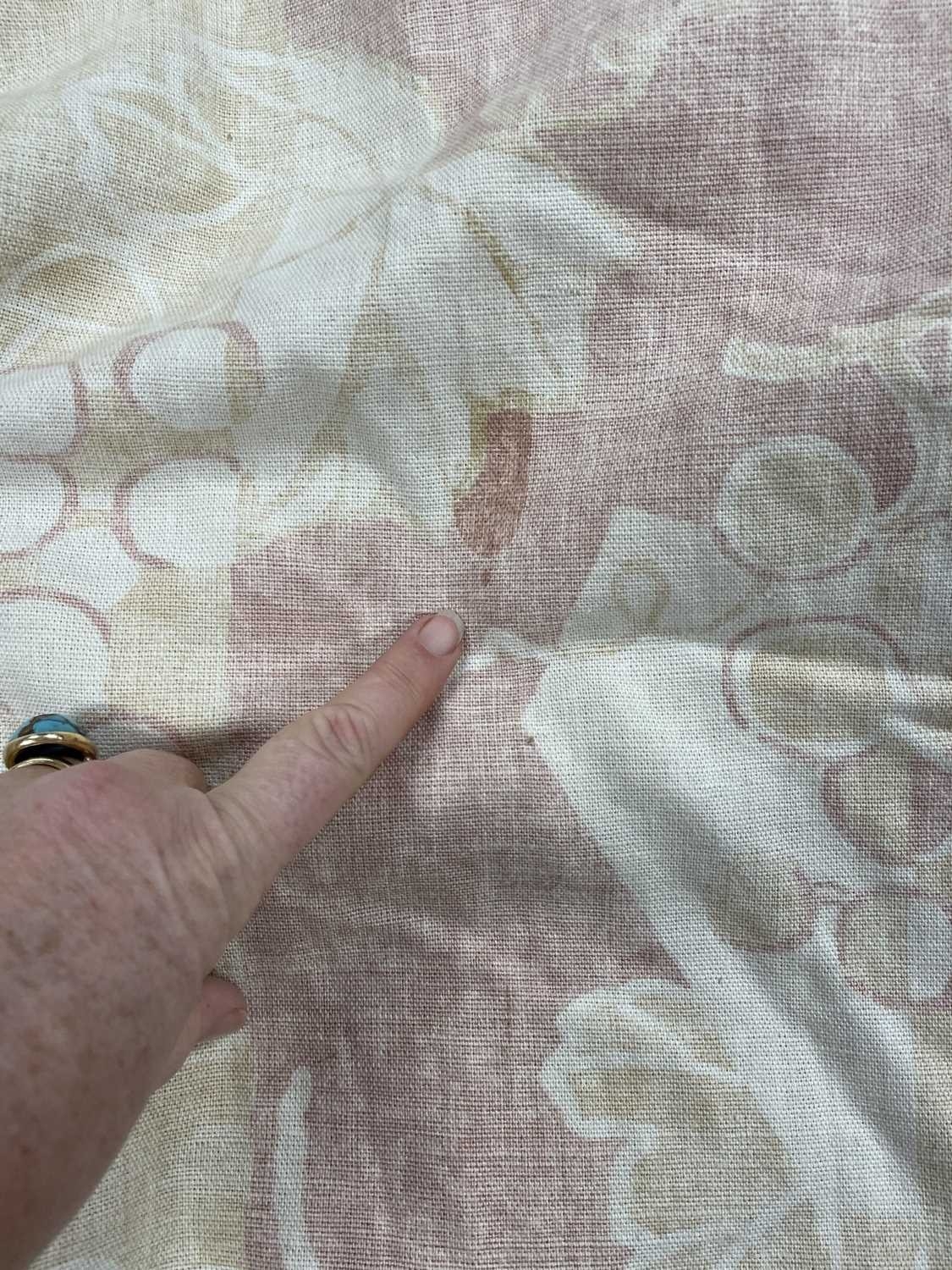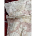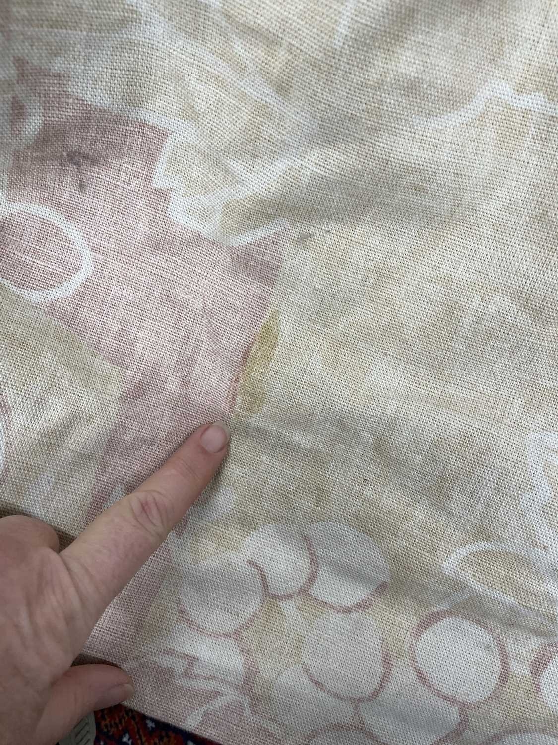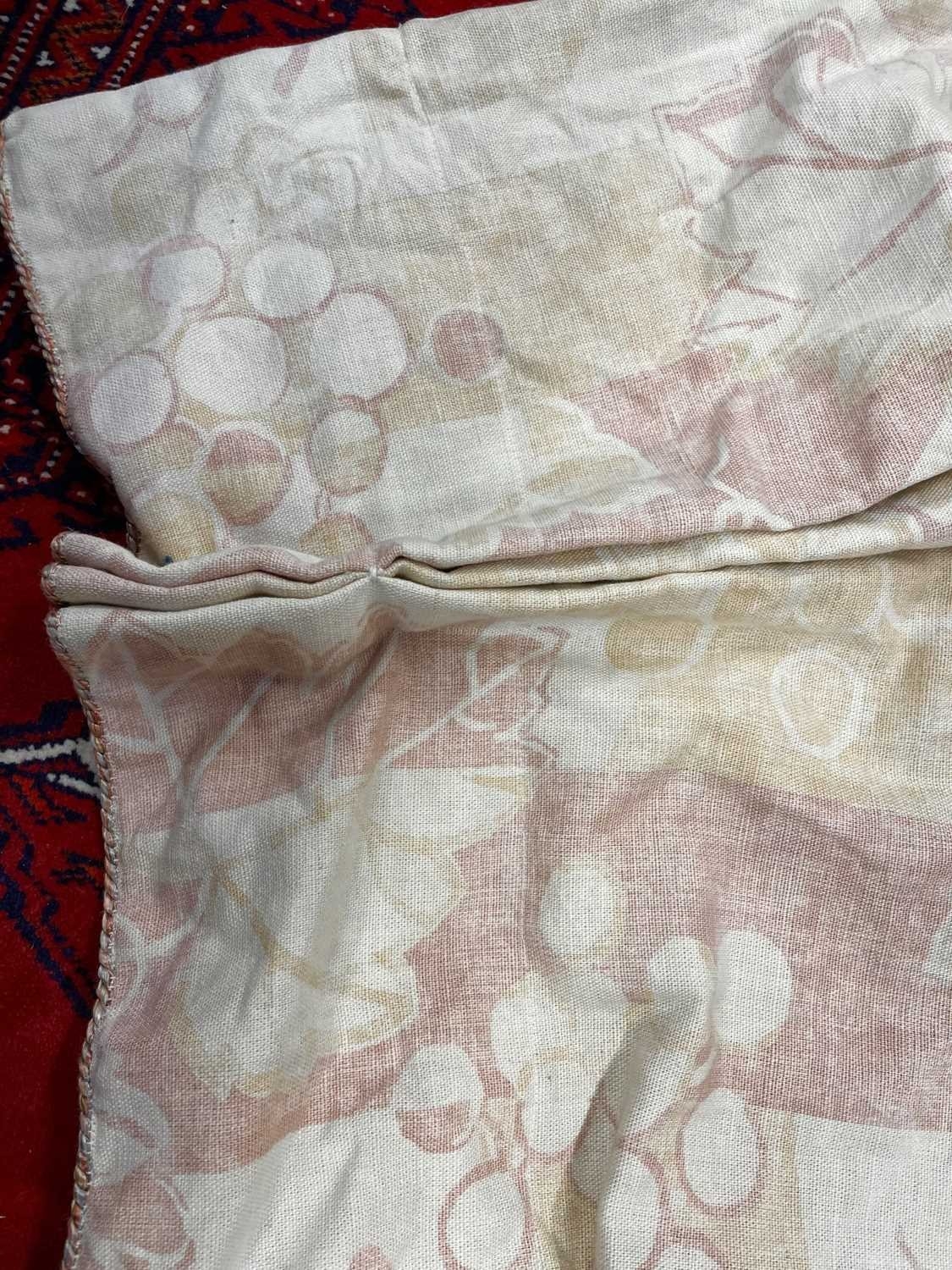 A pair of linen curtains. Patterned with fruiting vine leaves in pink and beige, pleat top with cotton lining and decorative twisted binding to the tops, width 145cm and length 240cm. Each curtain has a fixed pleat header of 140cm, so total width of 280cm. They have a couple of noticeable marks (see photos) but no serious staining. They would benefit from freshening up, but could easily be washed as not interlined.