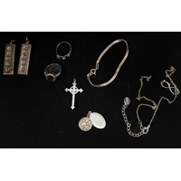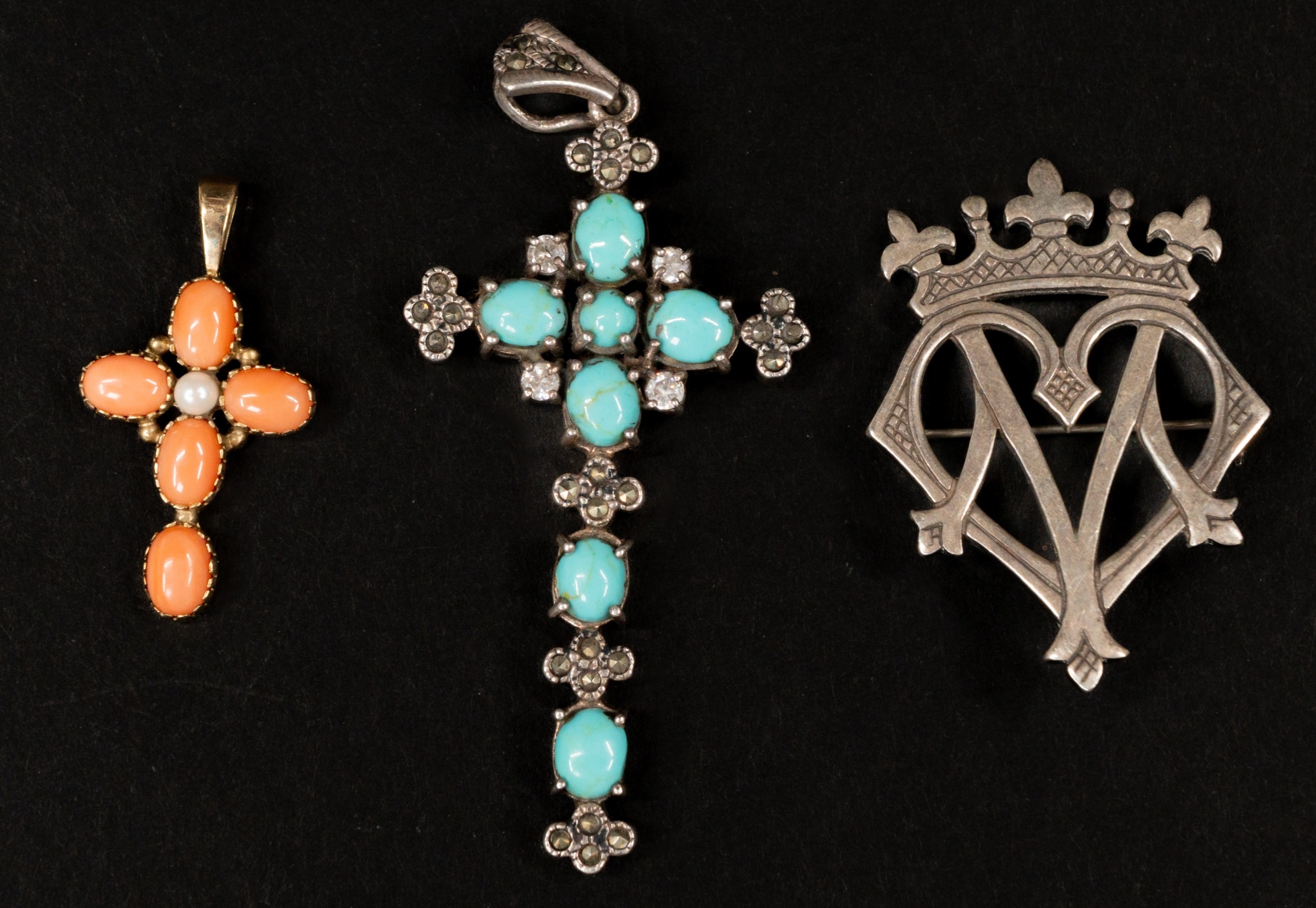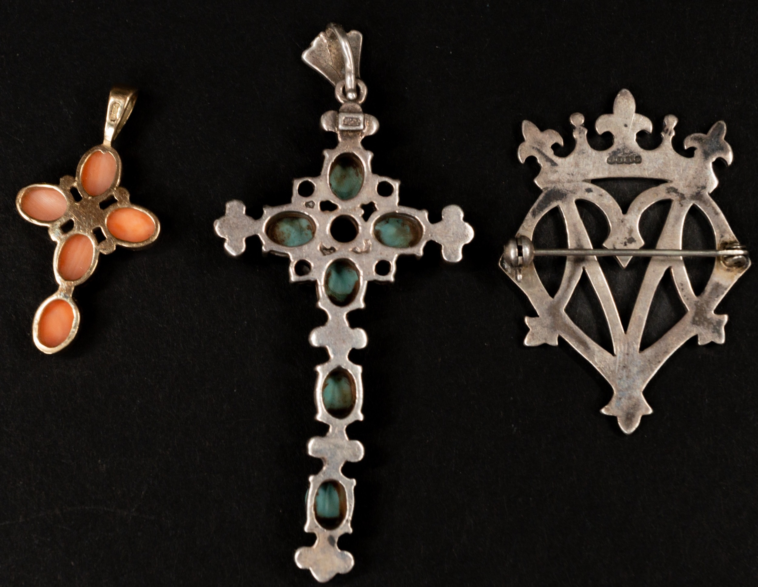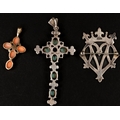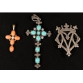 Jewellery: 9ct gold cross set with four oval coral and a single pearl, 3.1g; a silver cross set with seven tourmaline and white stones, and a silver brooch in the form of a stylised heart and crown, weight of (2) 26g.