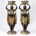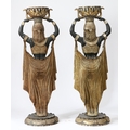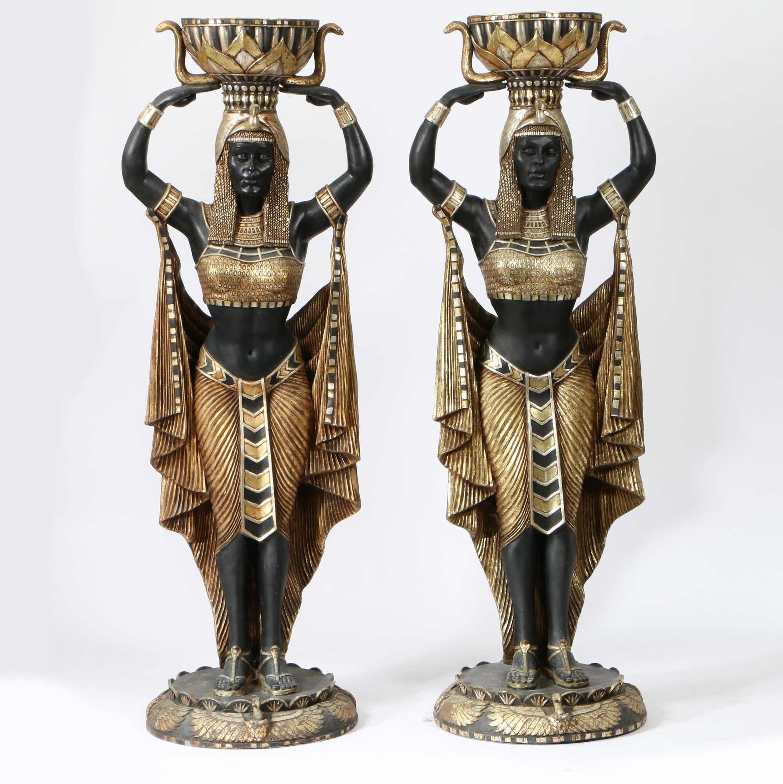 A PAIR OF FLOOR STANDING PLANTERS MODELLED AS CLEOPATRA'S EGYPTIAN NUBIAN MAIDENS. life size resin figures in black and gold, 186cm high (2).