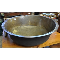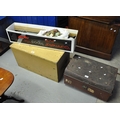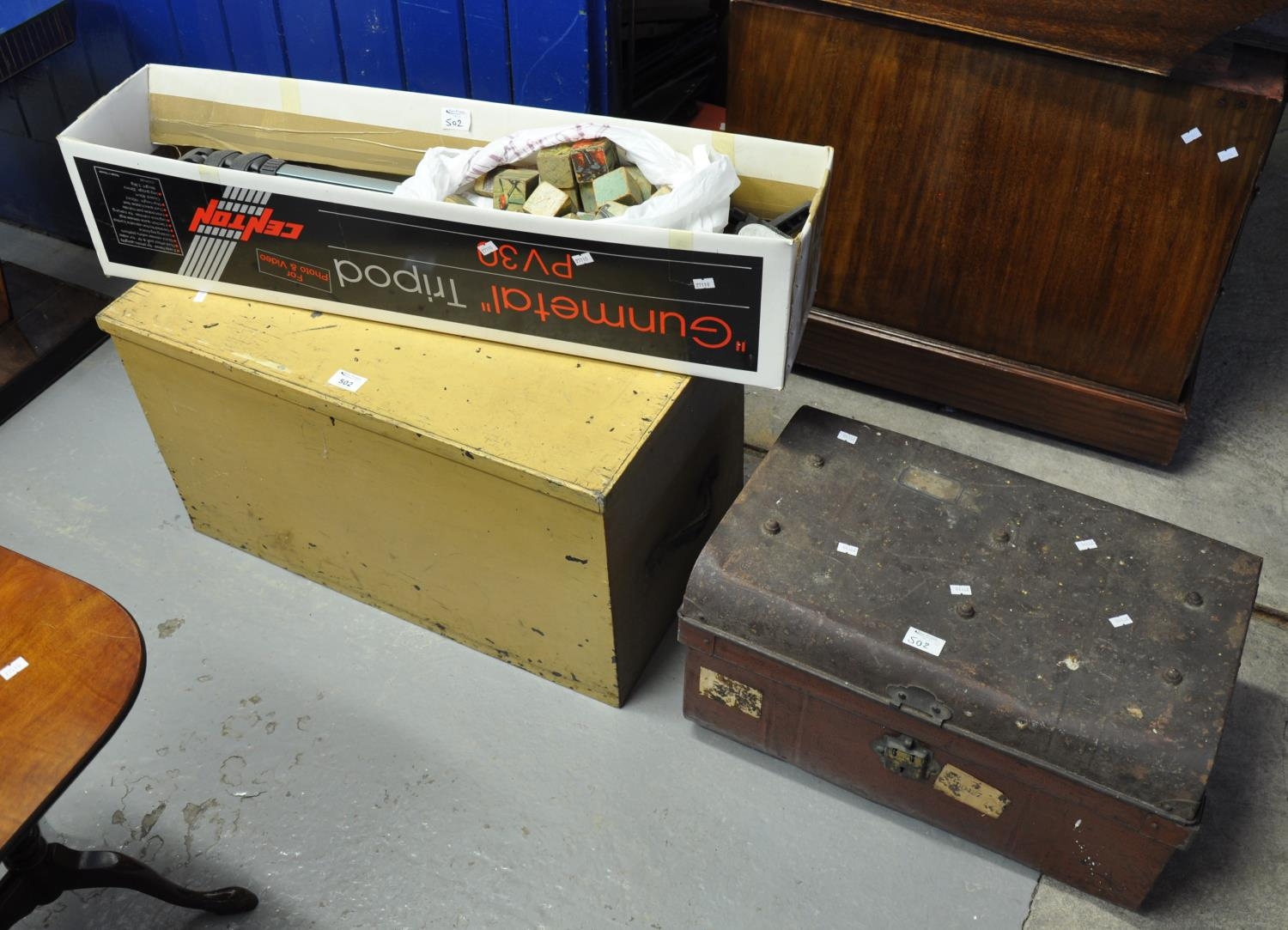 Modern Centon camera tripod, together with a painted pine trunk and a small vintage tin trunk. (3)