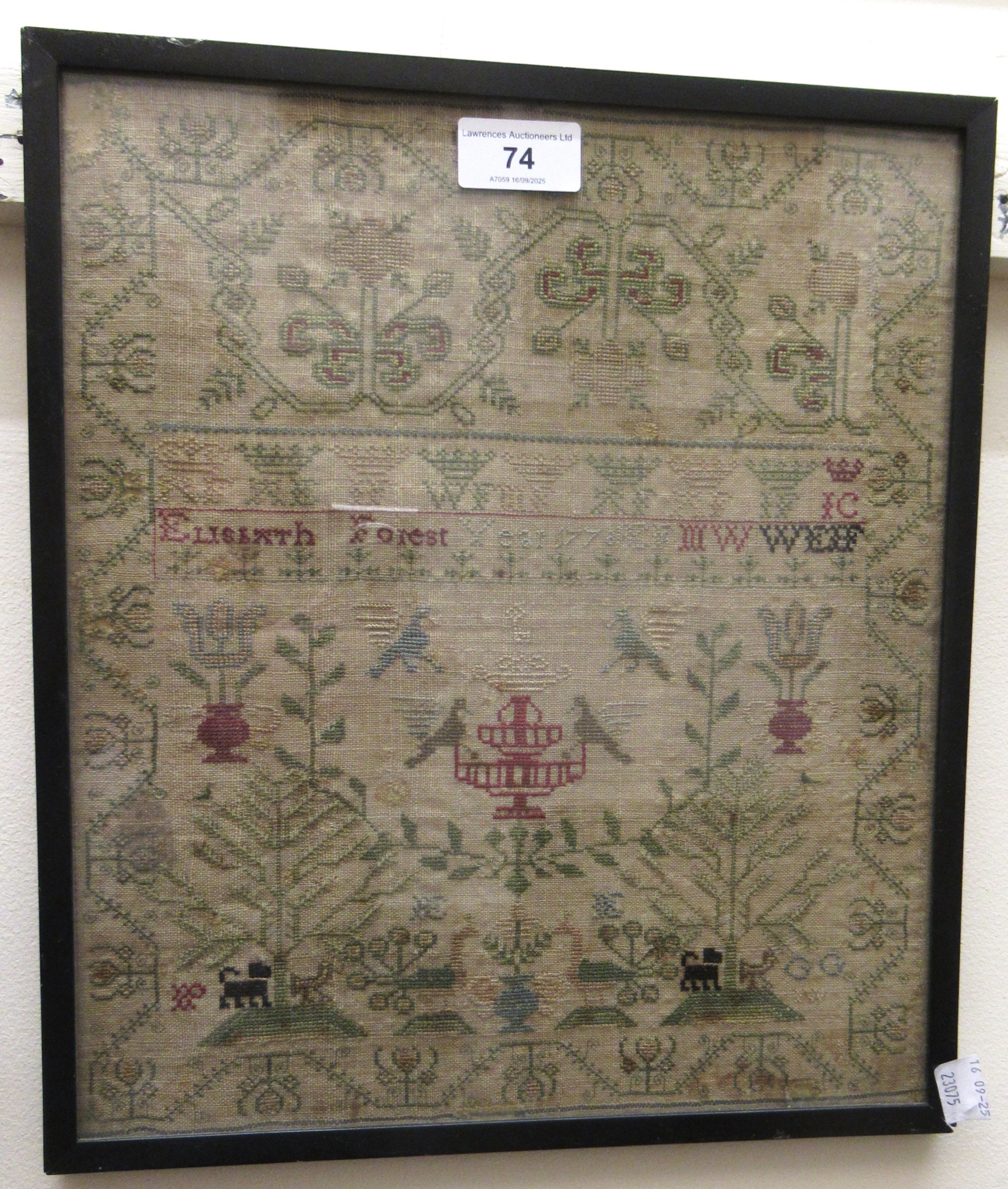 18th Century pictorial sampler by Elisbeth Forest, dated 1778, 32 x 28cm