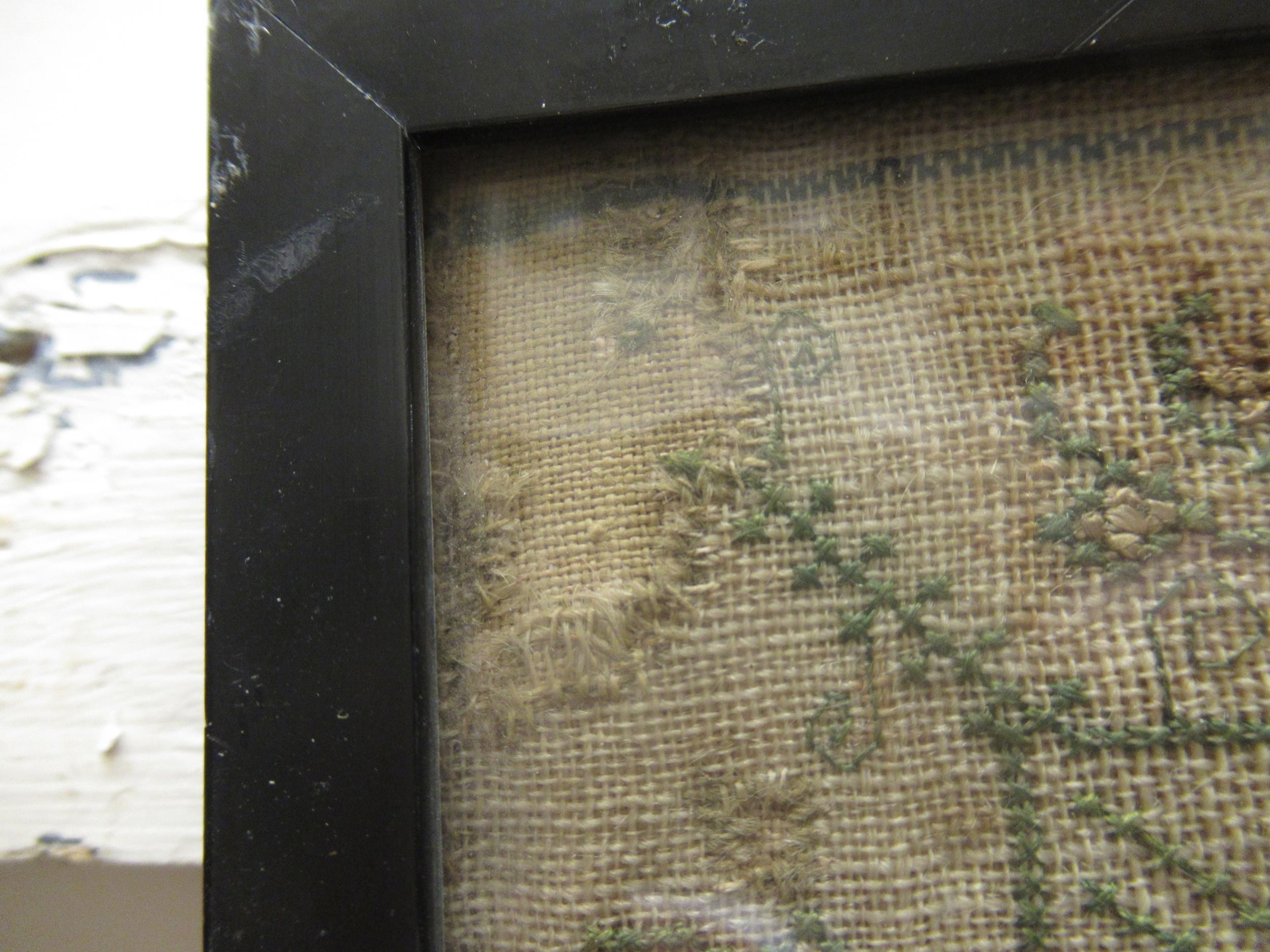 Repair to top left corner. Linen is brown in colour with some spot stains and colours a little faded/dull. Otherwise in original condition.