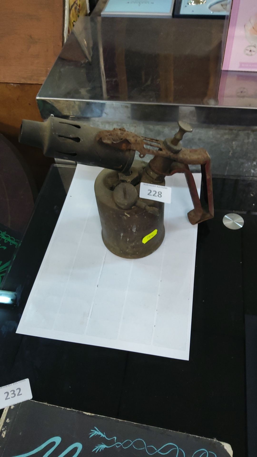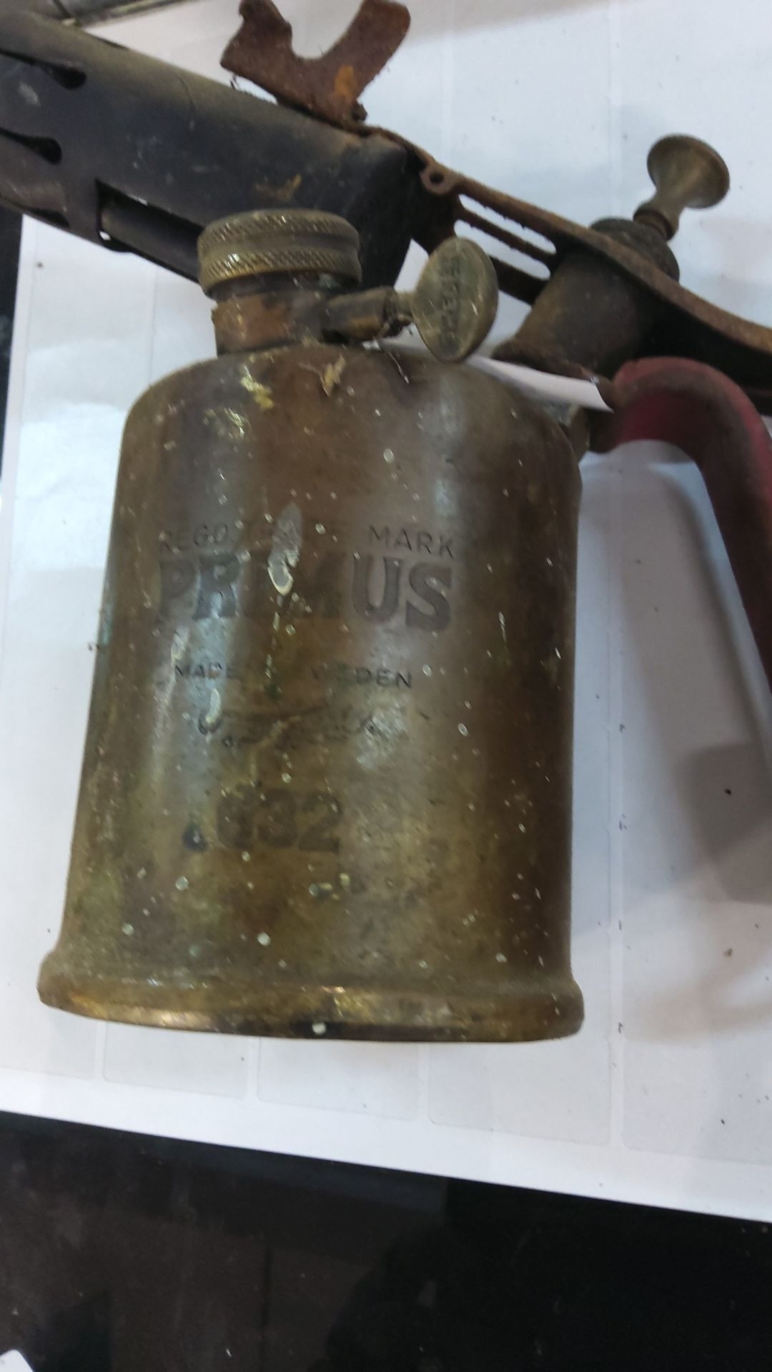 Vintage Primus blowtorch, made in Sweden, brass with iron handle, from the mid-20th century.