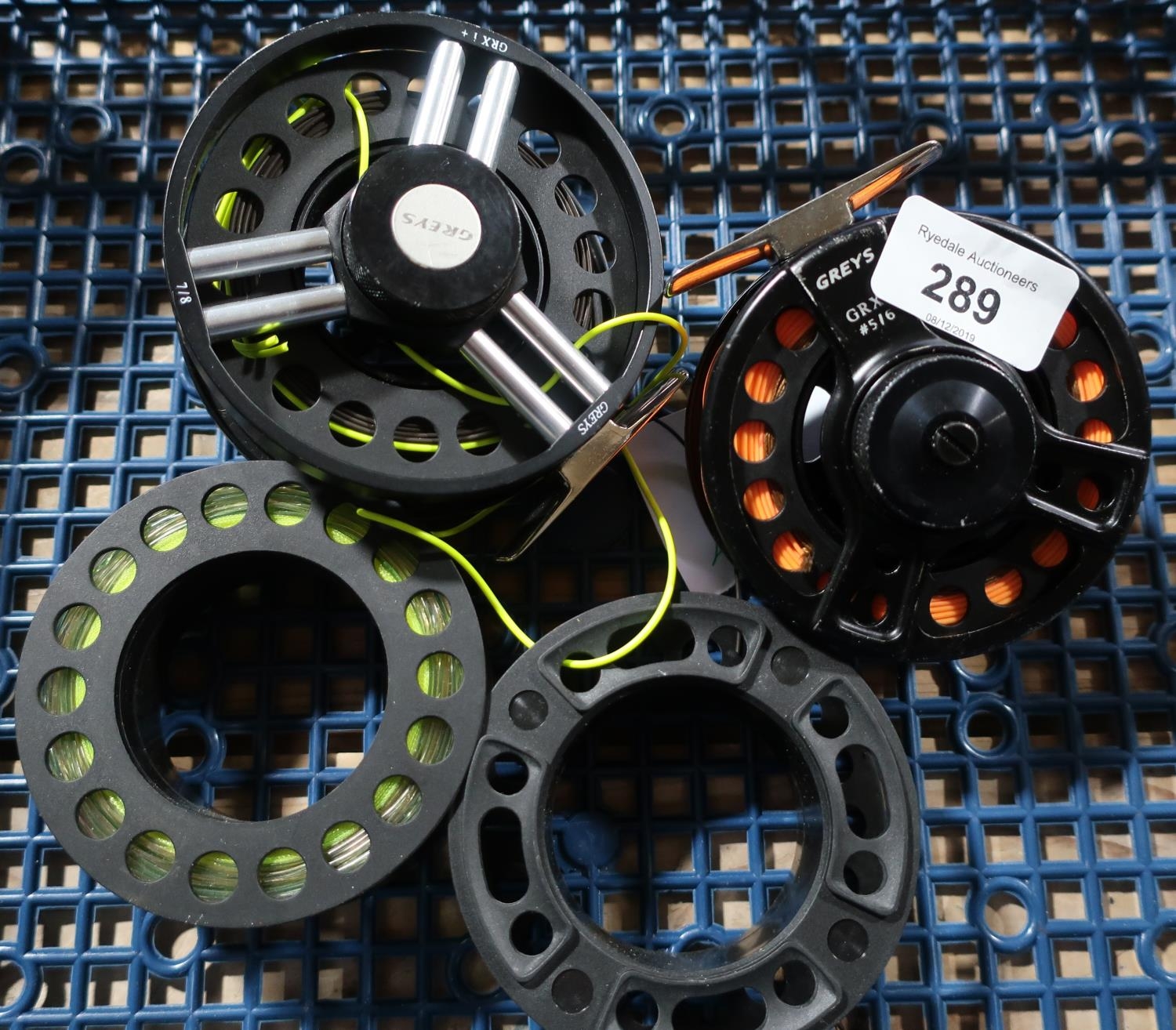 A Graze salmon reel with two spare spools and a Greys GRXI#516