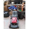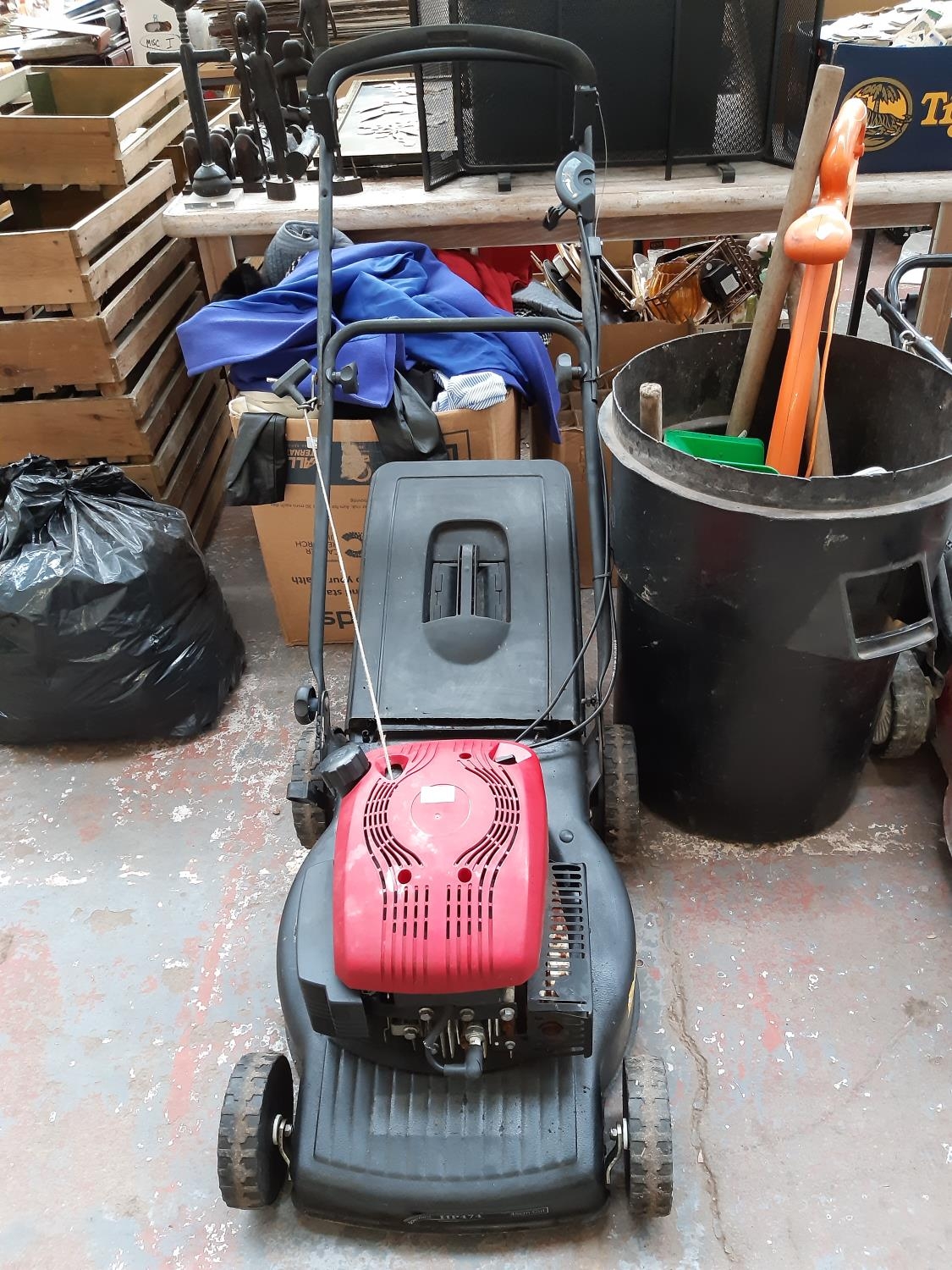 A BLACK AND RED MOUNTFIELD HP474 PETROL LAWN MOWER WITH GRASS COLLECTOR