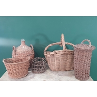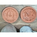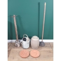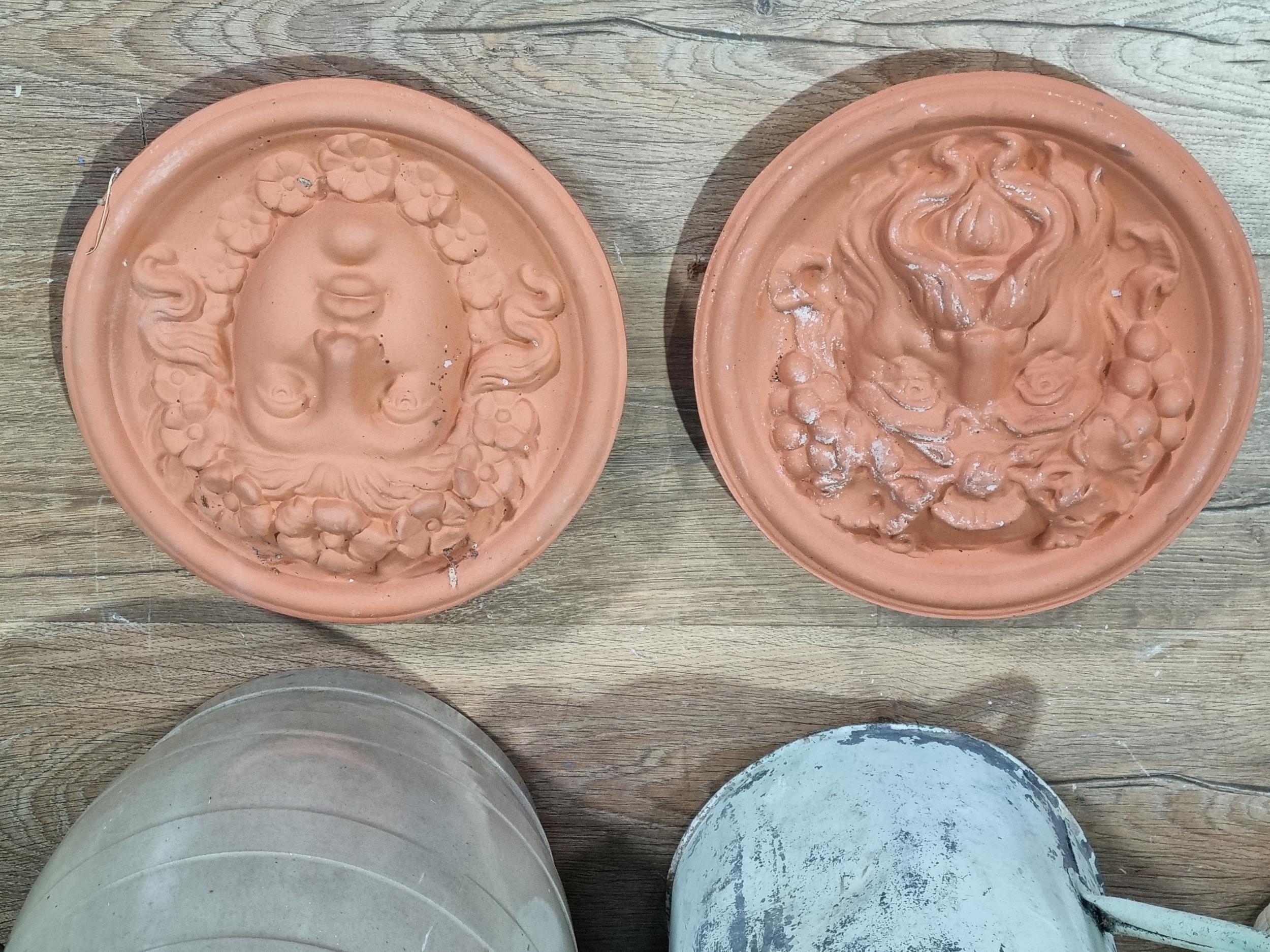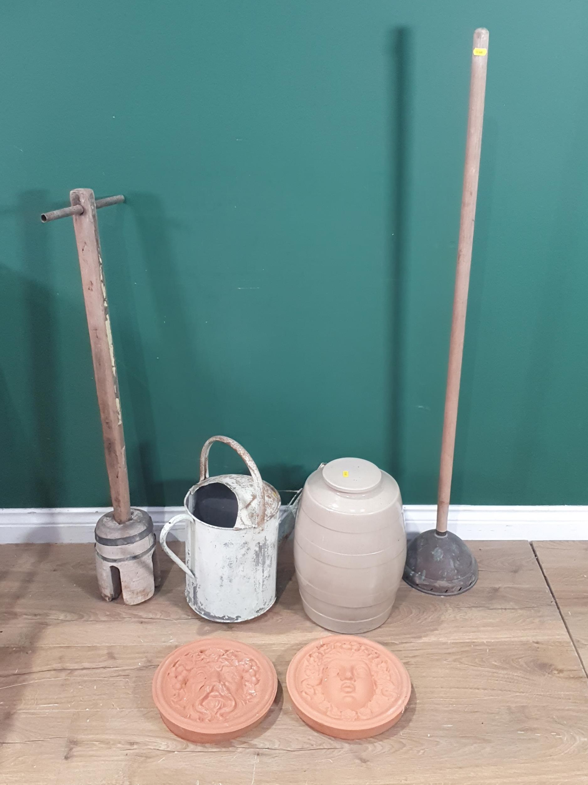 A pair of terracotta relief Plaques, a stoneware Barrel, two Washing Dollies and a metal watering can (Outside)