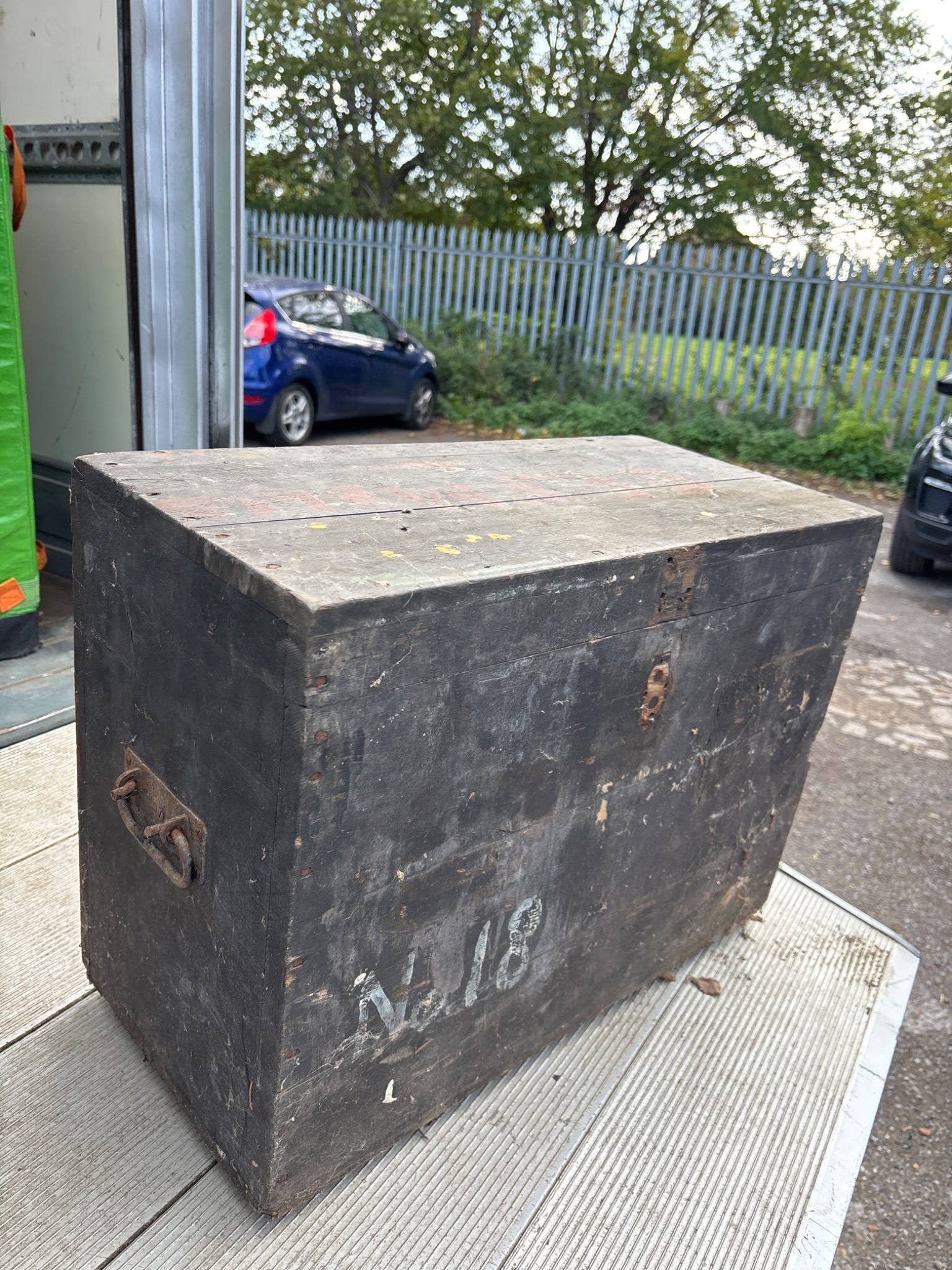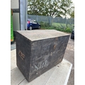 Black wooden storage chest with side handles and visible wear not postable.