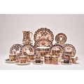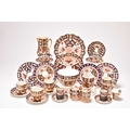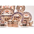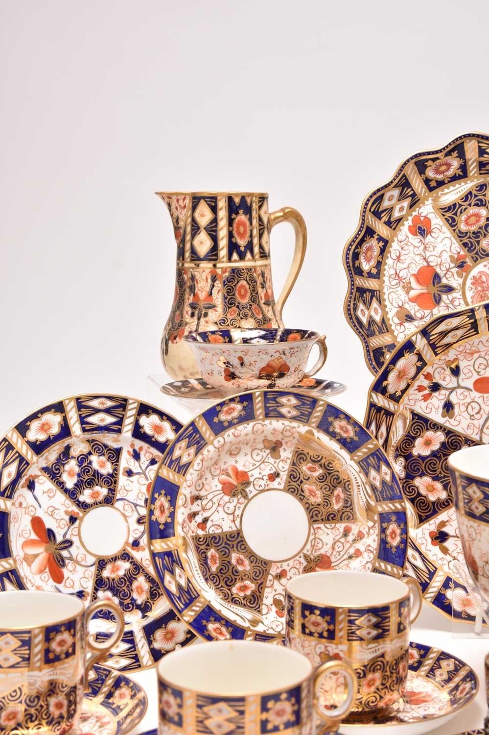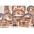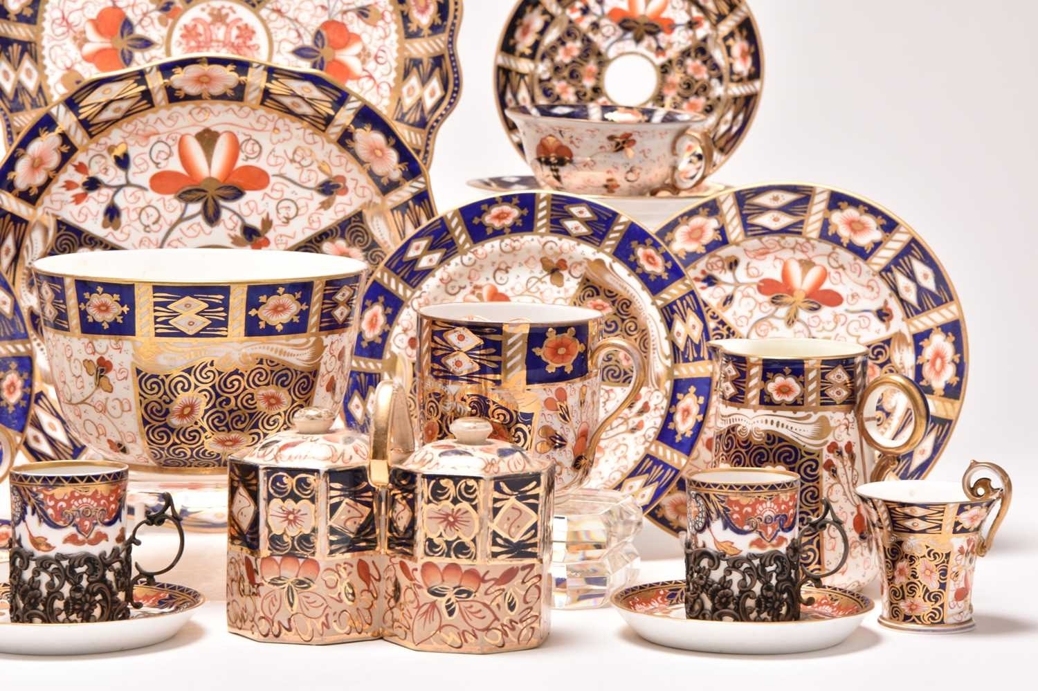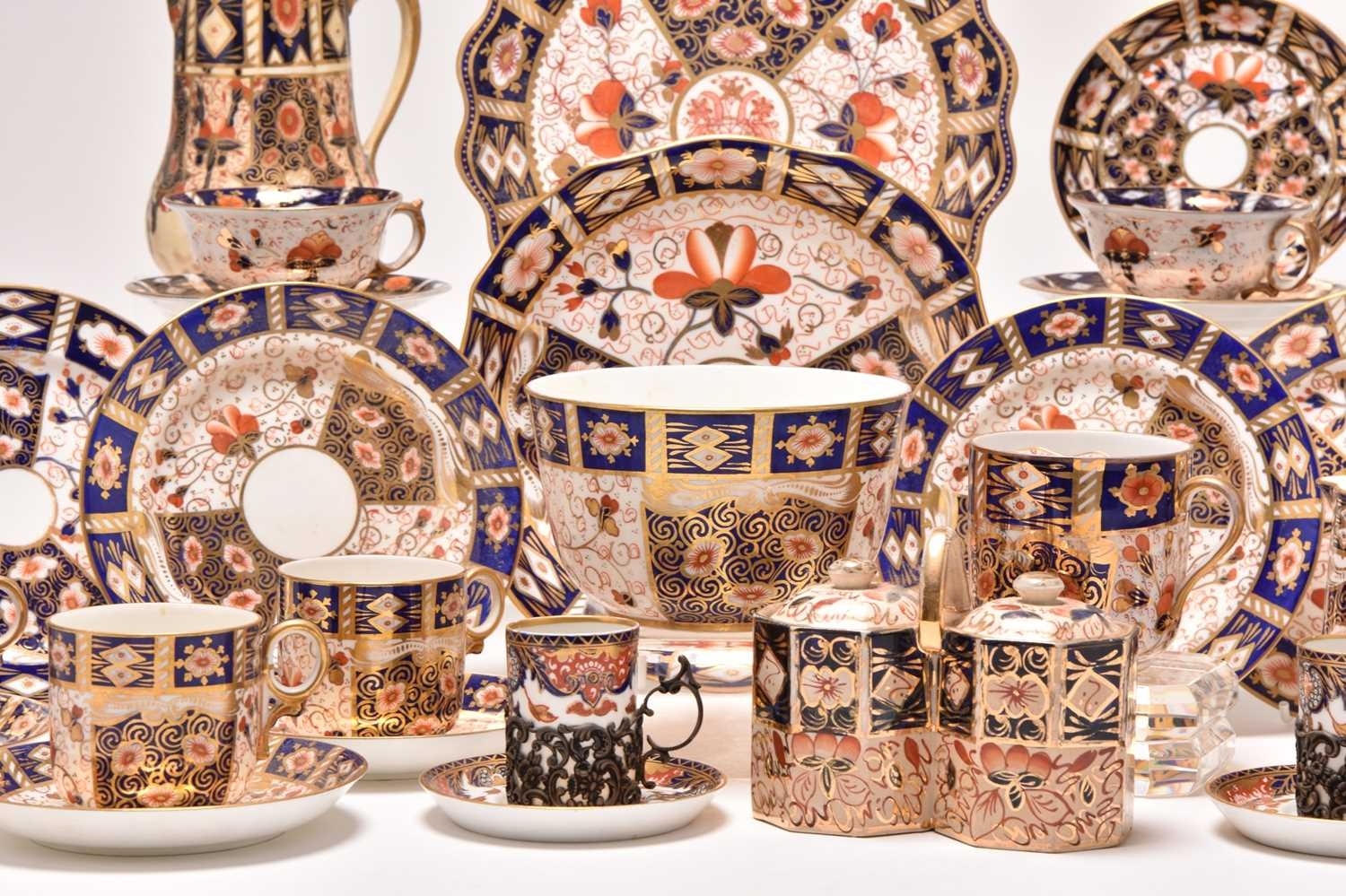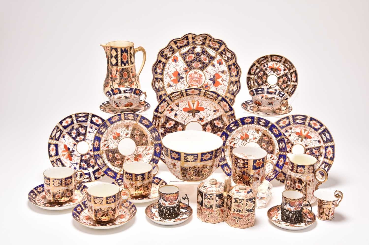 A varied collection of assorted English imari tea and coffeewares, comprising a Wade double preserve jar; a Ford & Pointon / Pointon part tea service; Royal Crown Derby, pattern 2451, comprising two saucers, four side plates, 18cm diameter; a lobed serving plate, twelve coffee cups, eleven saucers, five sideplaes, sugar bowl, a smaller coffee cup and saucer, a moustache cup, lobed circular dessert plate and a set of six silver-mounted coffee cans and saucers, etc (qty) (some damages/repairs)
