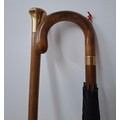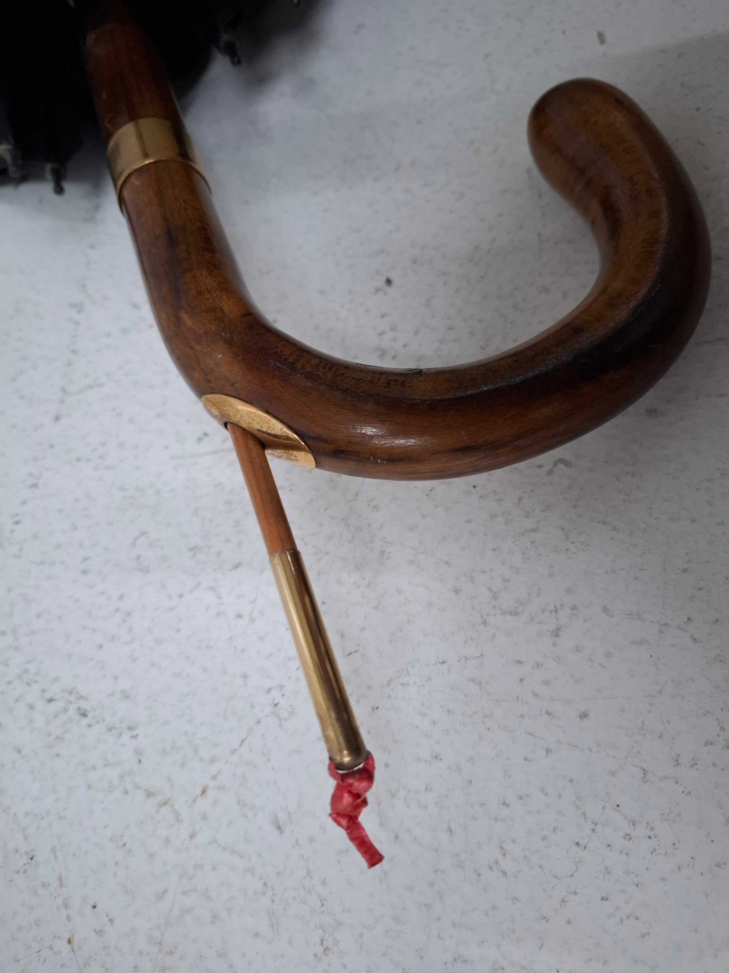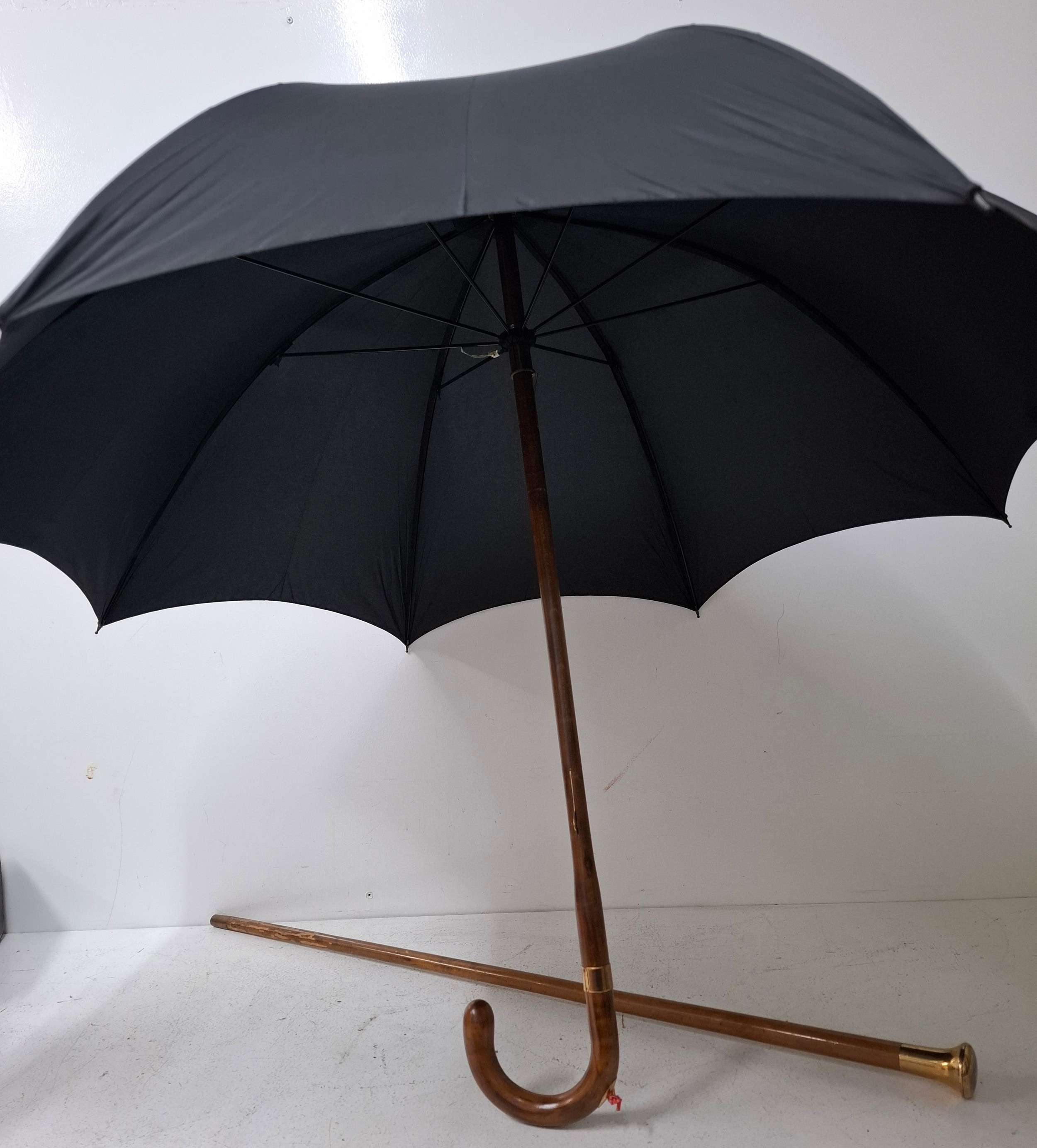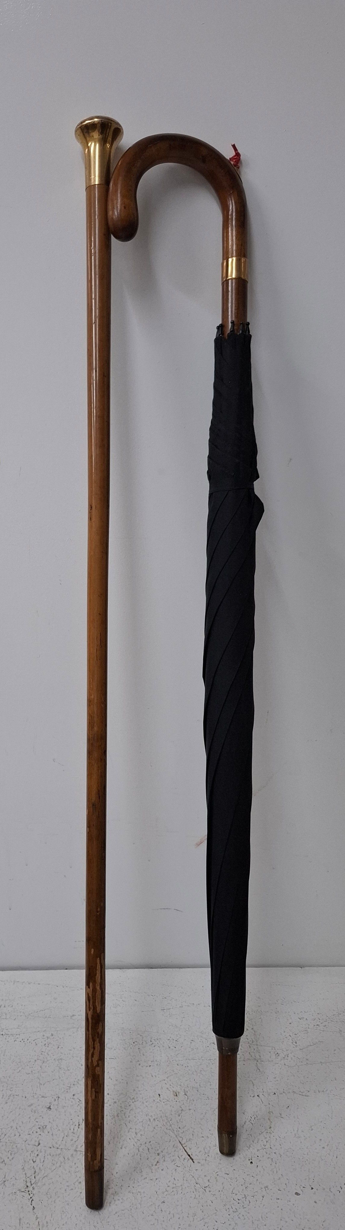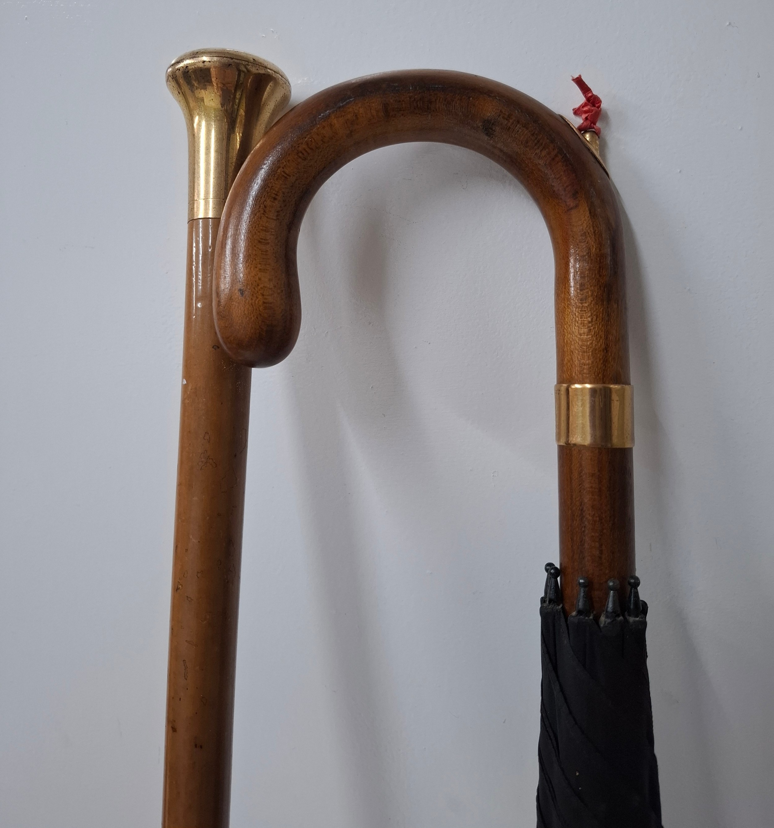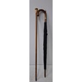 A Briggs London black umbrella with inset pencil having a gold tone collar signed Briggs together with a walking cane having a yellow metal knob