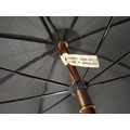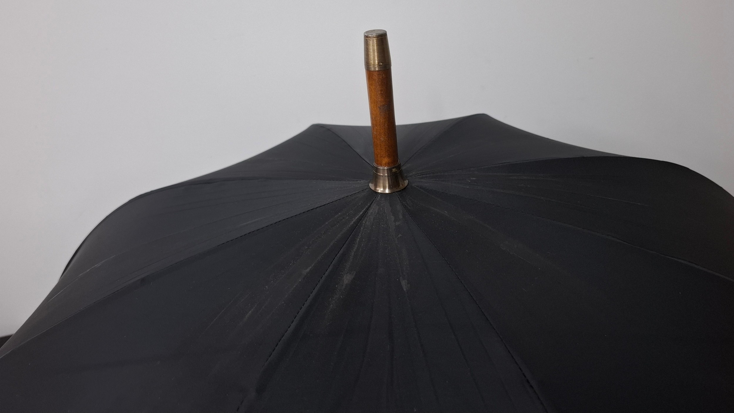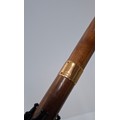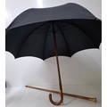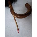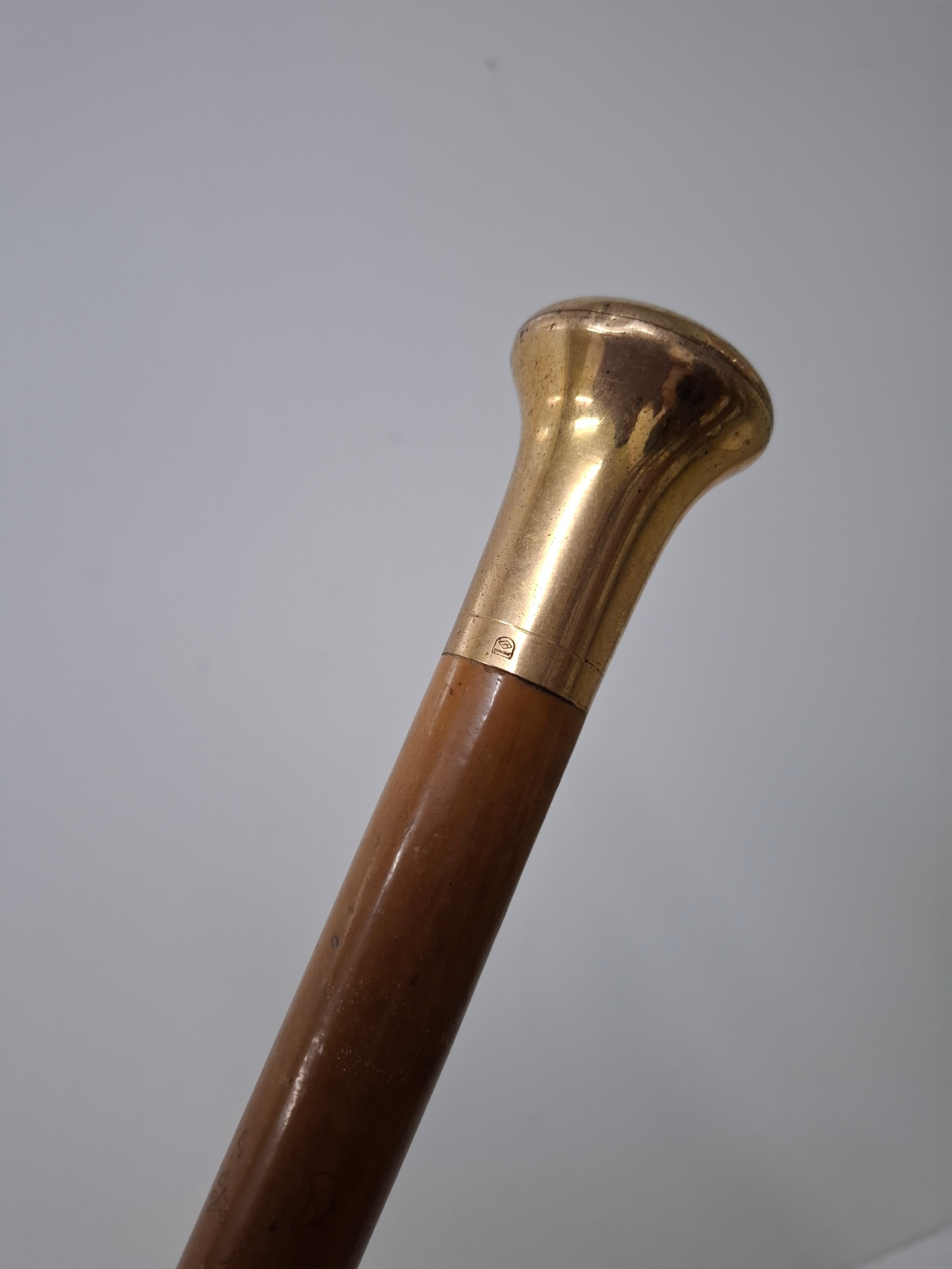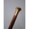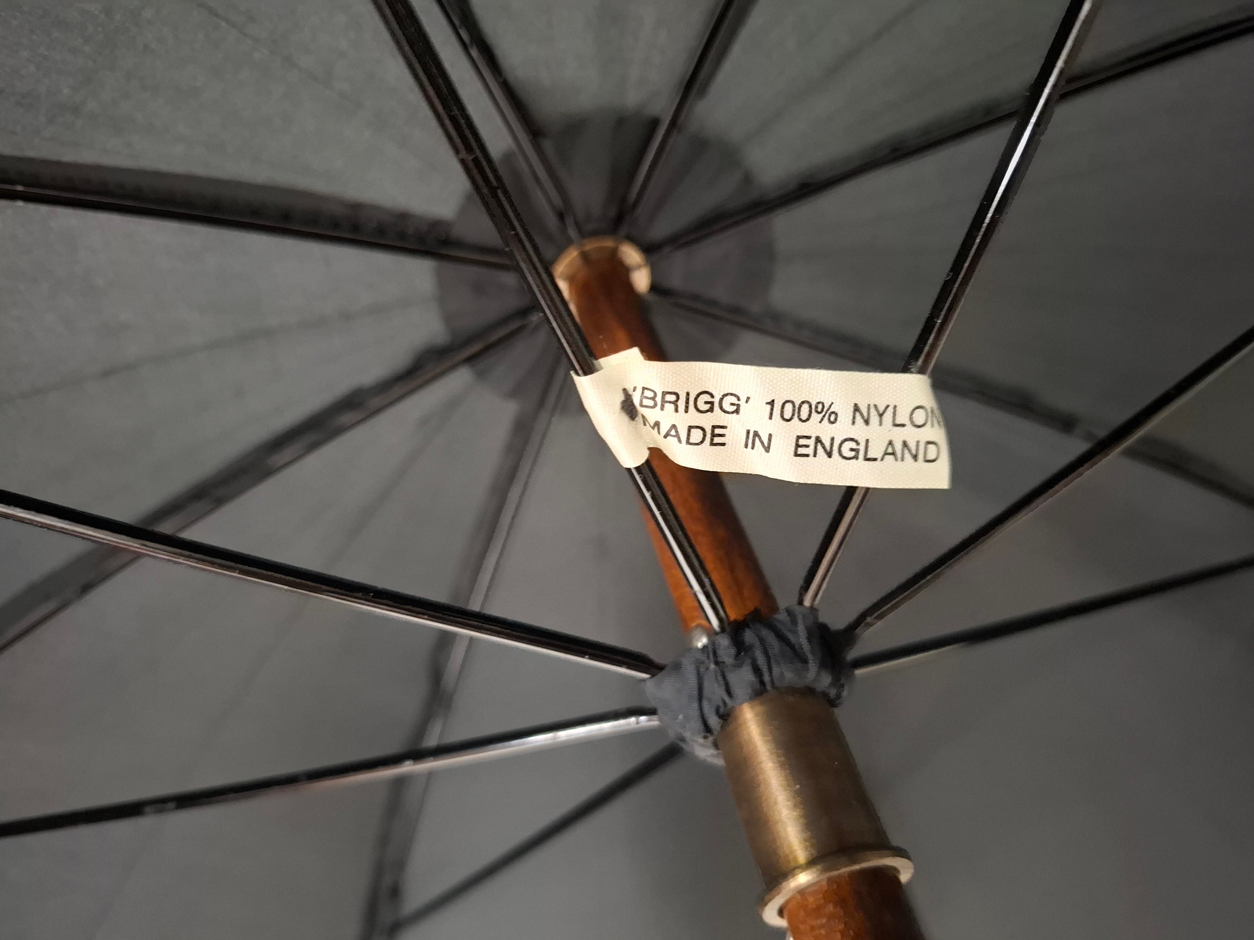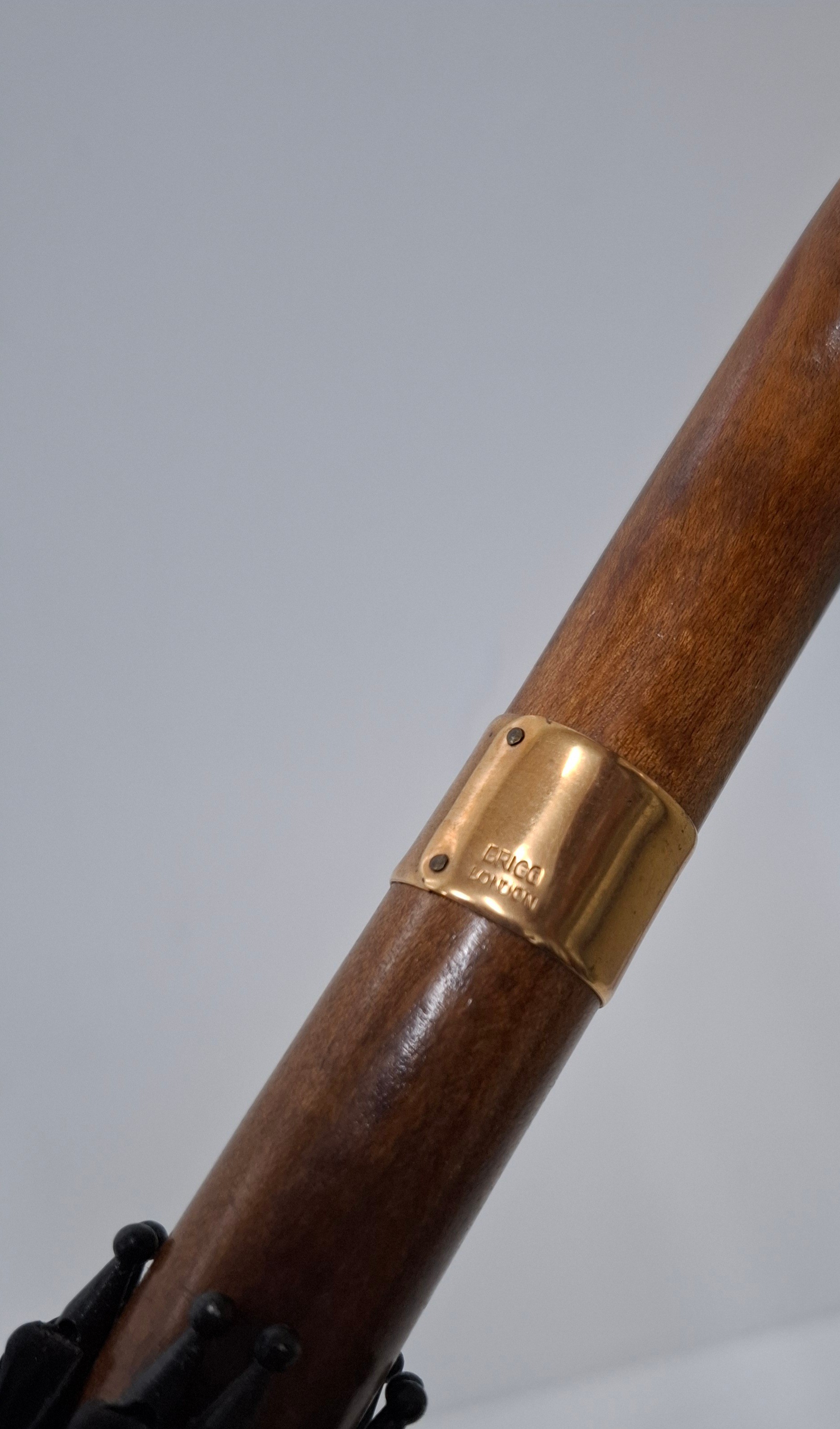 A Briggs London black umbrella with inset pencil having a gold tone collar signed Briggs together with a walking cane having a yellow metal knob