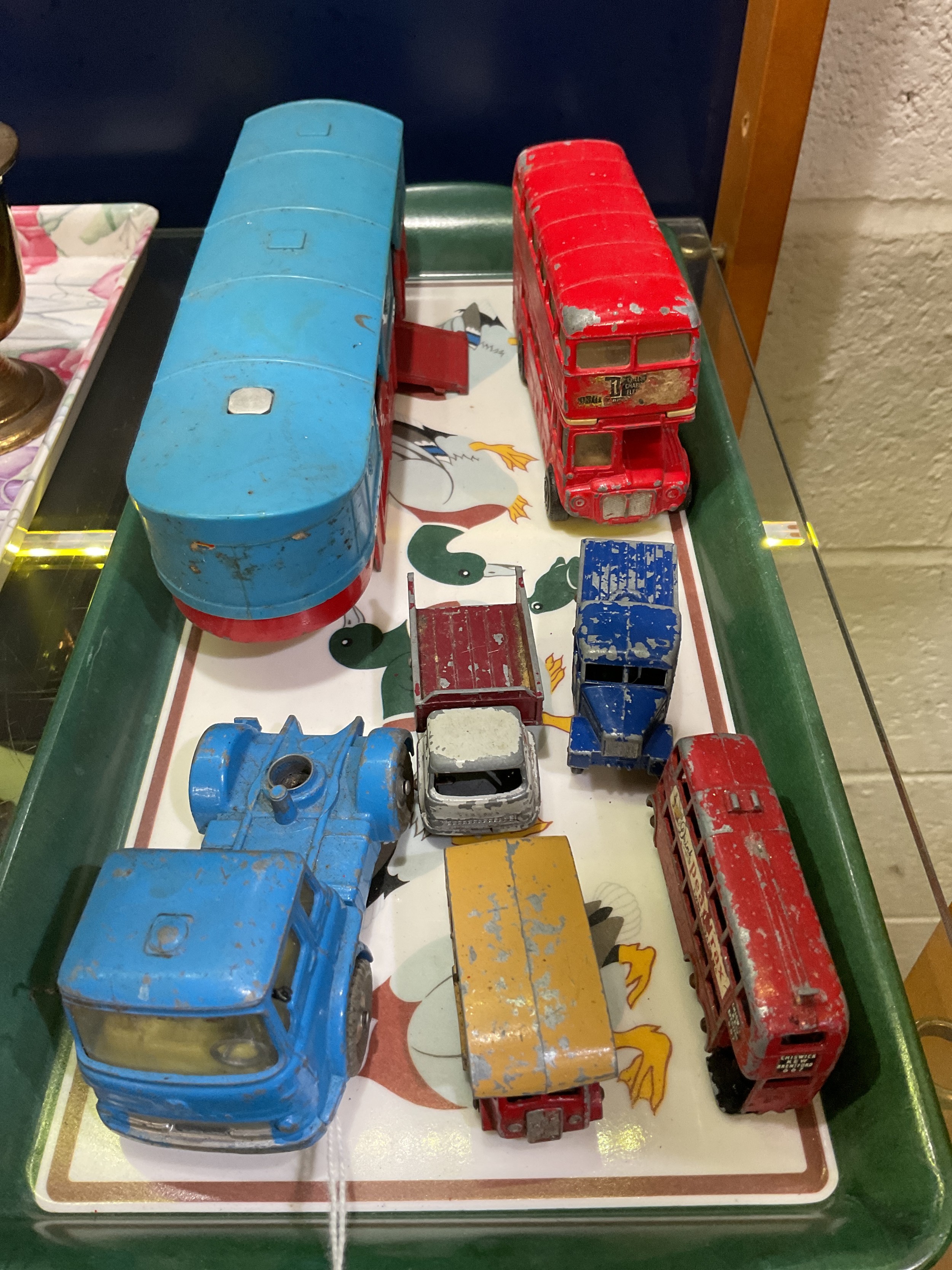 A mixed selection of play-worn die-cast vehicles to include a Corgi London Transport 'Routemaster', a Corgi articulated horse box A/F, etc