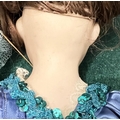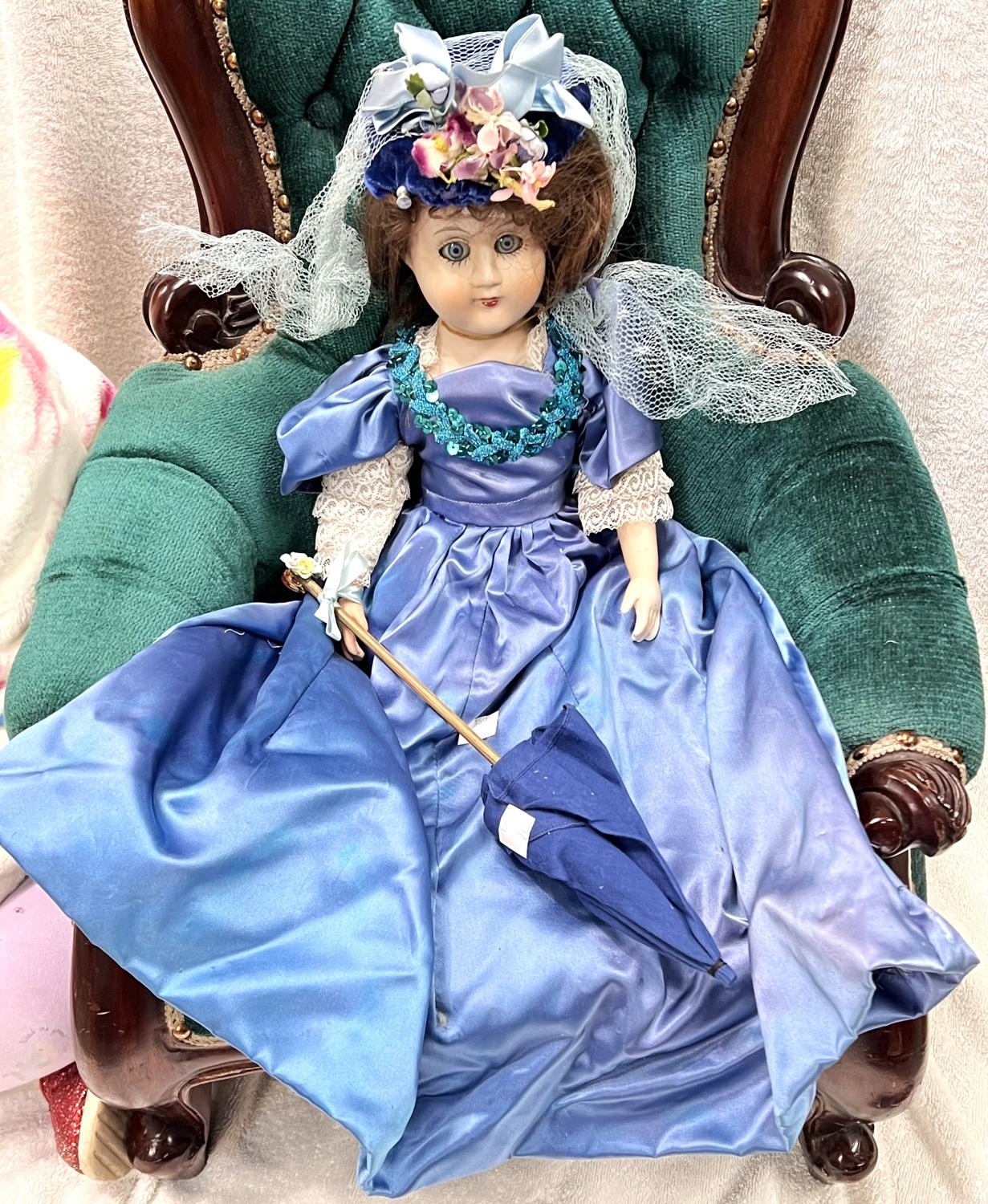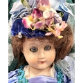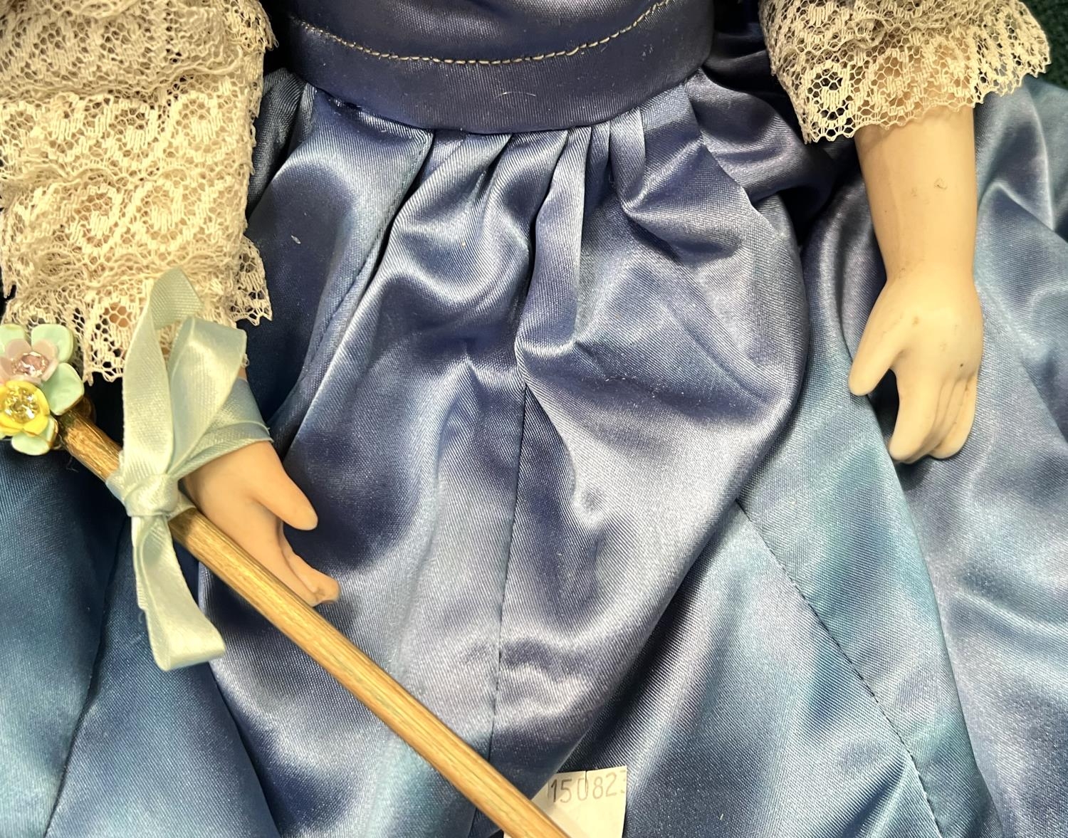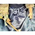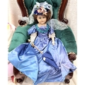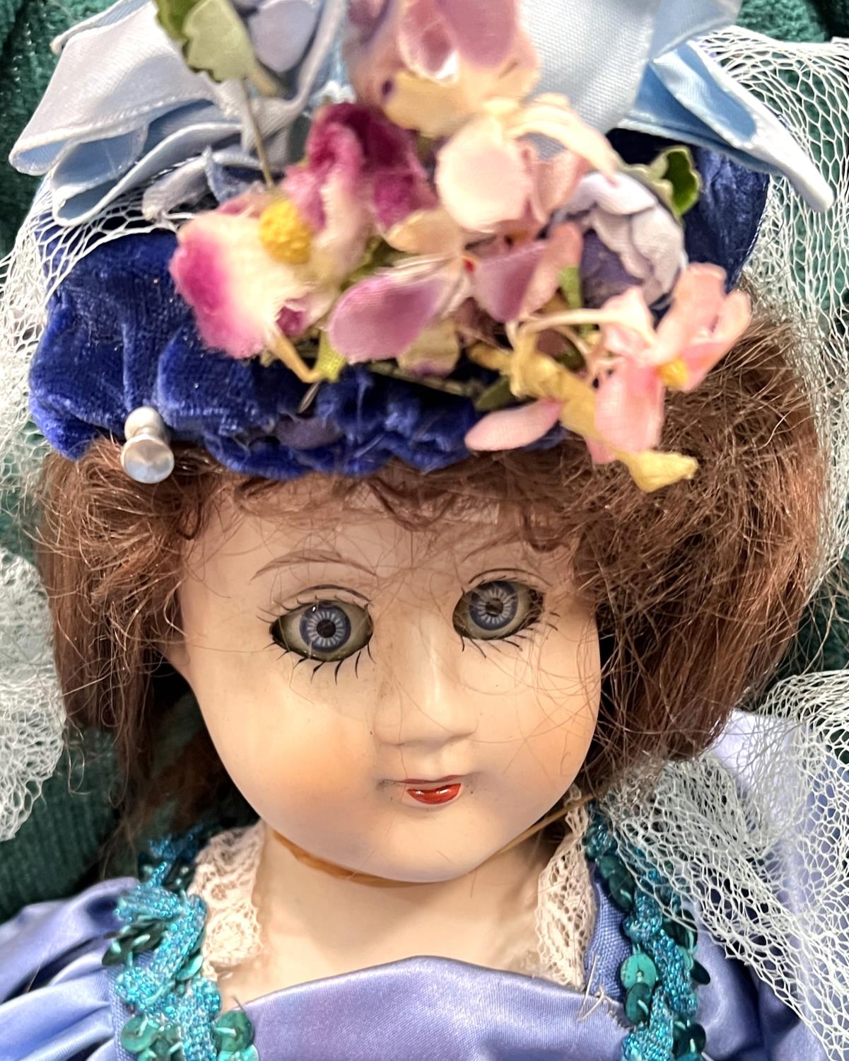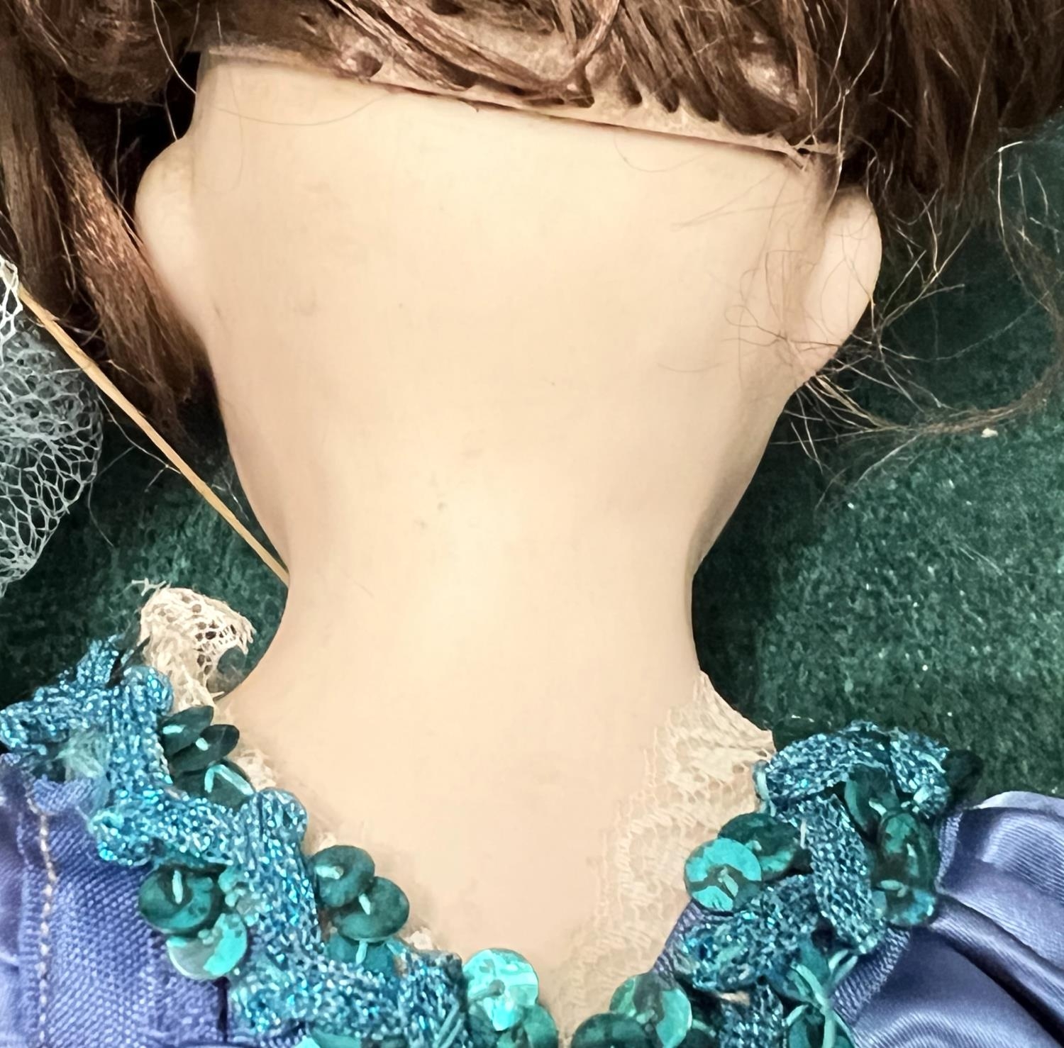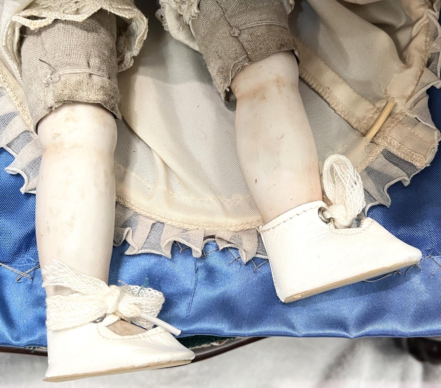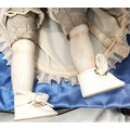 A late 19th/early 20th century bisque head and shoulders baby doll with cloth body and lower limbs, glass eyes, real hair wig, in blue satin dress, length 48cm