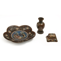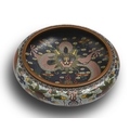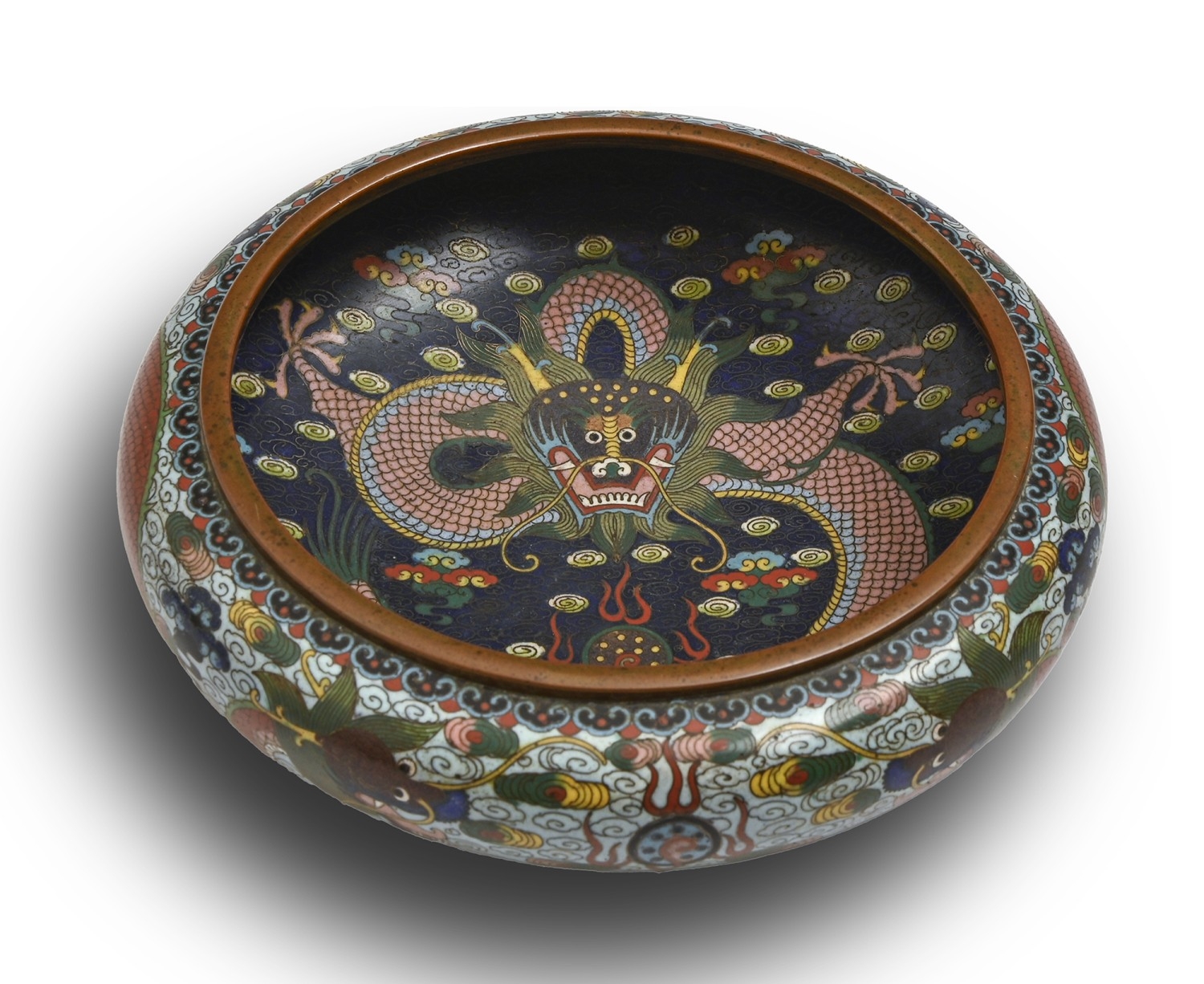 A Chinese cloisonne enamel bowl, early 20th c, the interior with five-claw pink dragon on a deep blue ground, the exterior with two dragons and flaming pearl on a light blue ground, 21cm diam