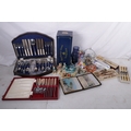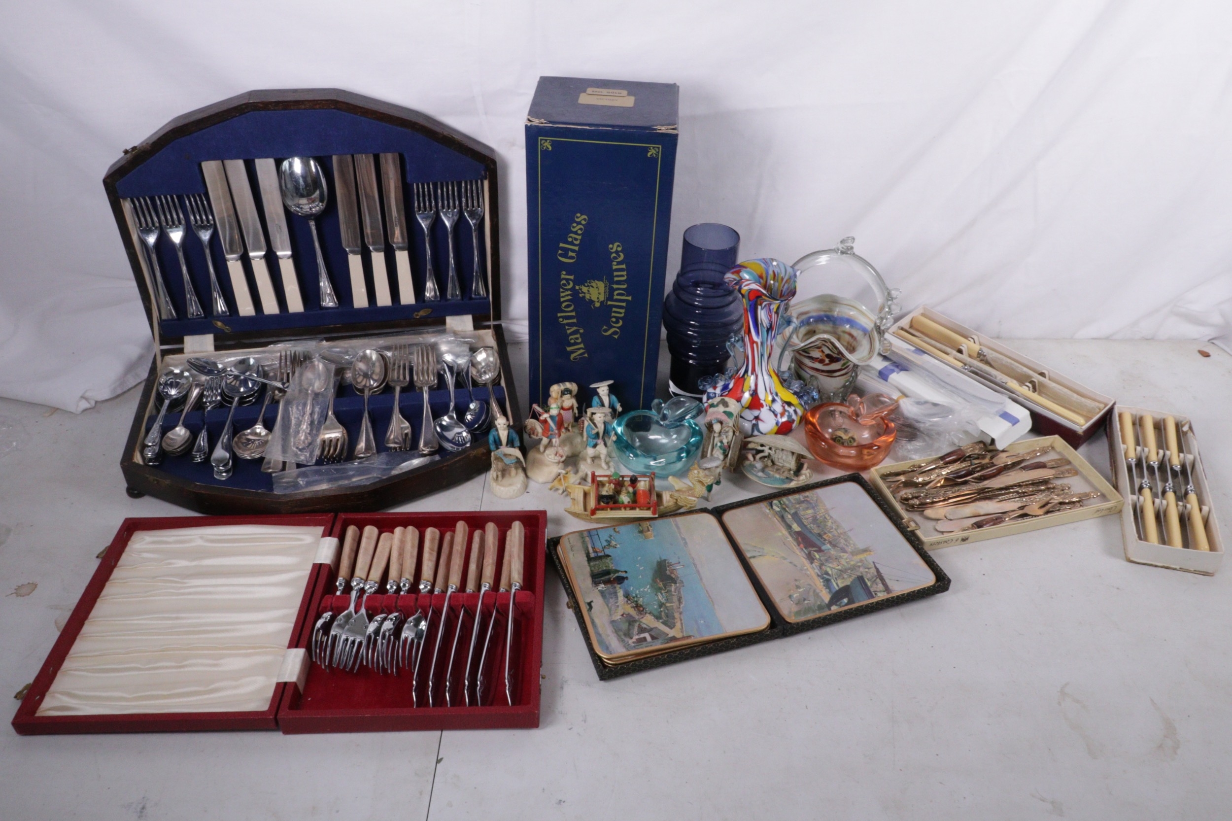 Glass ware, Ship in a bottle, Celluloid oriental figures, assorted cutlery, canteen etc