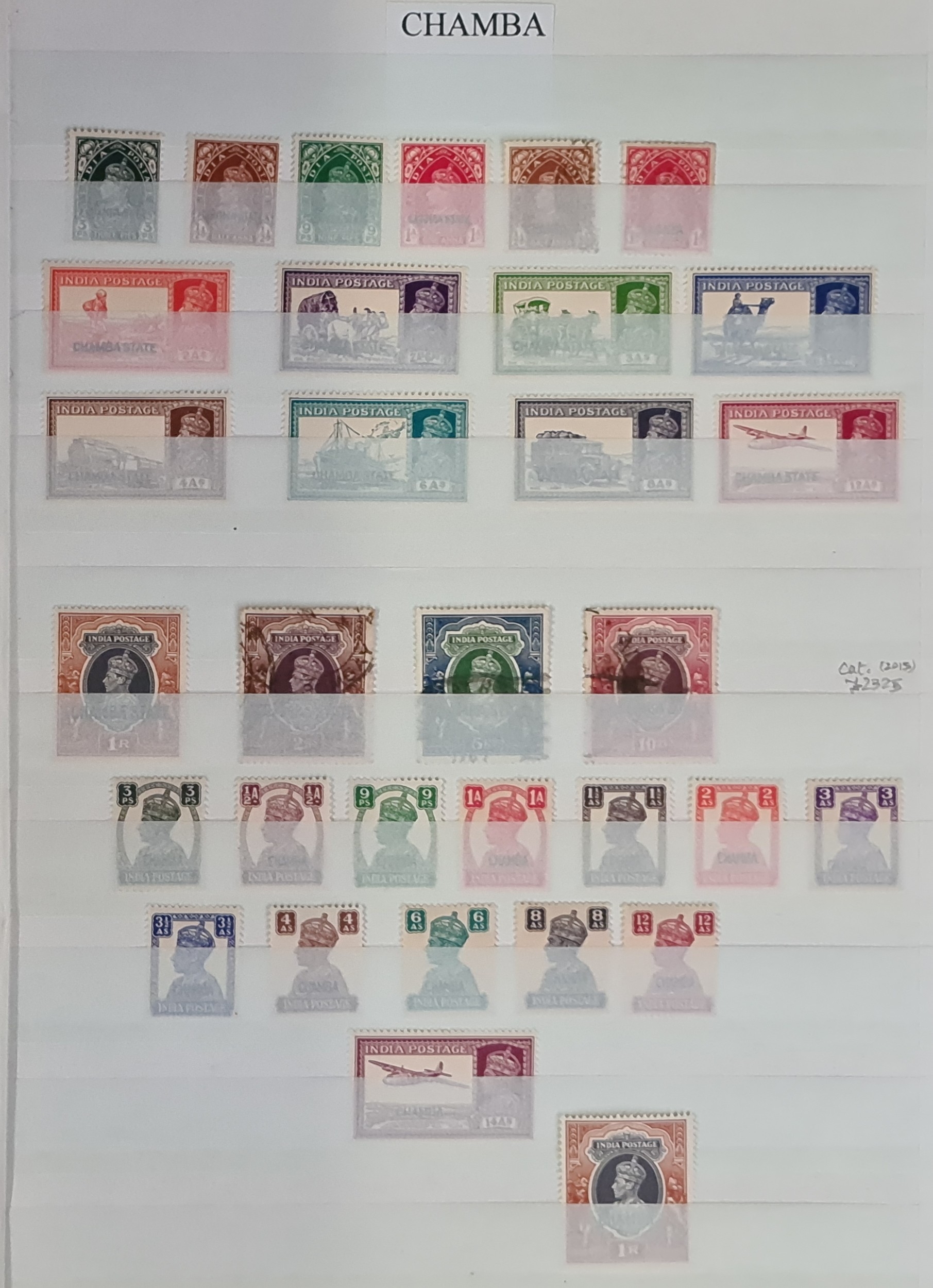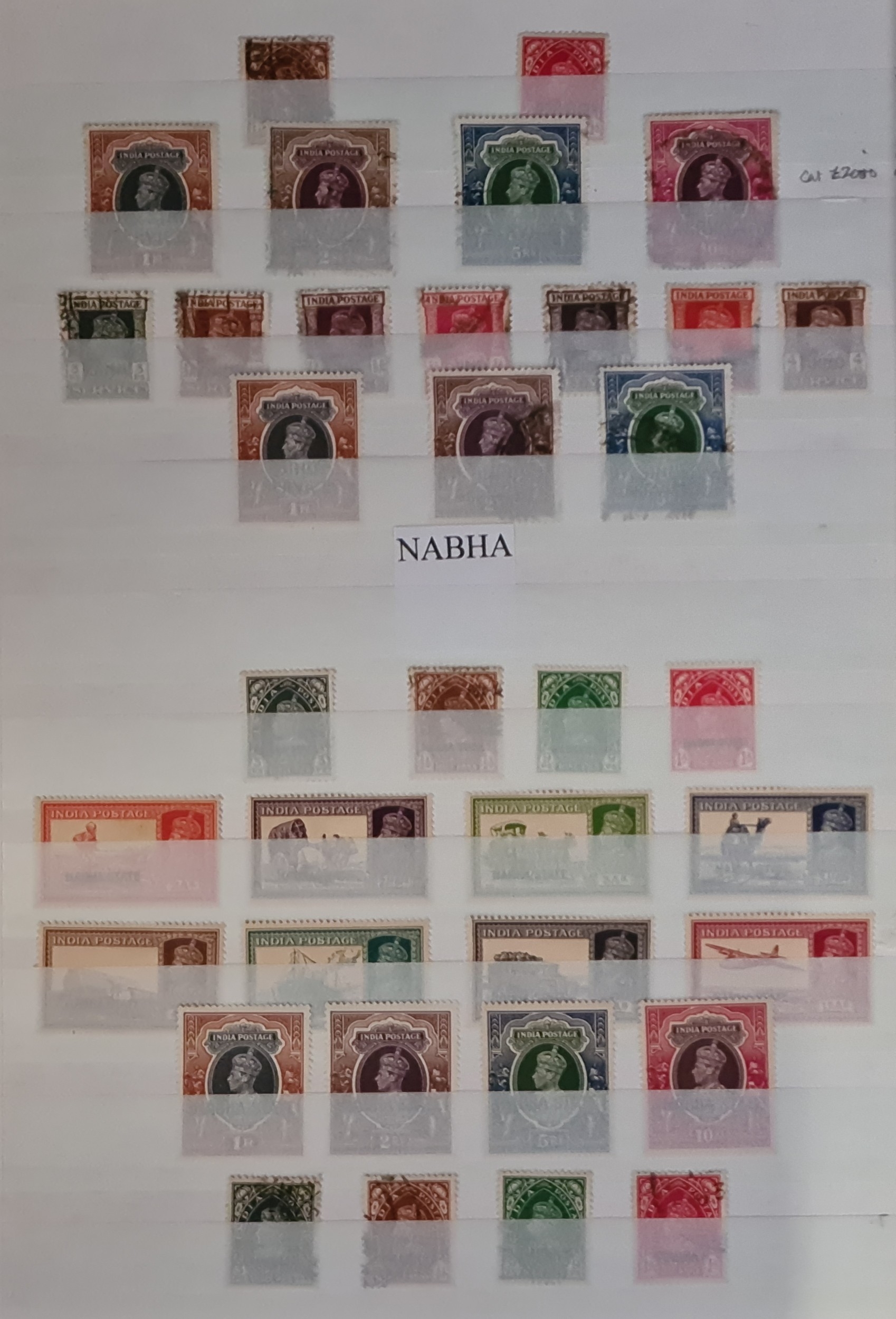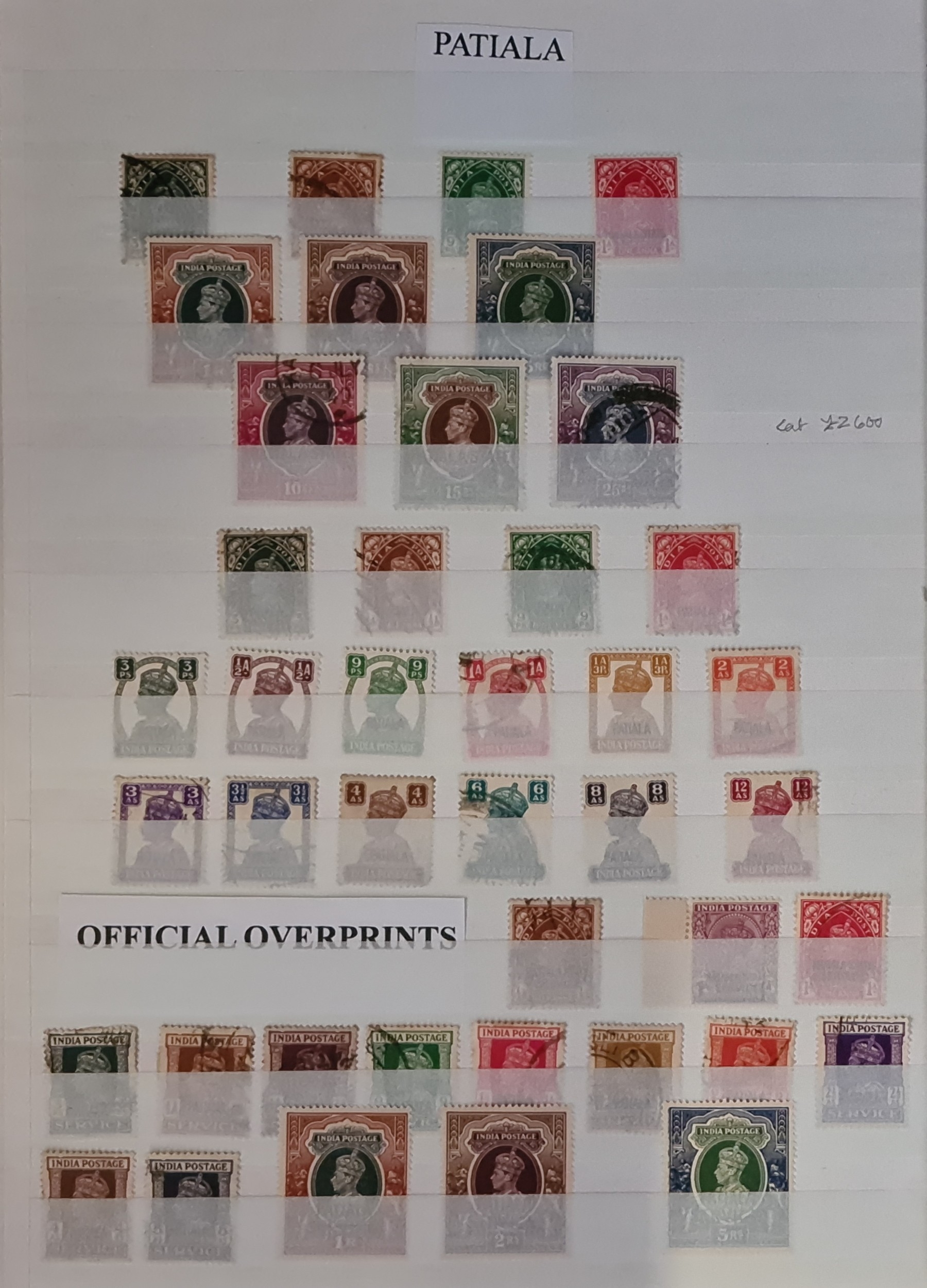 1935-52 MINT & USED COLLECTION OF INDIA & STATES, PAKISTAN, BURMA & RELATED in stock book with highly catalogued ranges with strength in Indian Convention States. Includes India 1937 set to 2r (ex 9p used), mint & 2r to 25r used, 1940 set mint (ex 12a used) & 1937 Officials set used; Pakistan 1947 set mint plus Officials set mint; Ceylon 1938 set mint; Indian Feudatory States with Idar, Indore 1940 surcharges (SG 33/34) mint, Bhopal used range, Bijawar 1936 roul set of 5 mint, Bundi 1941 set to 20p used, 1947 set mint, Cochin, Hyderabad, Jaipur 1940 Jubilee set mint (½a u), Orcha 1935 set to 12a used, 1939 six values to 4a mint, Soruth, Travancore, Rajasthan 1948 SG 2A, fiscally used & SG 3B unused; Convention States, Chamba 1938 set to 1r mint plus 1a, 2r to 10r used, 1942 1r mint & later set mint, Officials 1938 set mint & 1940 set mint (ex 1a3p); Gwailor 1938 set to 10r used plus 15r mint; Jind 1937 set to 12a mint plus 1r & 2r used Officials 1937 set (ex 9p) used & 1939 1r to 5r used; Nabha 1938 to 10r mint (½a used), 1941 low values set of 4 used & set of 13 mint, Officials 1938 pair used, 1940 set with mixed mint& used with 1r mint & 2r & 5r used ;Patiala 1937 1r, 10r, 15r & 25r used & 2r &5r mint, Officials 1939 1r to 5r mint, Burma 1937 set to 5r mint plus 10r & 15r used, Officials 1937 set with values to 1r mint & 2r, 5r & 10r used; Bahrain 1933-37 set used & 1942 set used (ex 9p & 3a); range of Muscat & Kuwait 1937 1r to 15r umm & 1945 set, a mix of mint & used plus many others. Highly catalogued collection with value exceeding £23,500 although the overprints & postmarks cannot be guaranteed. (100s)