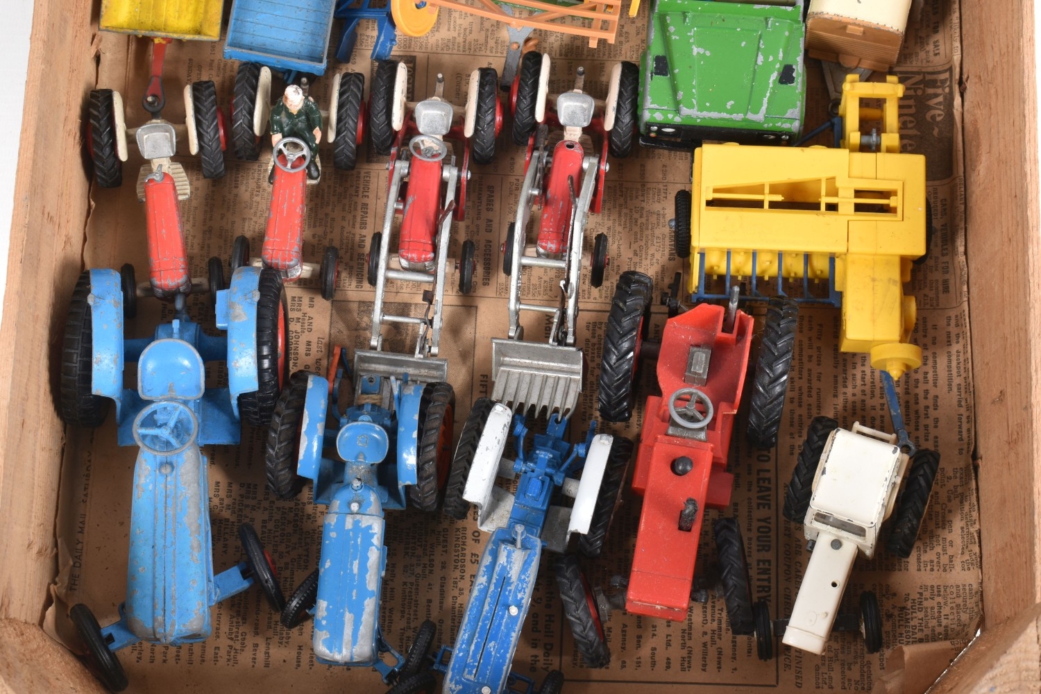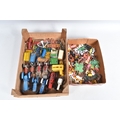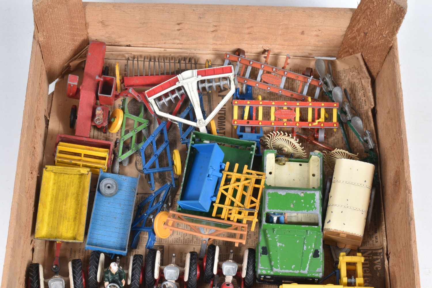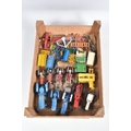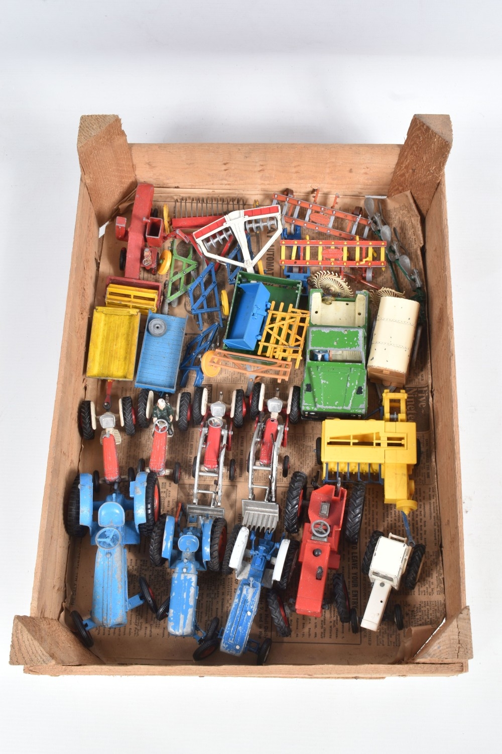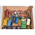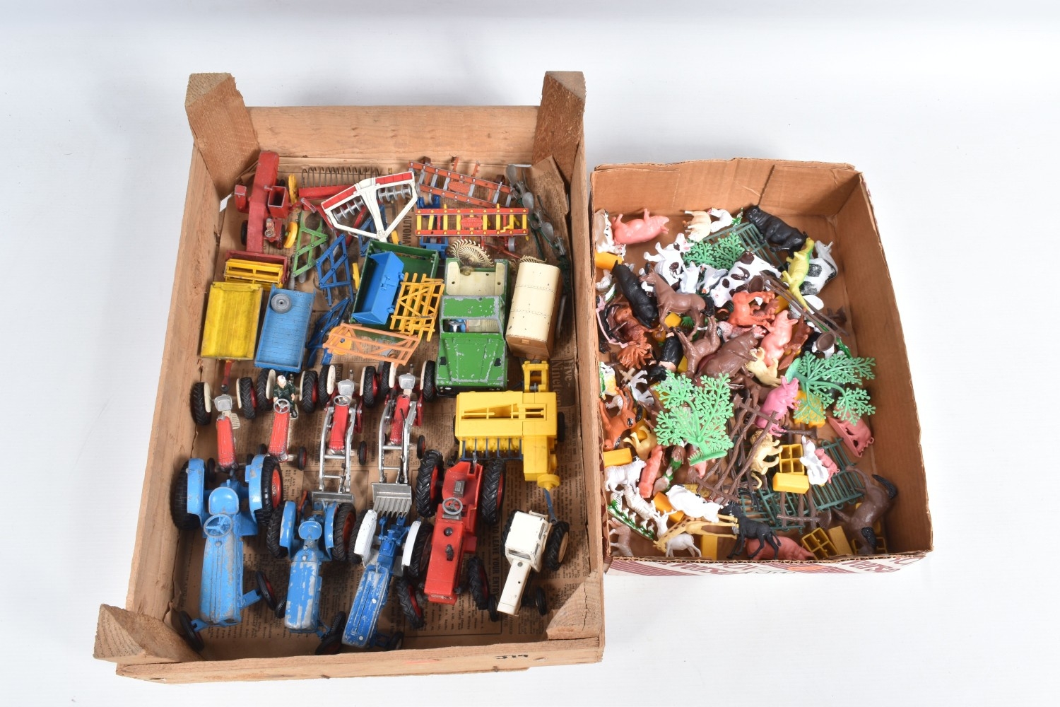 A QUANTITY OF UNBOXED ASSORTED PLAYWORN FARMING & AGRICULTURAL DIECAST AND PLASTIC MODELS, to include 2 x Corgi Toys Massey-Ferguson 65 tractor with fork, No.57, 2 x Massey-Ferguson tractor, No.50, Britains Ford Power Major tractor, No.172, Dinky Toys David Brown 990 tractor, No.305, assorted implements by Britains, Dinky and others, together with a quantity of Britains and other plastic animals and accessories, all items in playworn condition, the diecast models with paint loss, marking and wear, some with minor damage and/or missing parts and accessories (2 boxes)