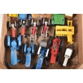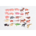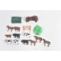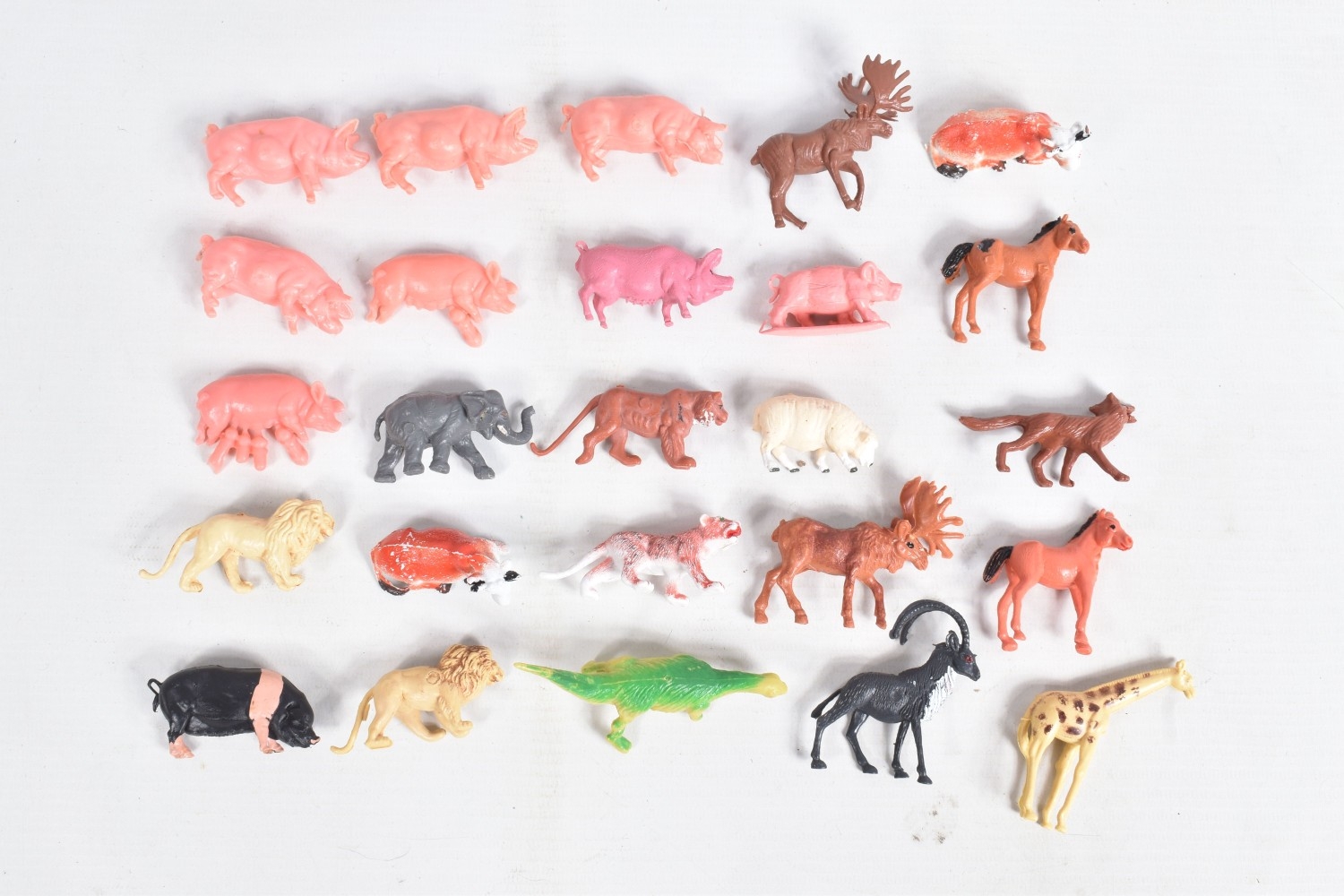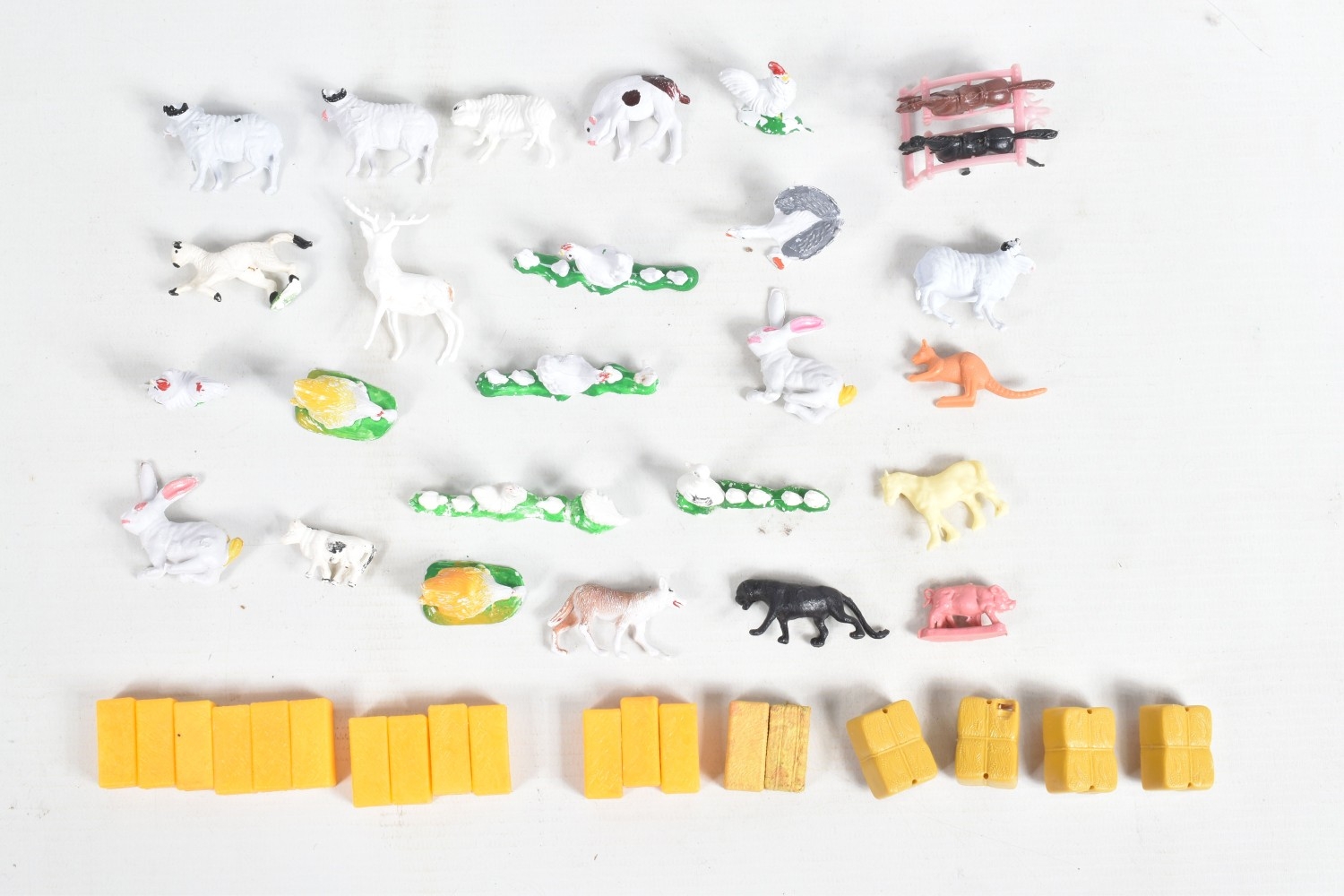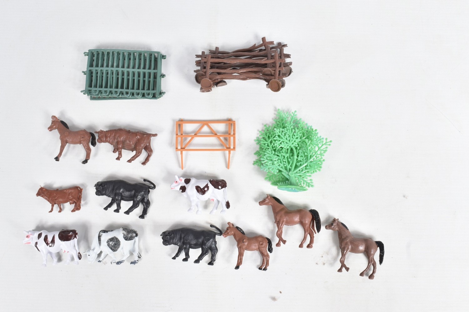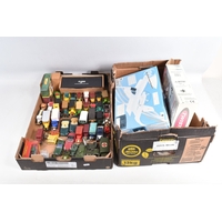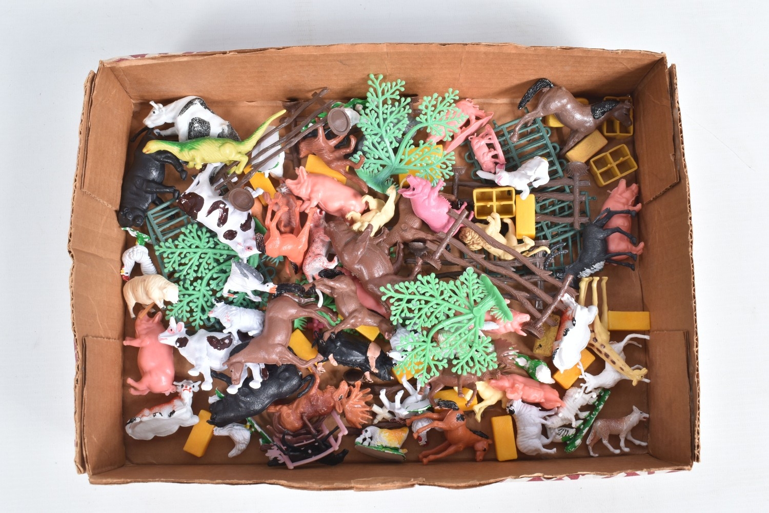 A QUANTITY OF UNBOXED ASSORTED PLAYWORN FARMING & AGRICULTURAL DIECAST AND PLASTIC MODELS, to include 2 x Corgi Toys Massey-Ferguson 65 tractor with fork, No.57, 2 x Massey-Ferguson tractor, No.50, Britains Ford Power Major tractor, No.172, Dinky Toys David Brown 990 tractor, No.305, assorted implements by Britains, Dinky and others, together with a quantity of Britains and other plastic animals and accessories, all items in playworn condition, the diecast models with paint loss, marking and wear, some with minor damage and/or missing parts and accessories (2 boxes)