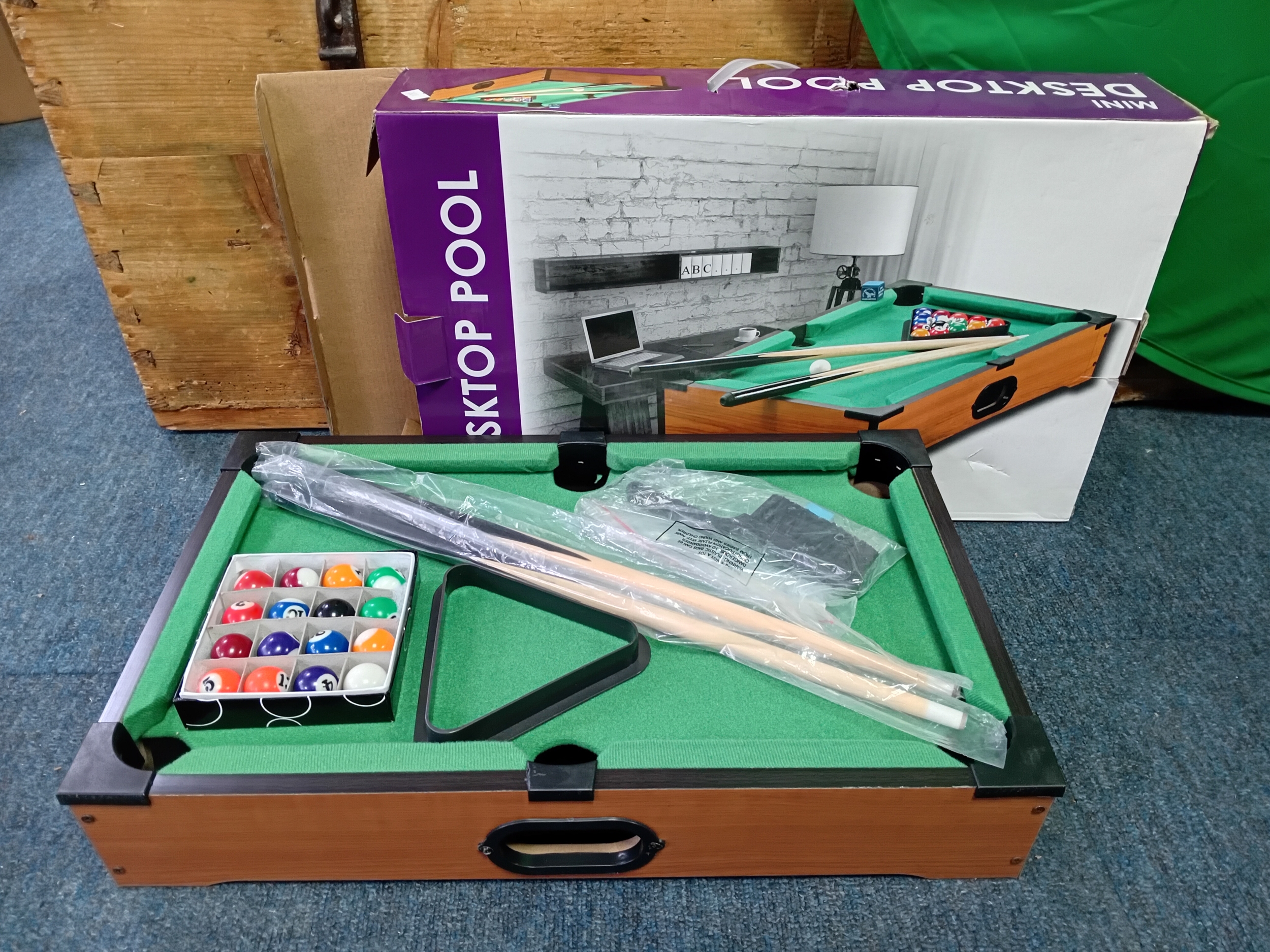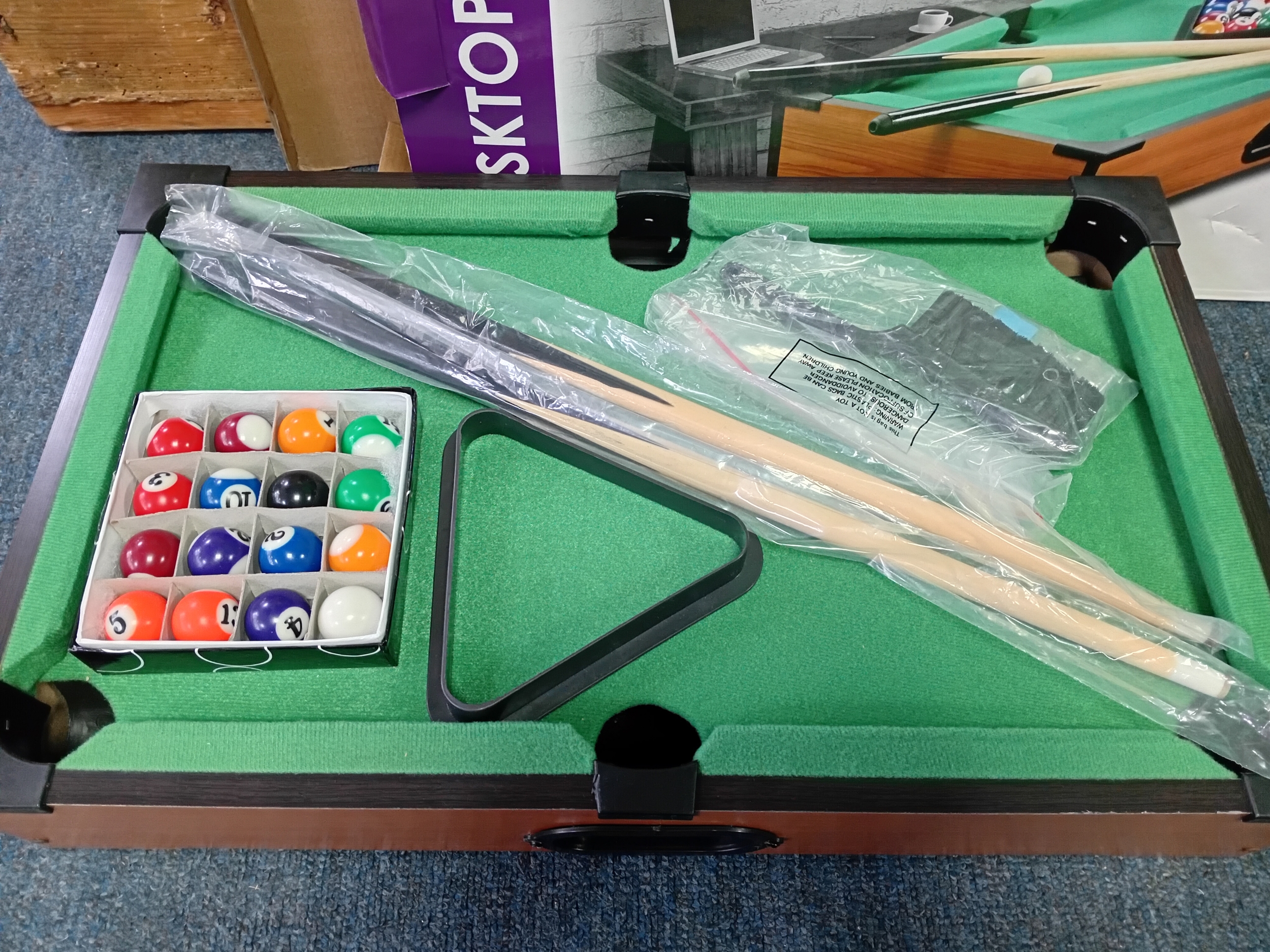 A "mini desktop pool" table in original box, everything seems complete. 52cm x 32cm x 10cm.
