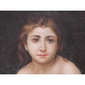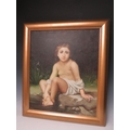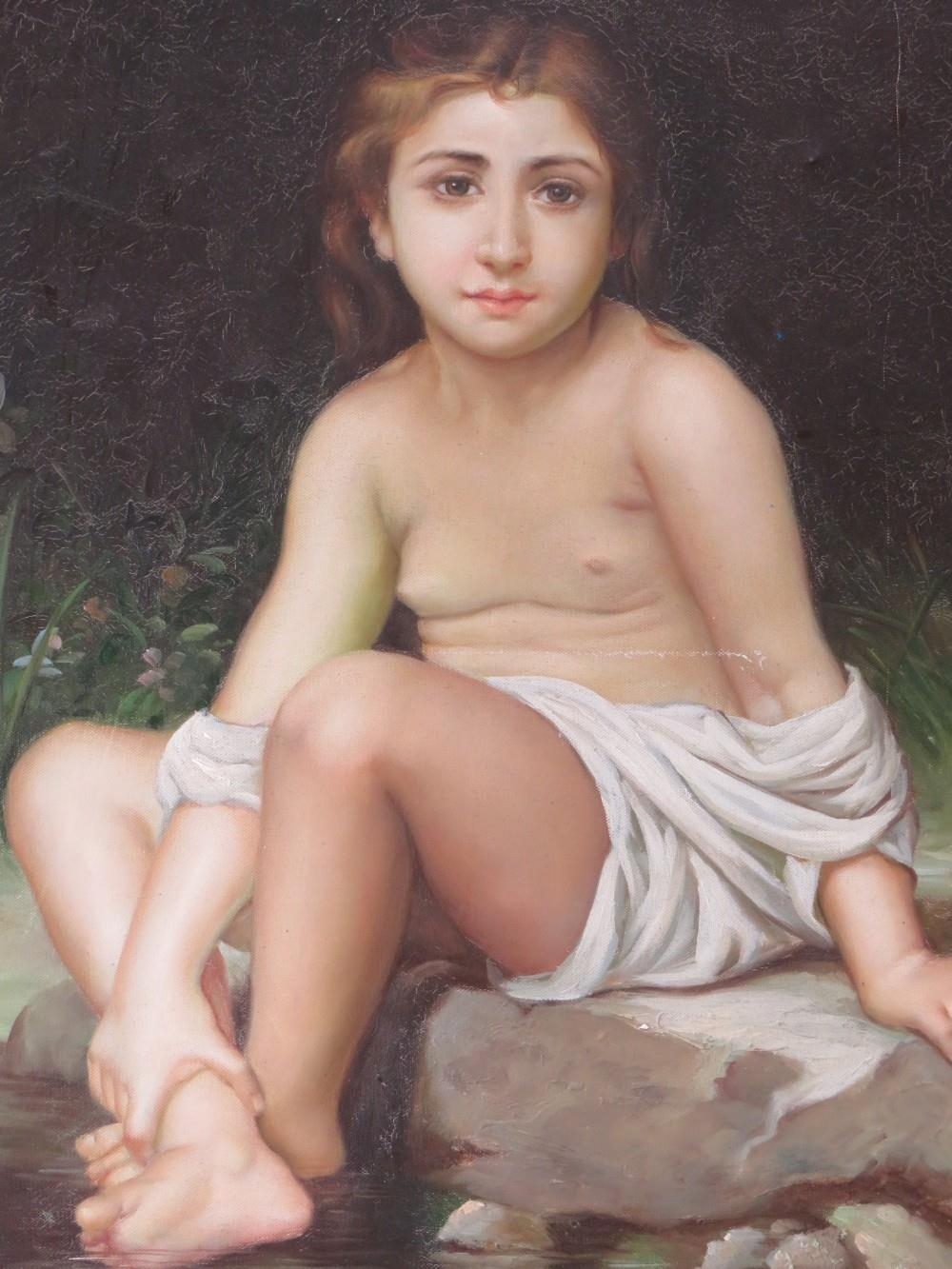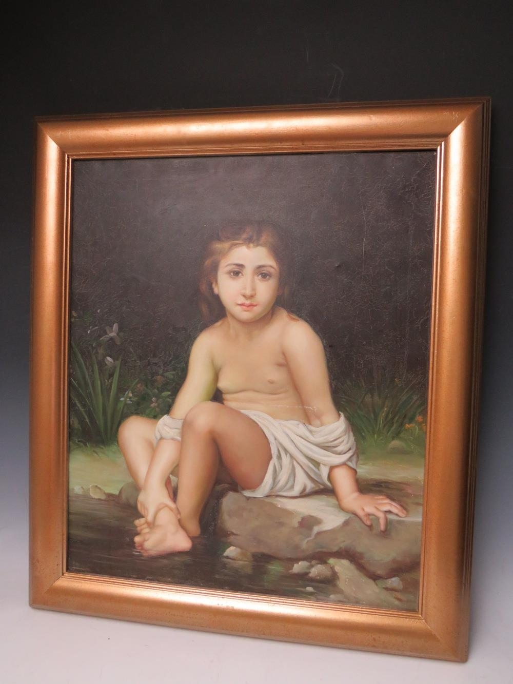 A 20TH CENTURY STUDY OF A FEMALE SEMI-NUDE FIGURE, seated on a riverside rock, oil on canvas, unsigned, gilt framed, 60 x 50 cm