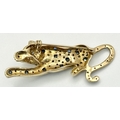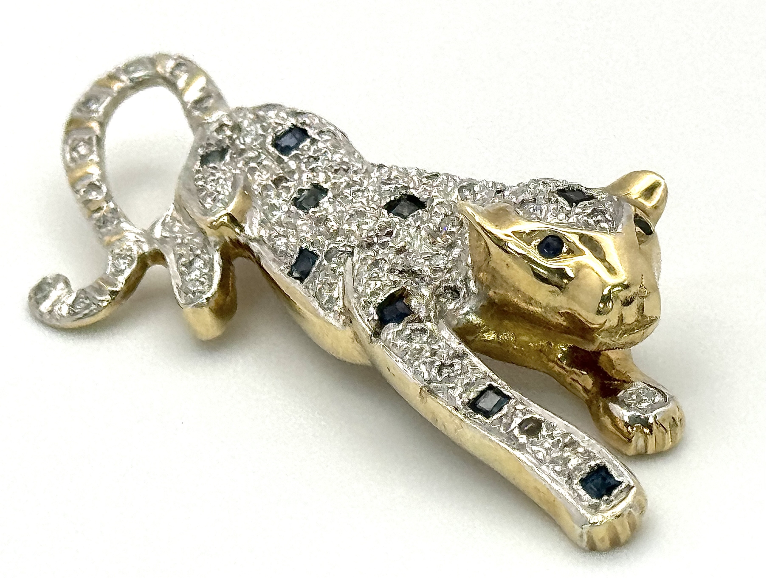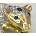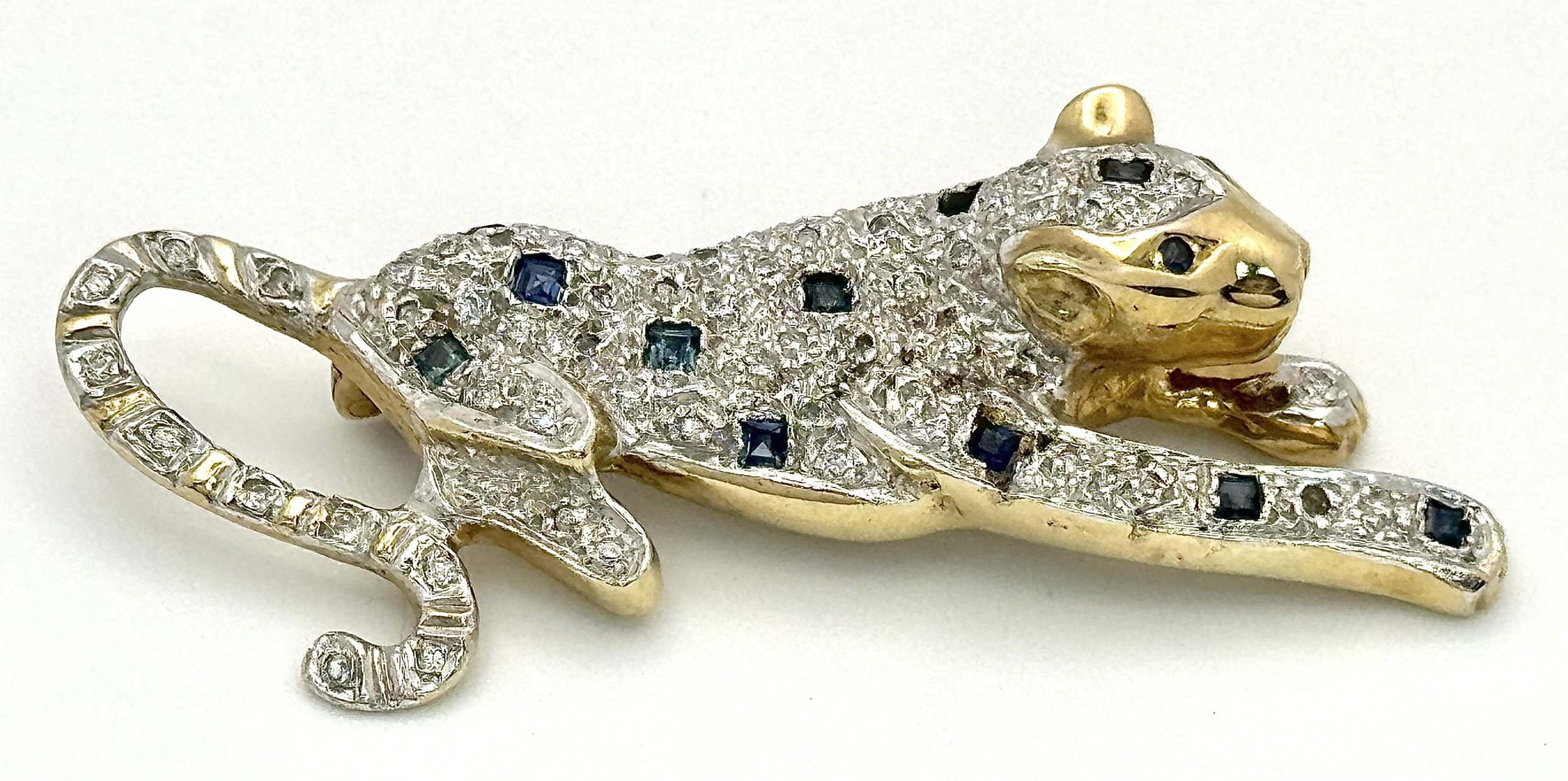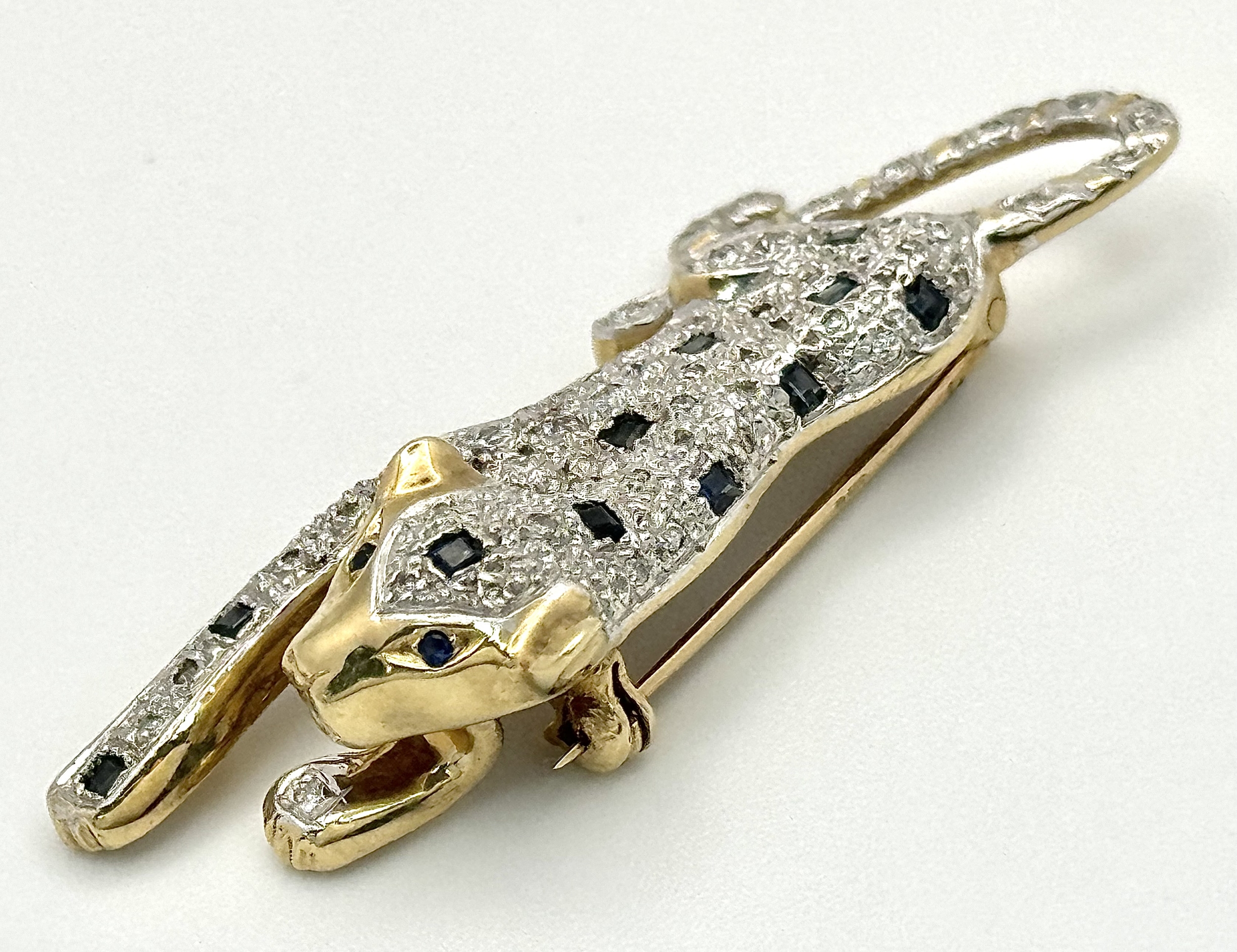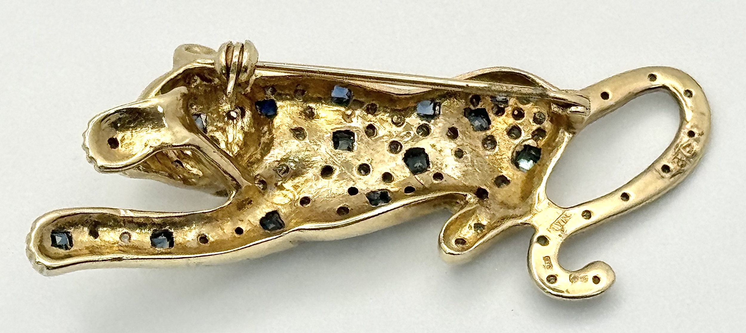 A Playful 9K Gold, Diamond and Sapphire Panther Brooch. 1ctw of diamonds and 0.5ctw of sapphires. 5cm. 11.2g total weight. One small diamond missing. NL-15A3004.