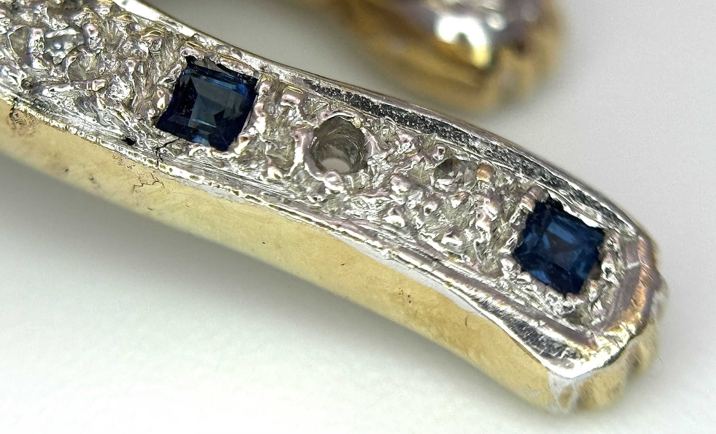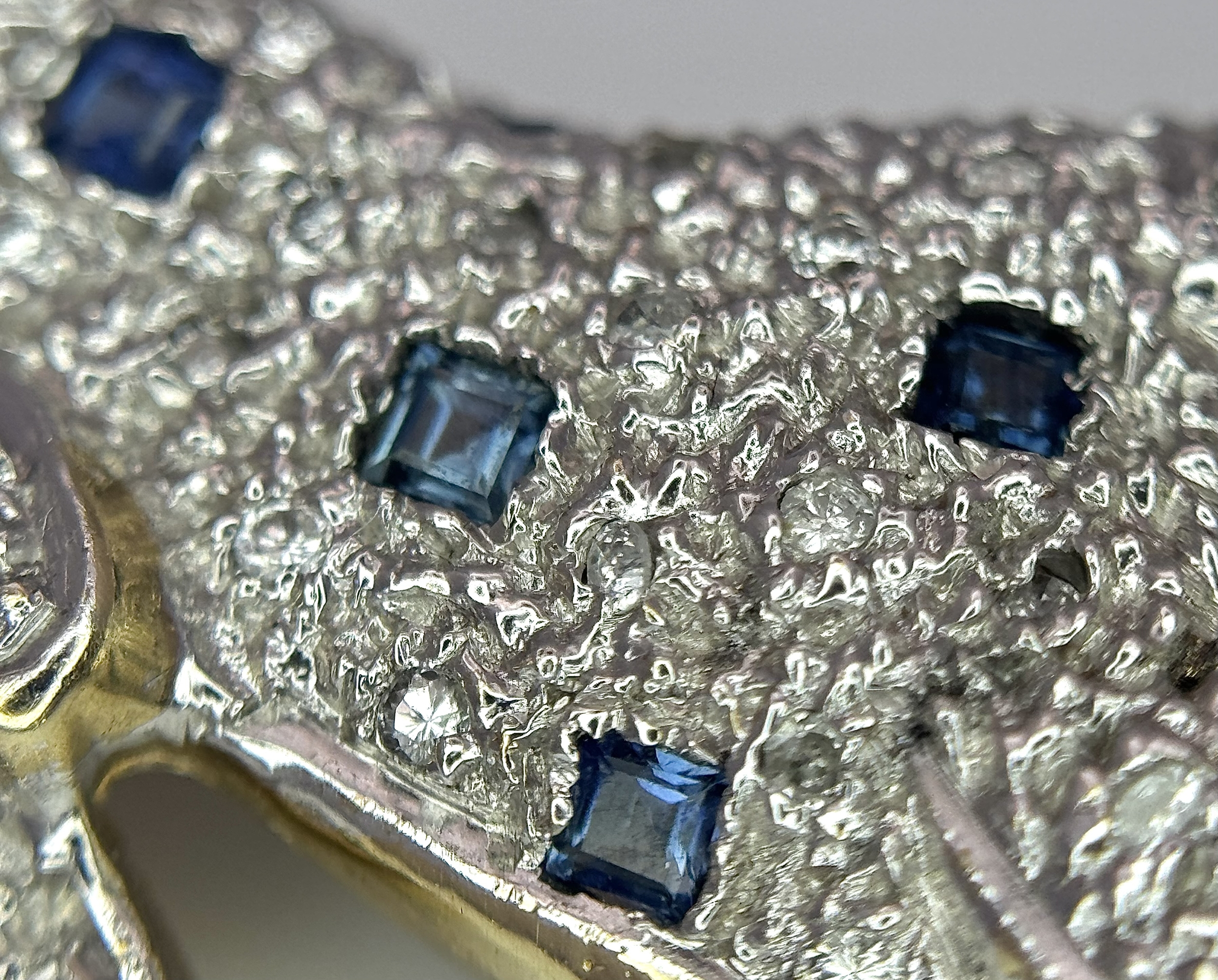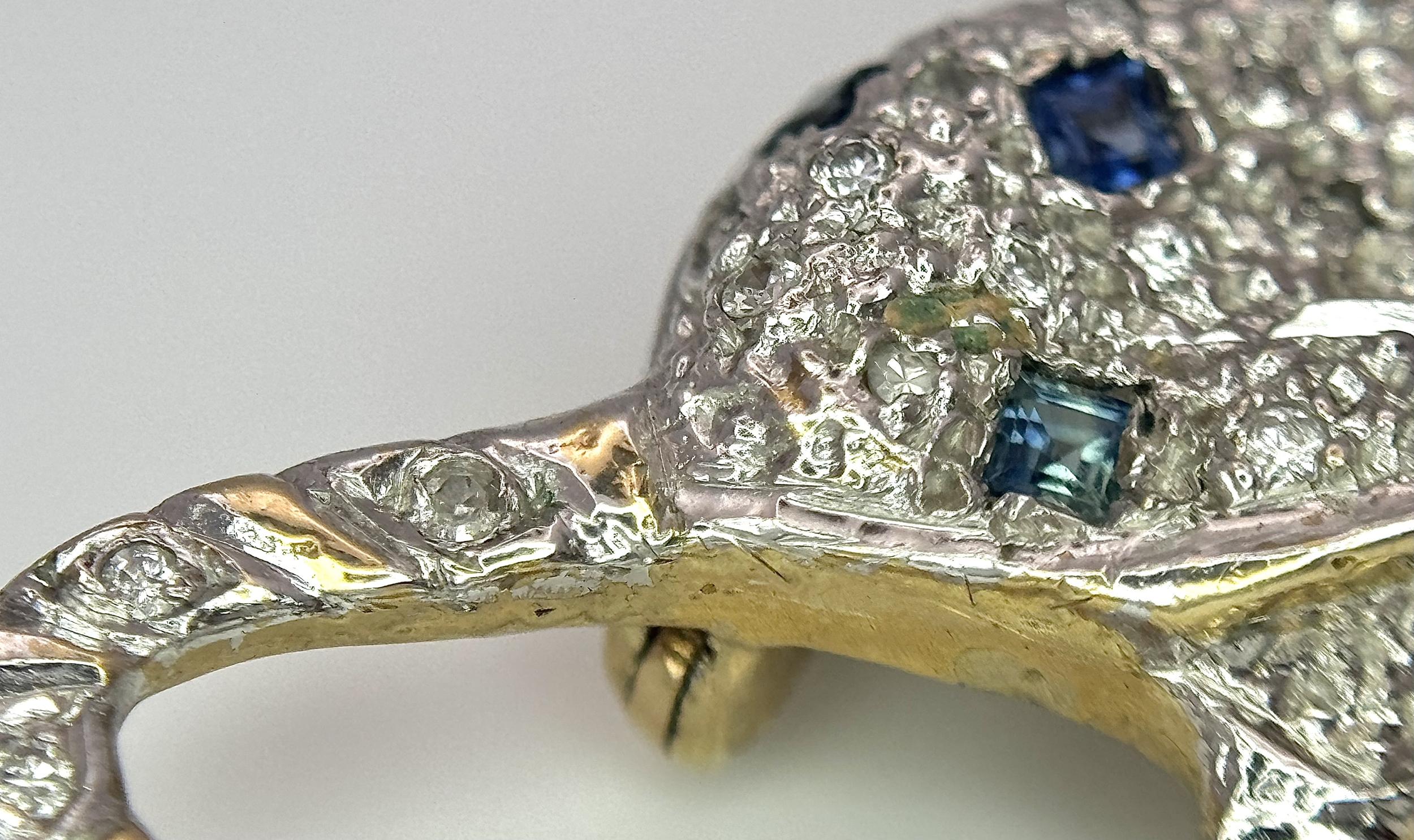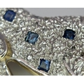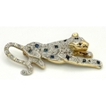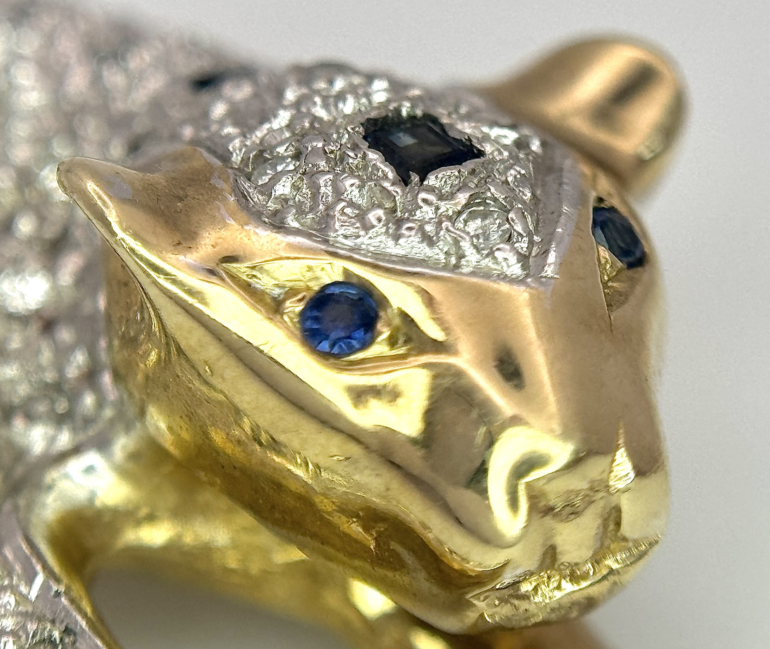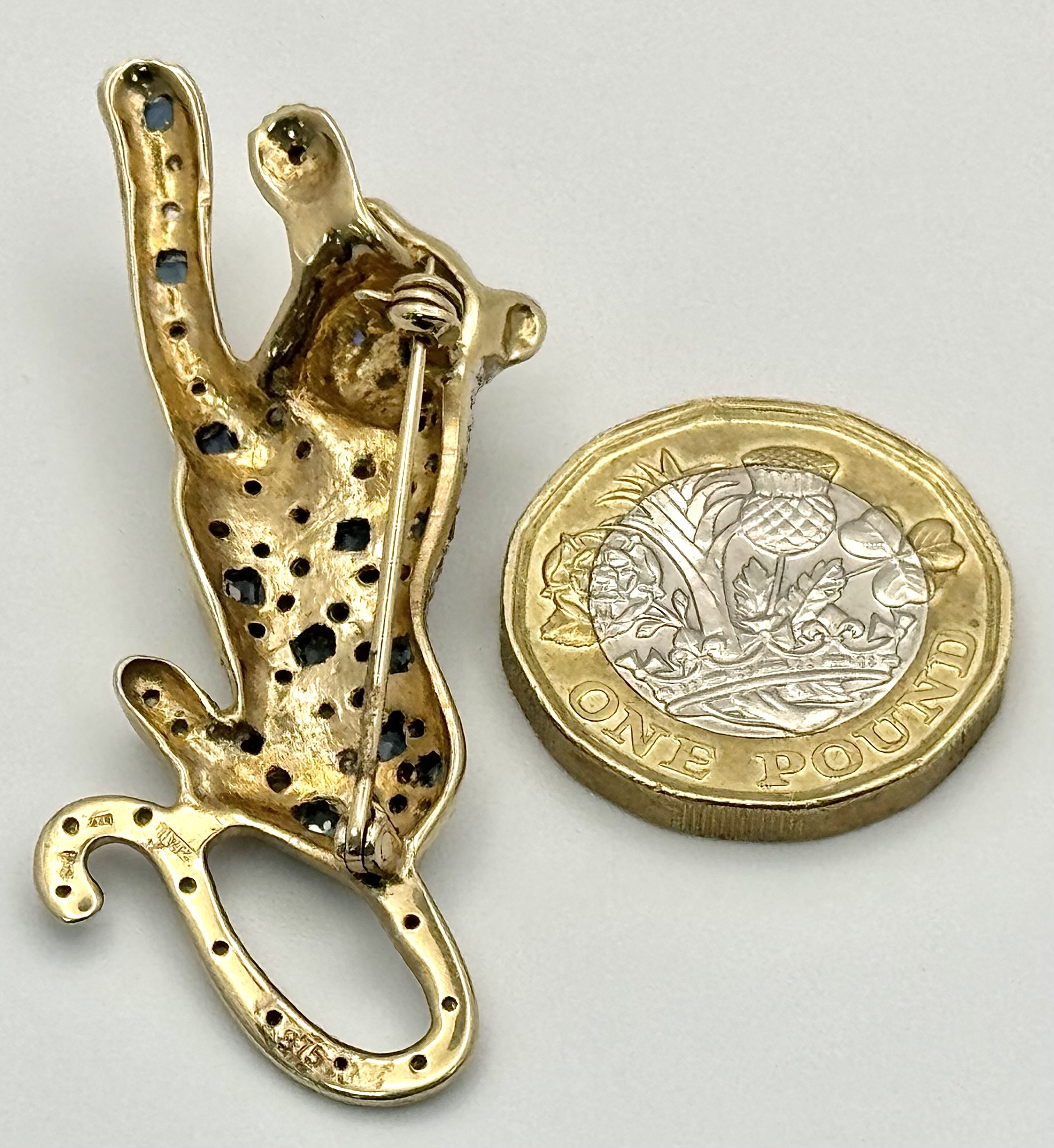 A Playful 9K Gold, Diamond and Sapphire Panther Brooch. 1ctw of diamonds and 0.5ctw of sapphires. 5cm. 11.2g total weight. One small diamond missing. NL-15A3004.