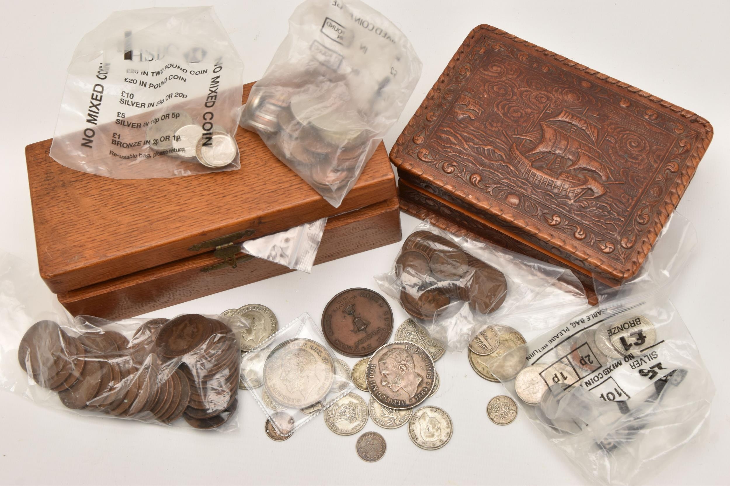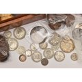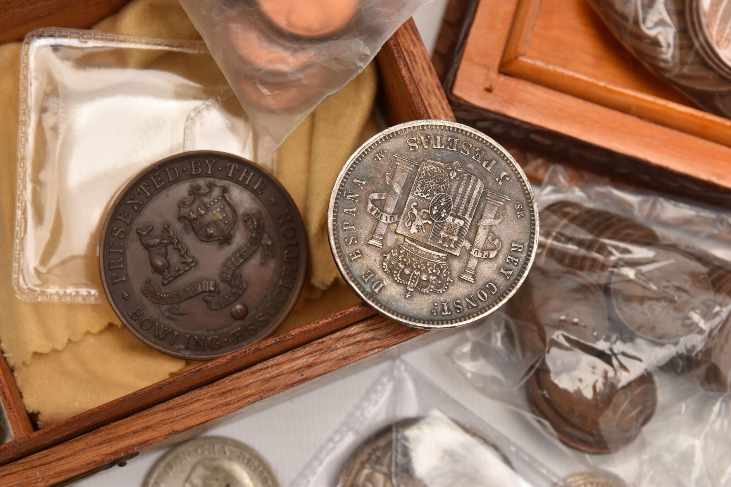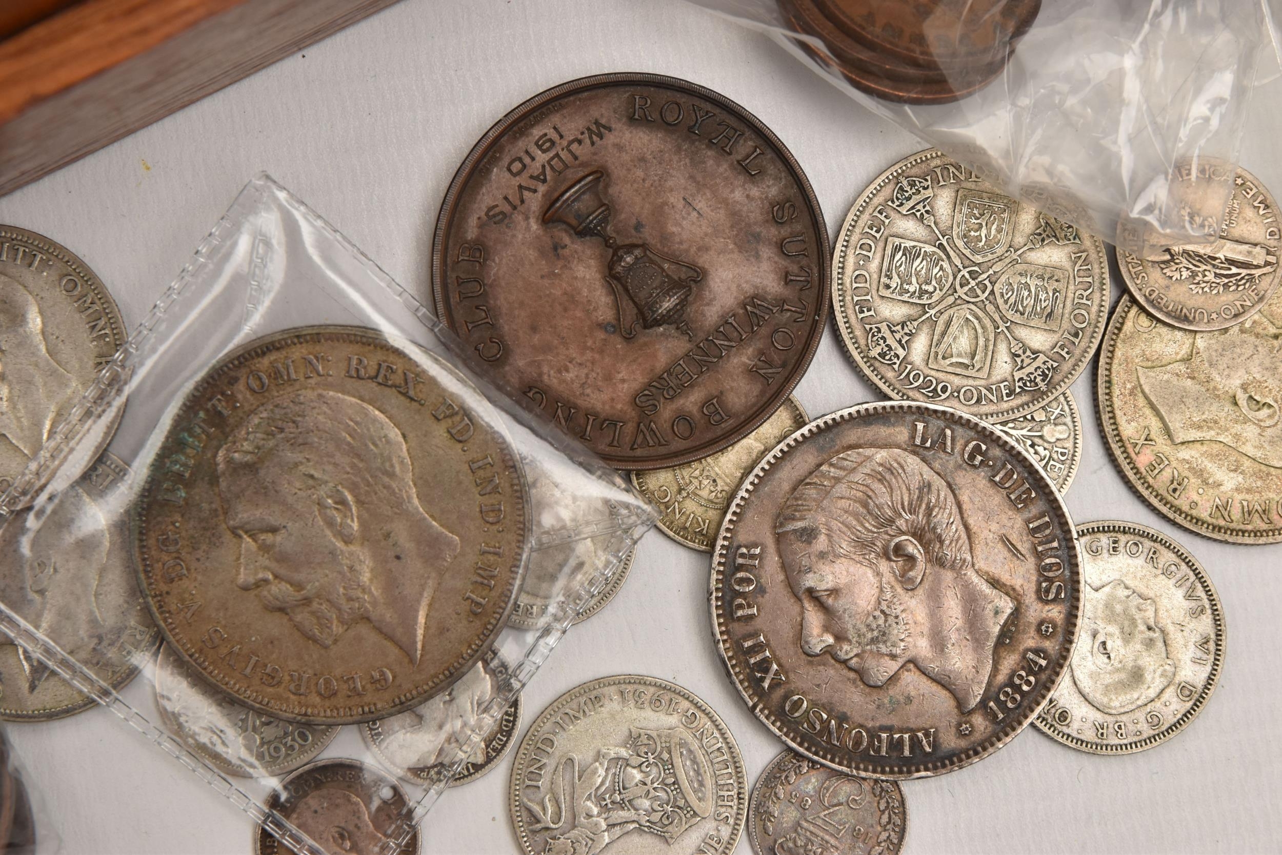 A CARDBOARD BOX CONTAINING MIXED COINS, to include an 1884 Spain Alfonso x11 5 Peseta coin, a George V great Britain 1935 Crown coin, a small amount of UK .500 Silver coins etc