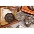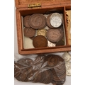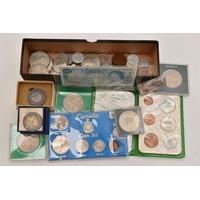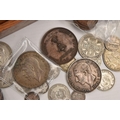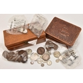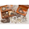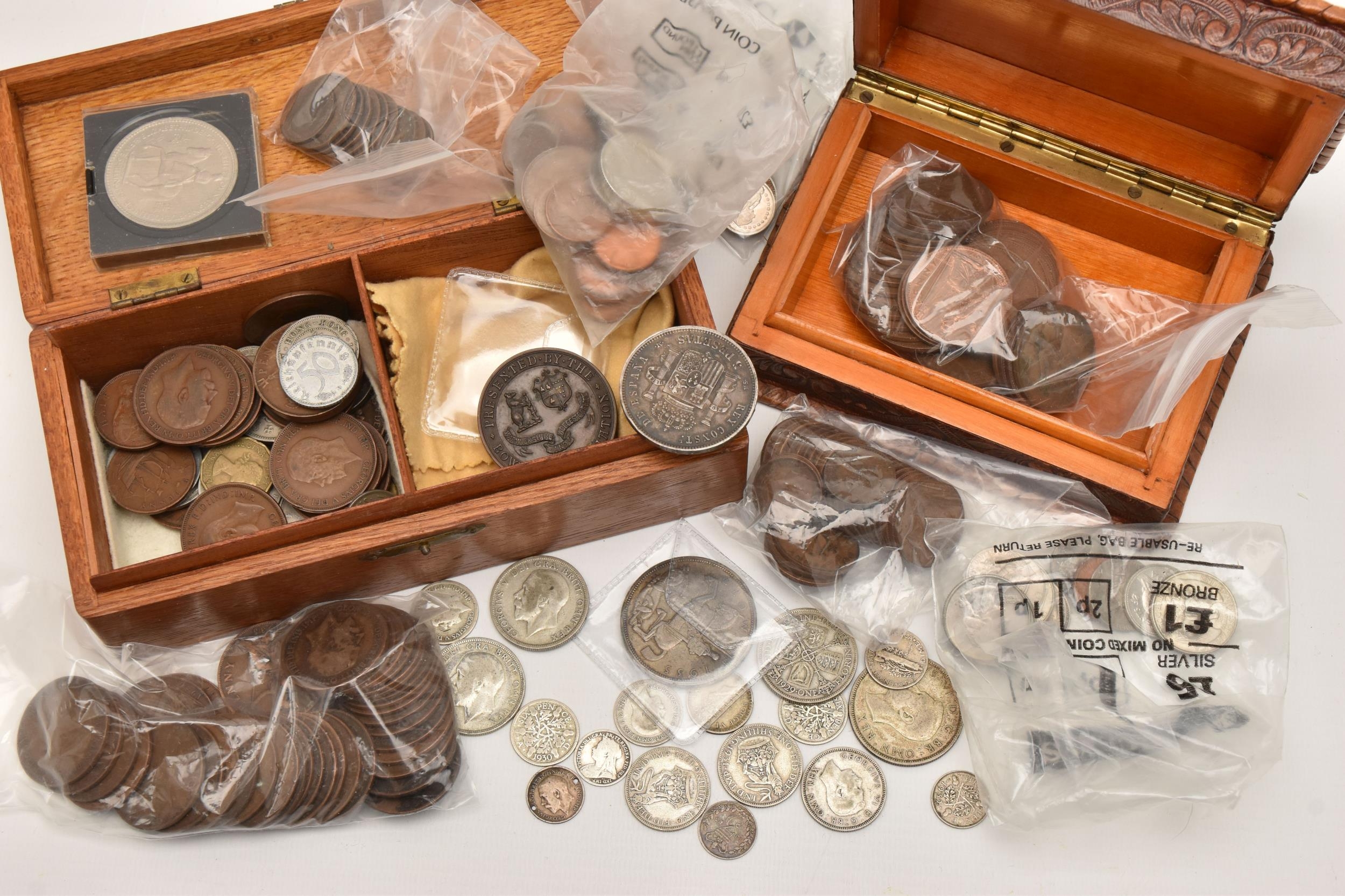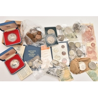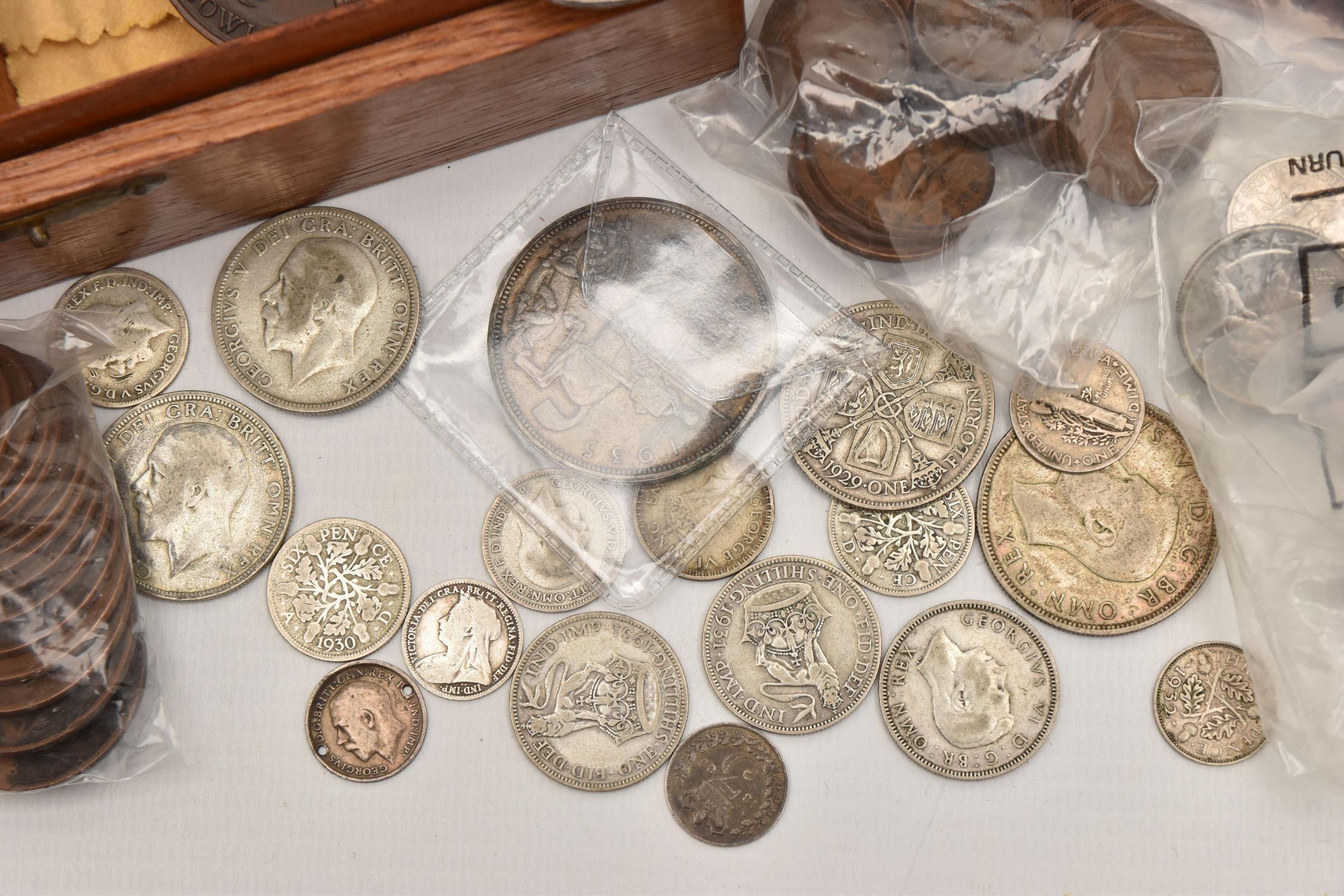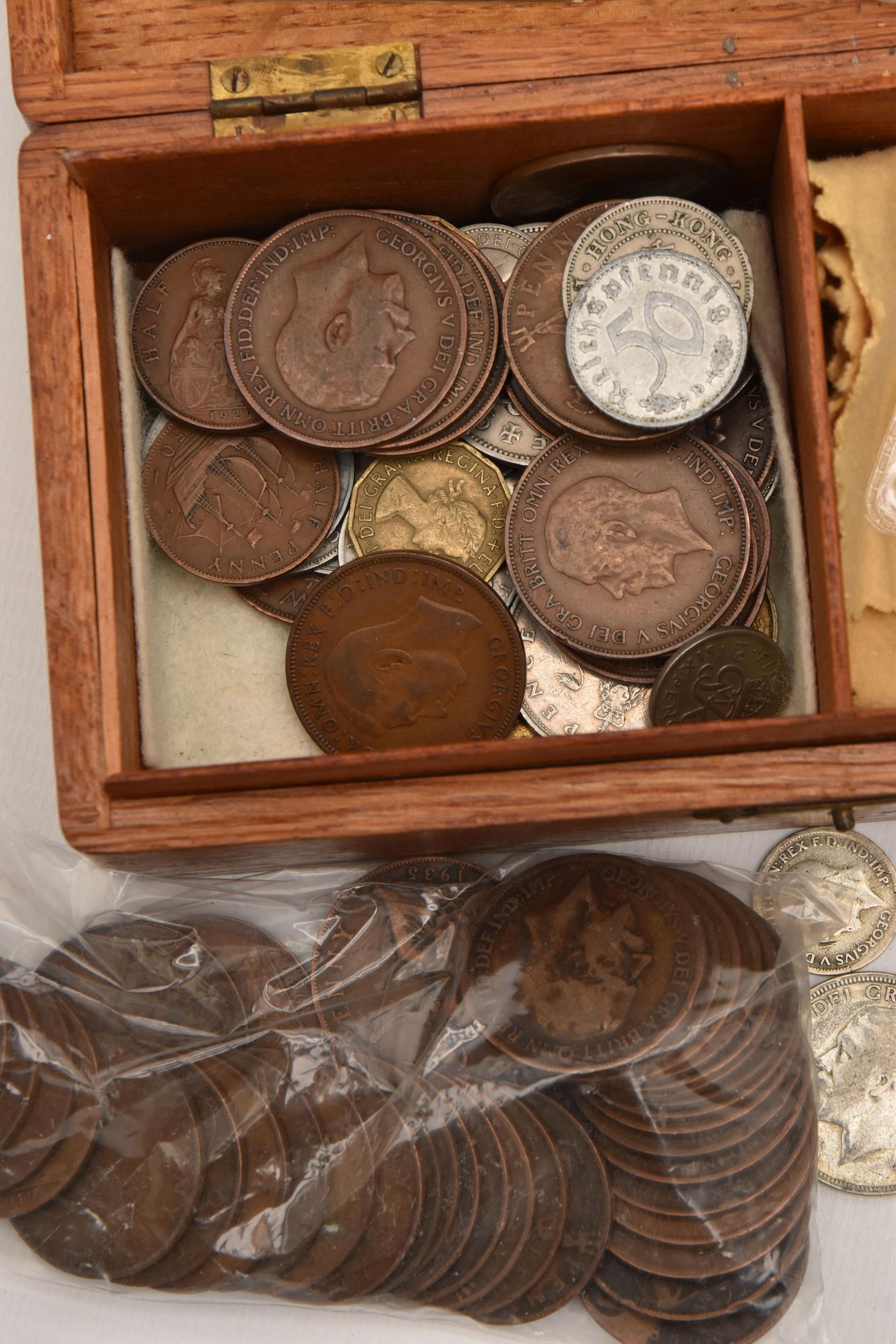 A CARDBOARD BOX CONTAINING MIXED COINS, to include an 1884 Spain Alfonso x11 5 Peseta coin, a George V great Britain 1935 Crown coin, a small amount of UK .500 Silver coins etc