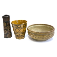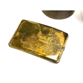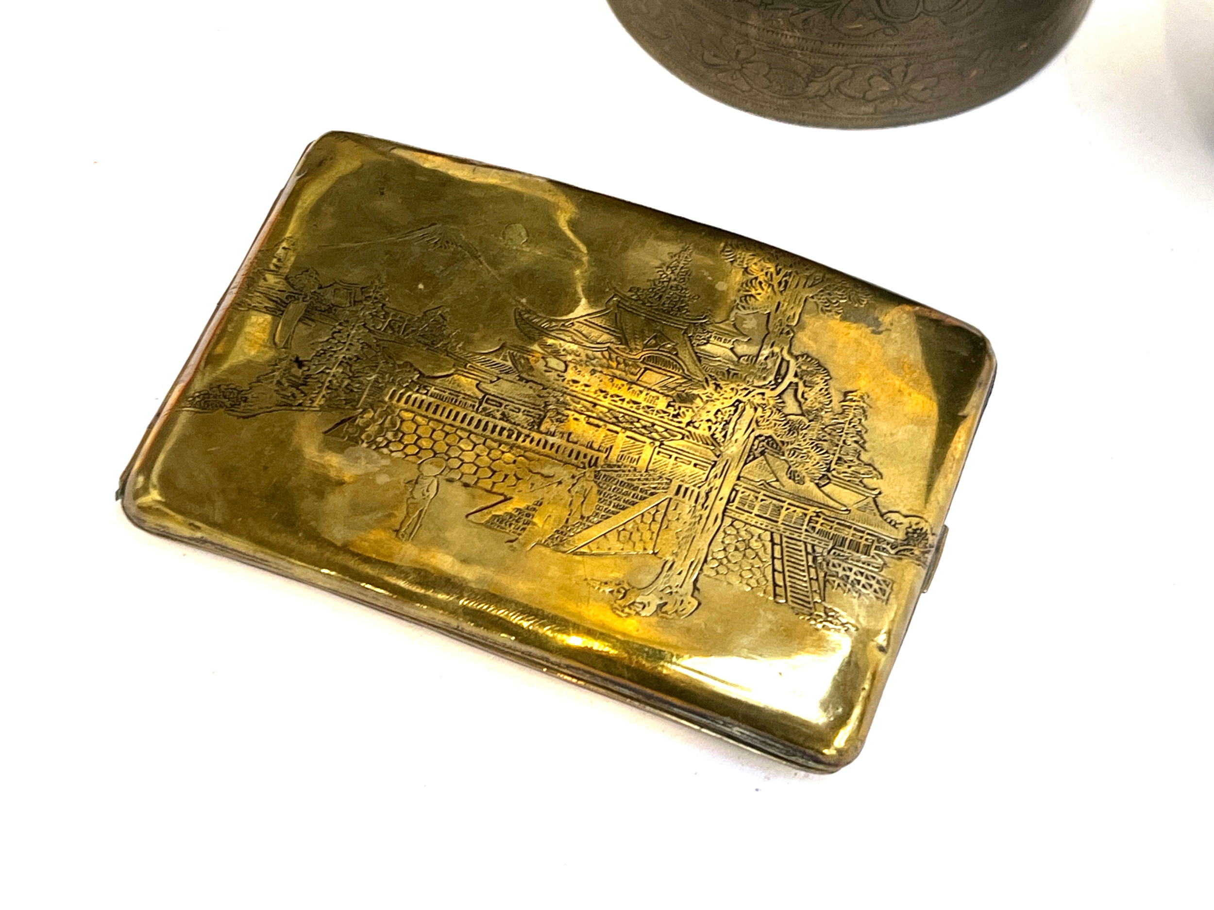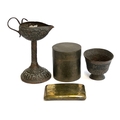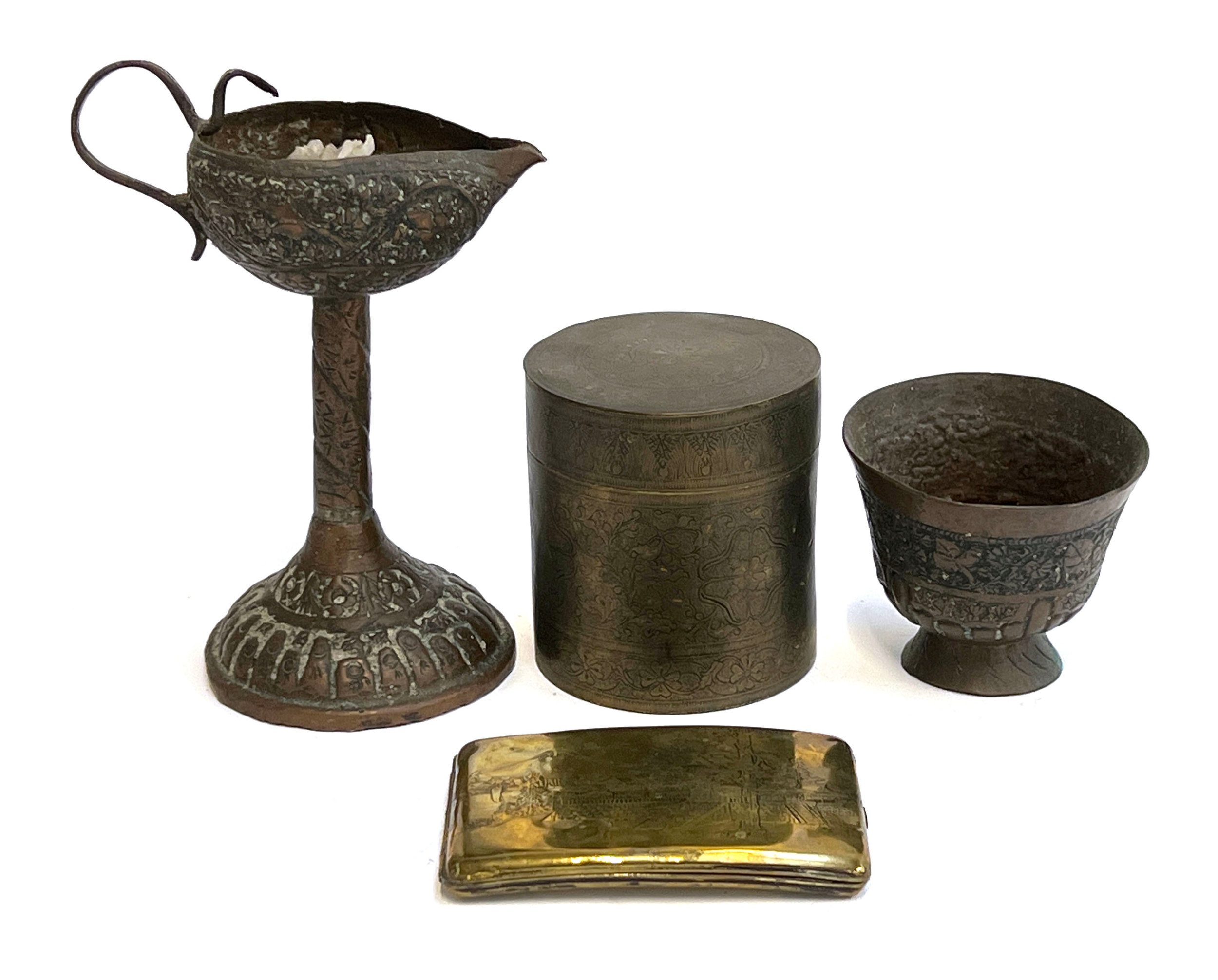 A mixed lot of metal items to include a Japanese engraved brass cigarette case, 12cmW, cylindrical tea canister, Indian copper oil lamp/alter candlestick, 19cmH