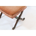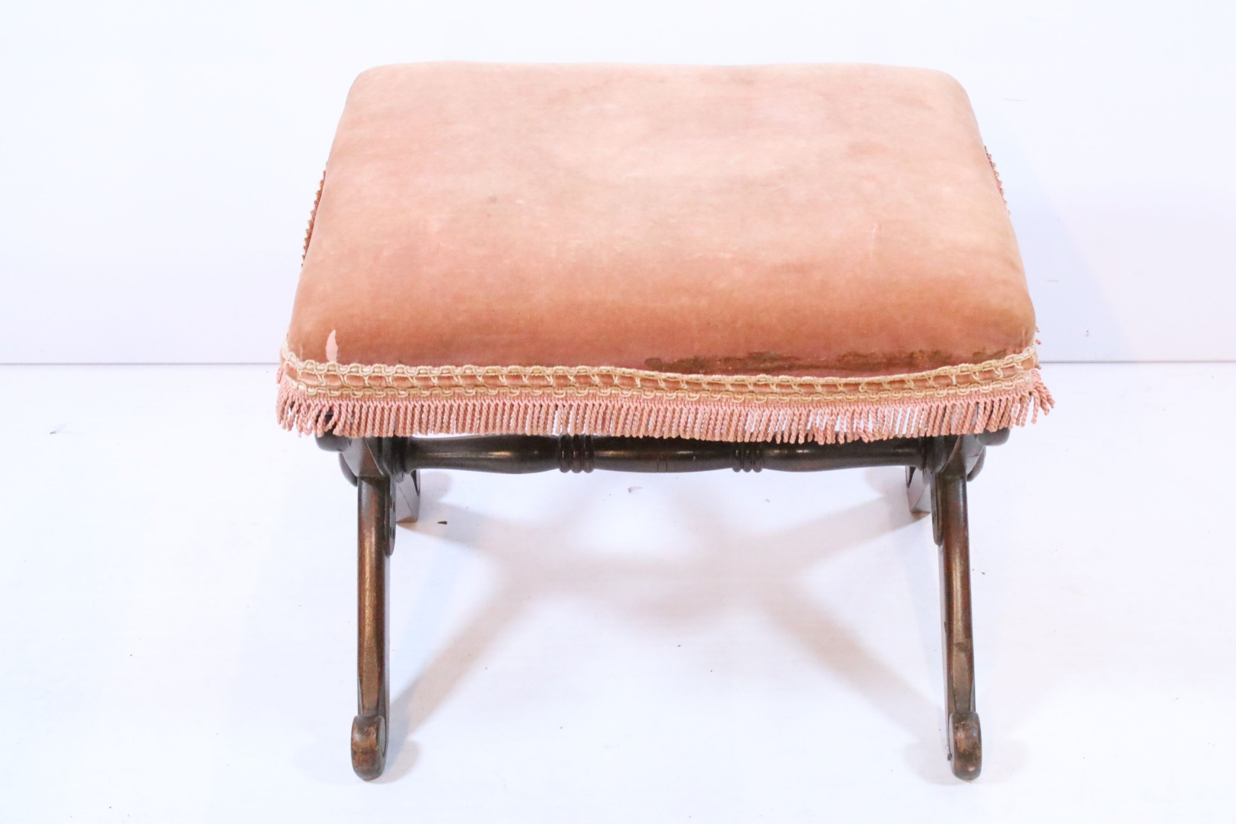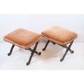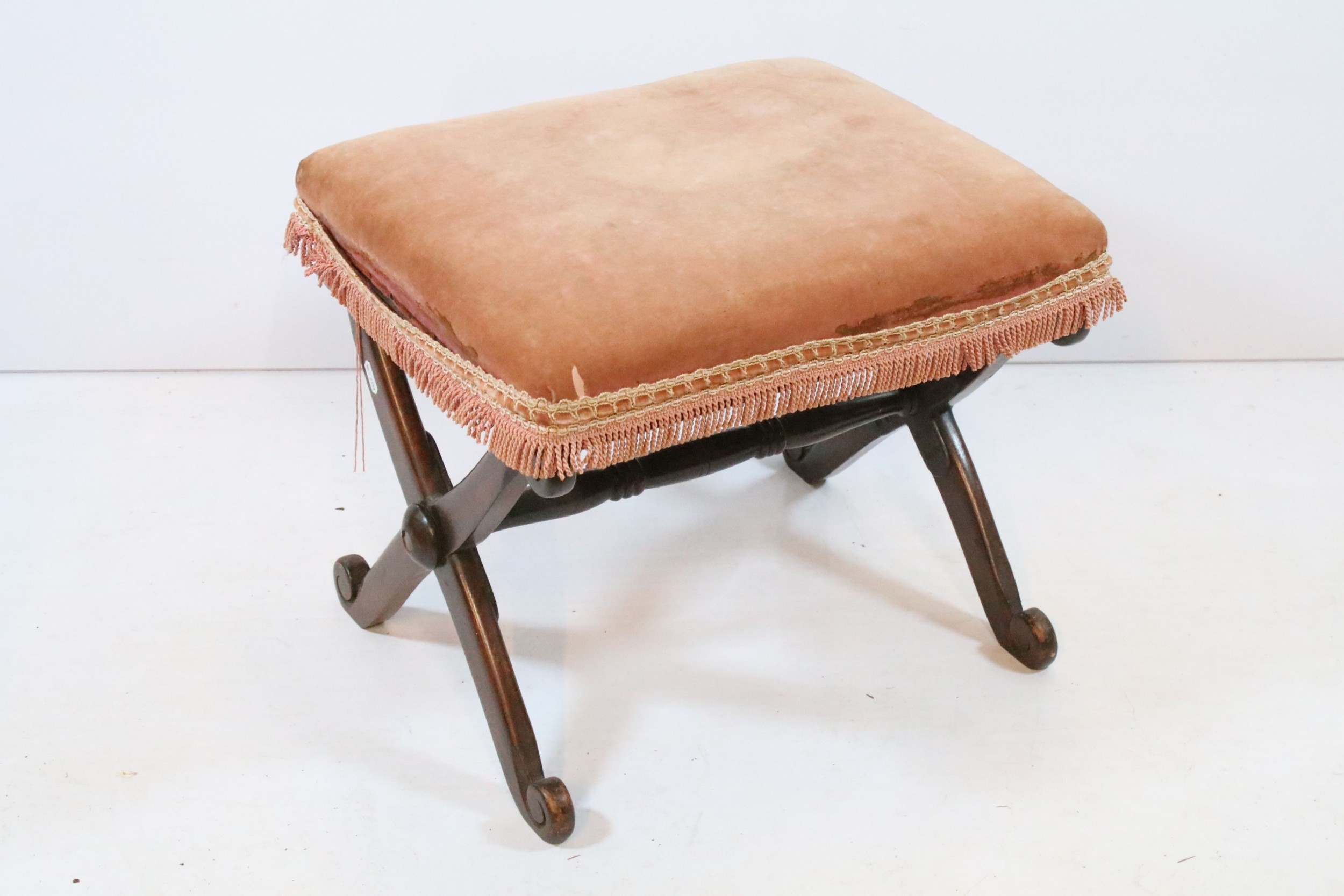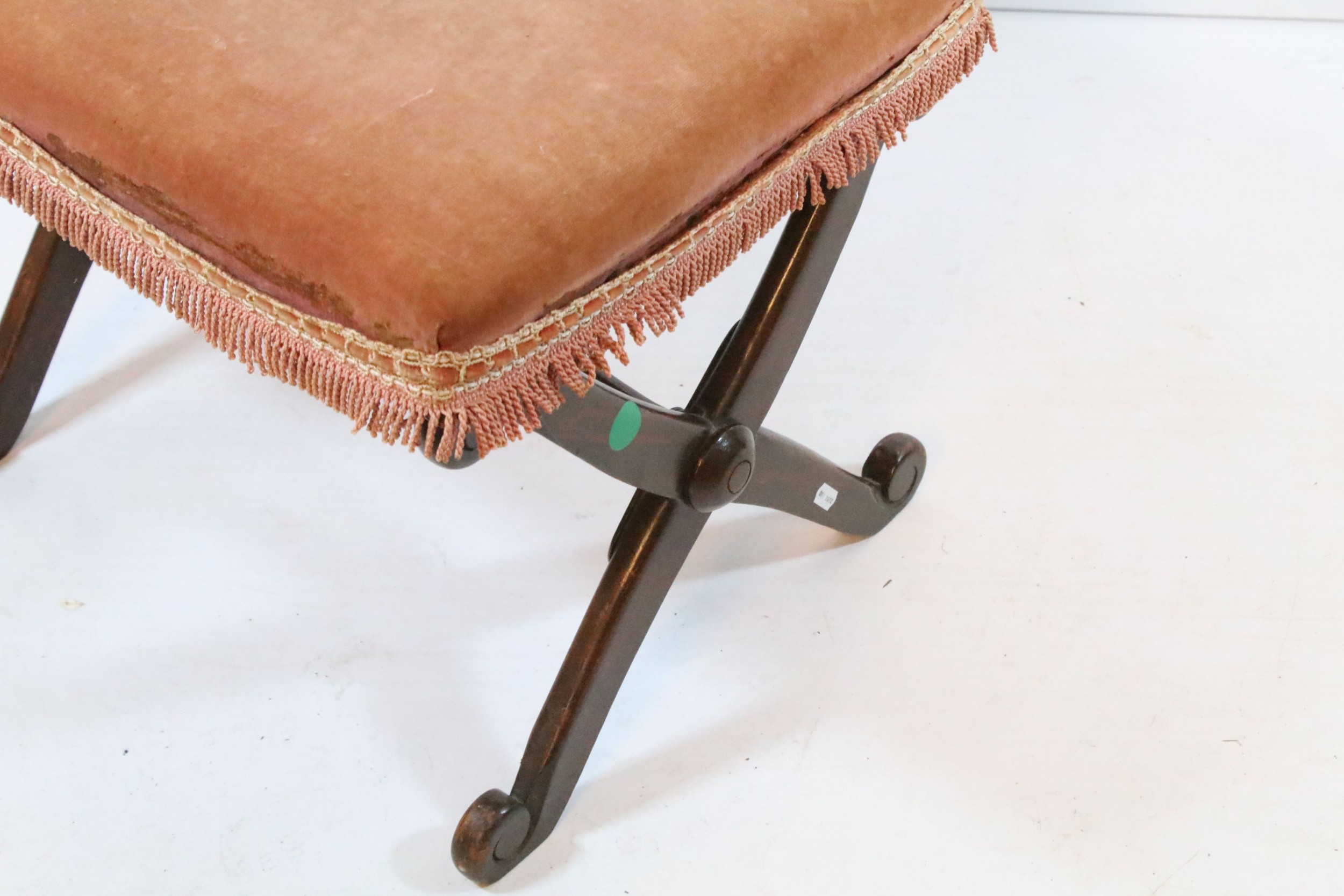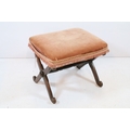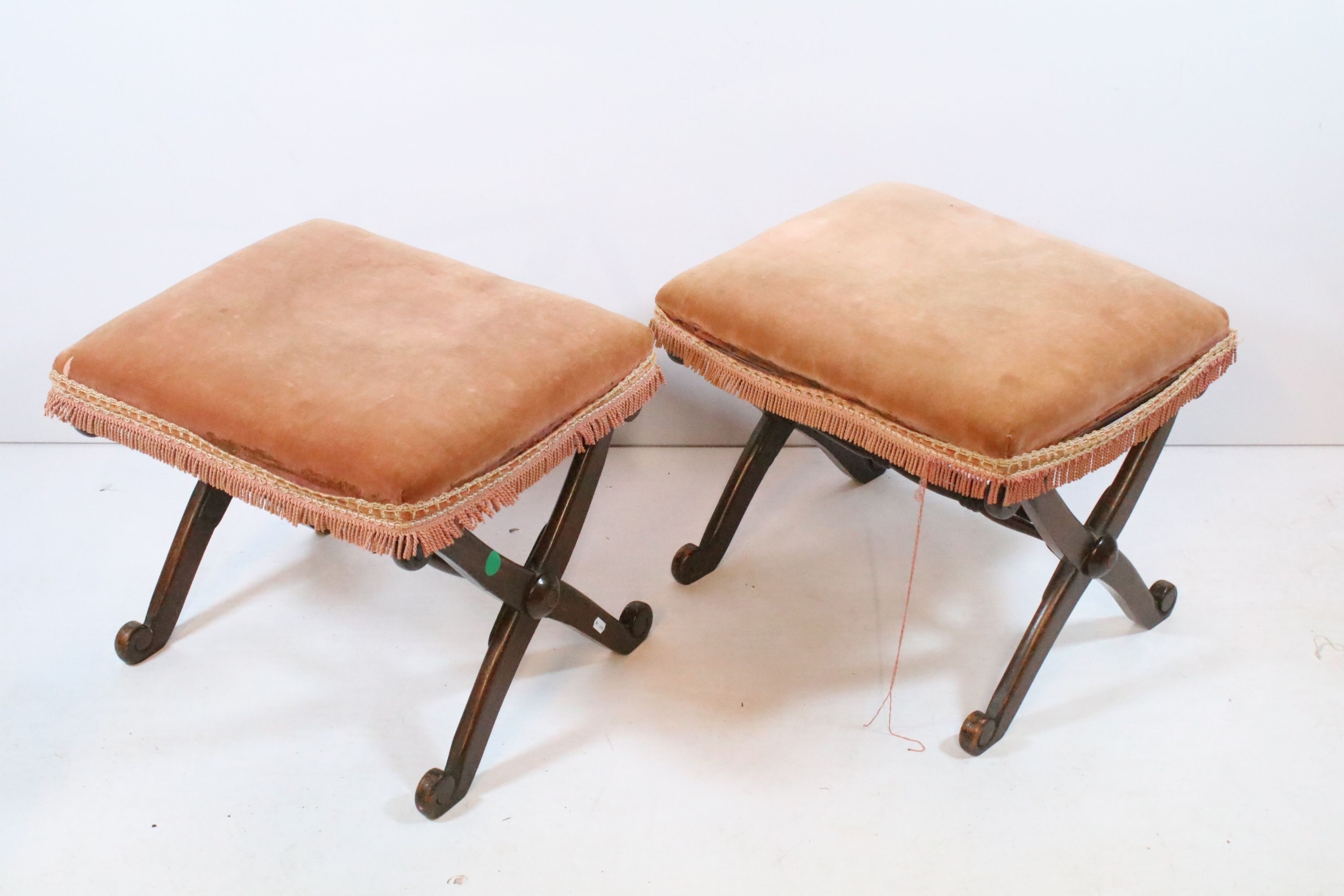 Two early 20th century mahogany framed stools, having X frames, with pink upholstered cushion, 48cm x 40cm x H 40cm (2)