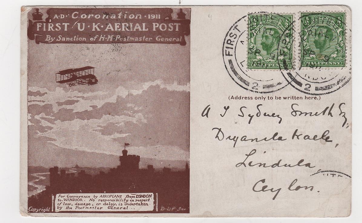Ceylon. 1911 (Sep 9) Brown London to Windsor postcard with two KGV ½d stamps tied by Aerial Post code "2" datestamps, addressed to Lindula, Ceylon, backstamped at Colombo (Sep 30) and Lindula (Oct 1), a fine card to an uncommon destination.