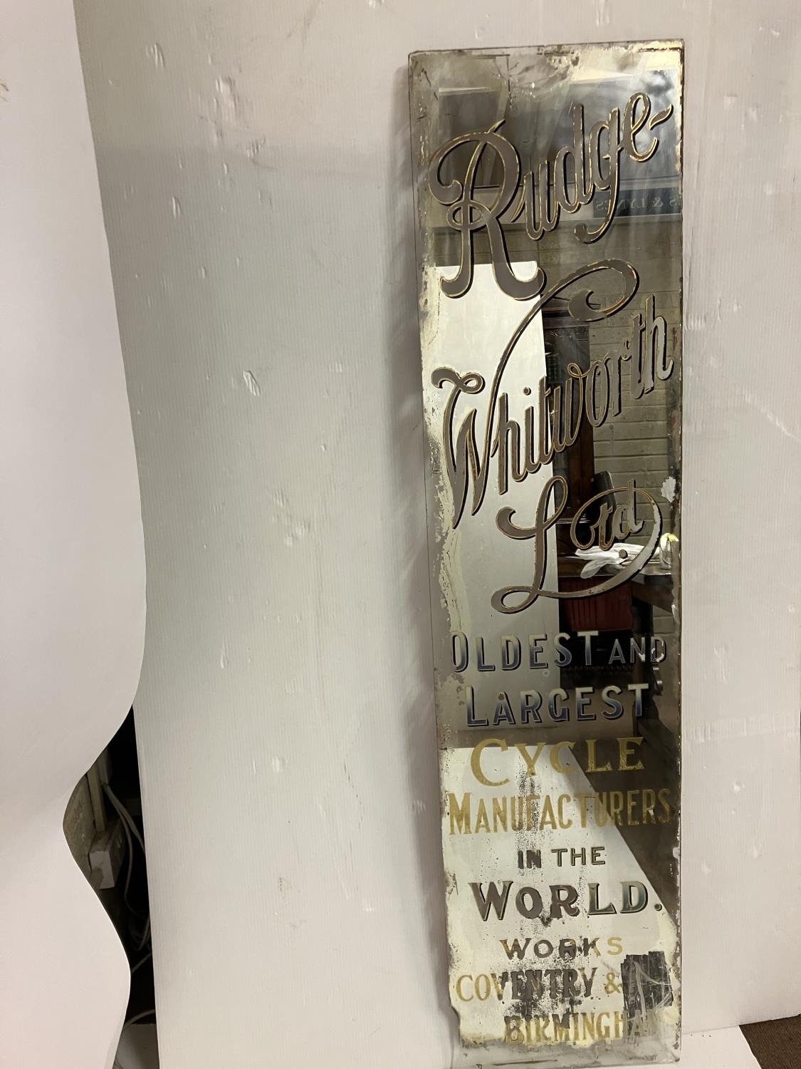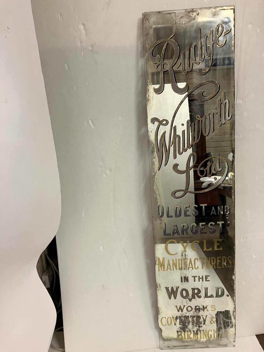 Old Bicycle Advertising mirror - Rudge Whitworth Ltd, Oldest and largest Cycle Manufacturers in the World, Works at Coventry and Birmingham. H. 174cm x W. 42cm.