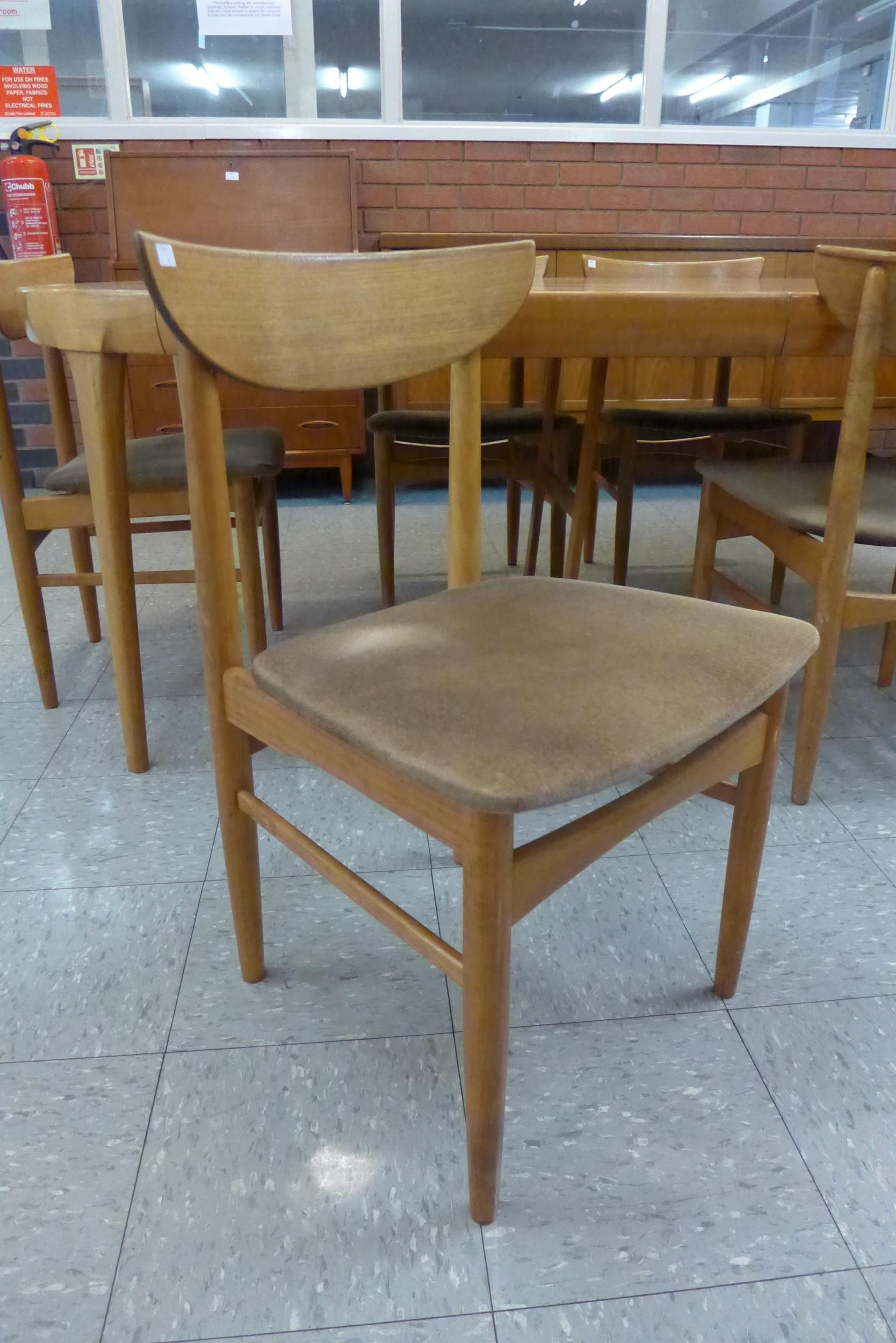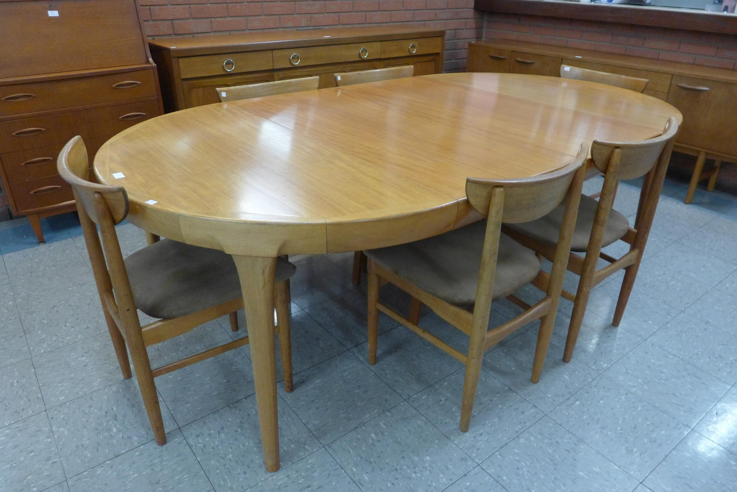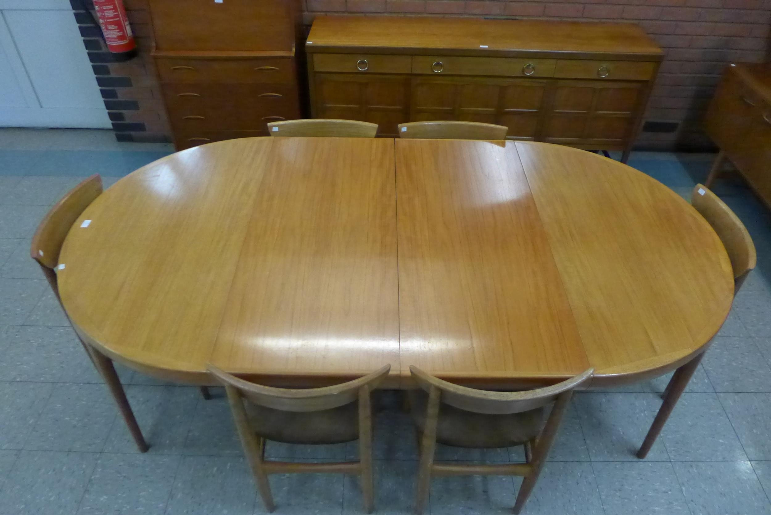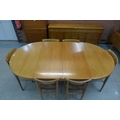 A Danish Faarup Mobelfabrik teak extending dining table, designed by Ib Kofod Larsen and six chairs