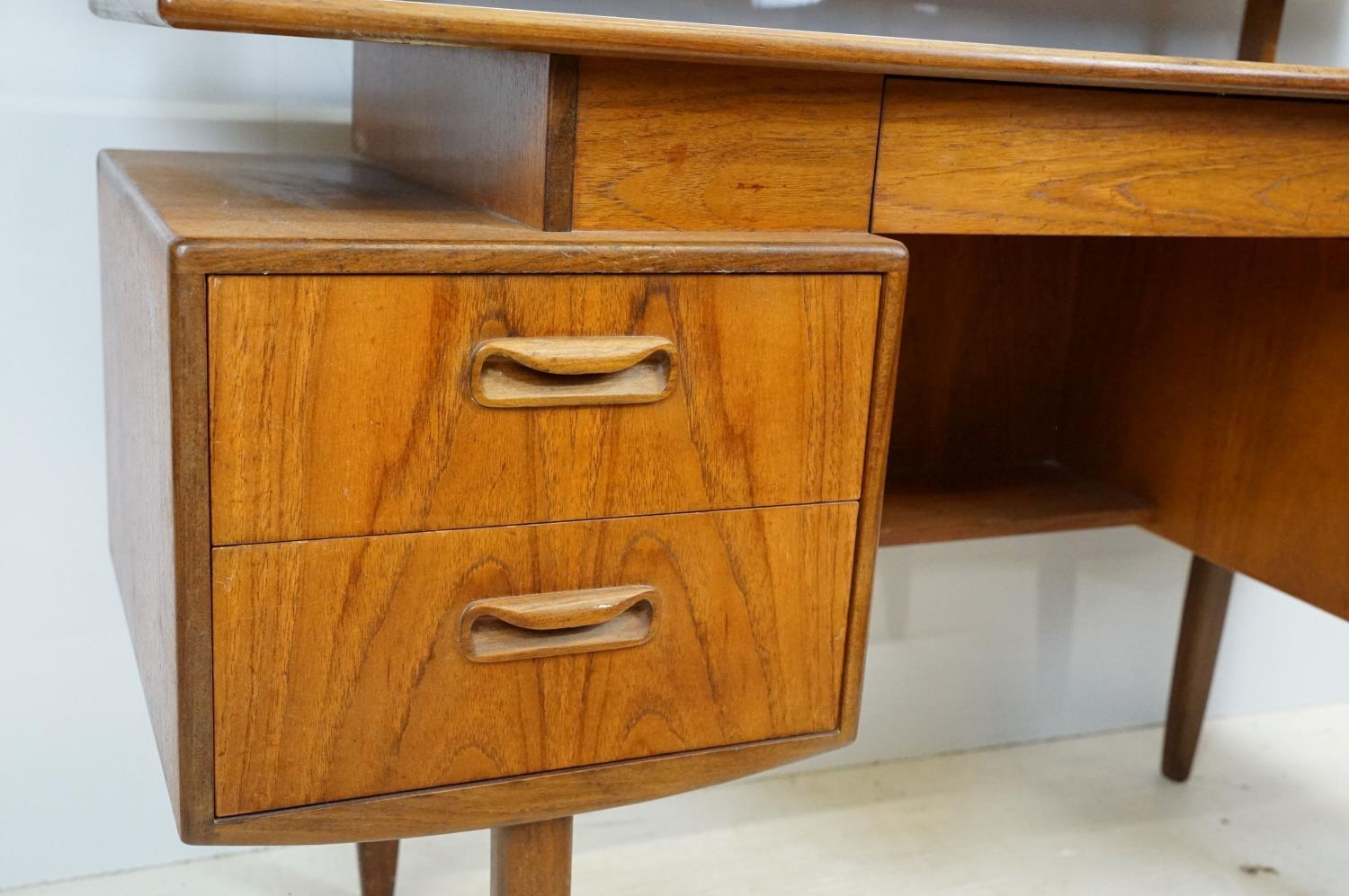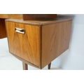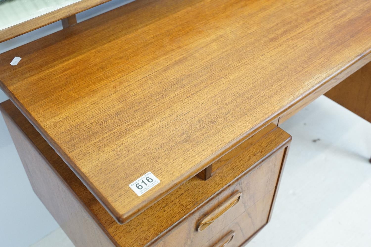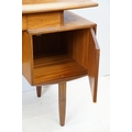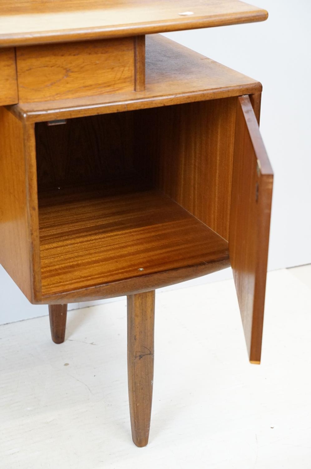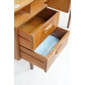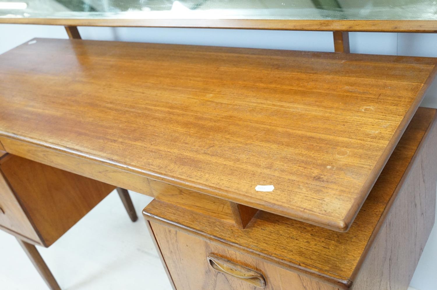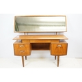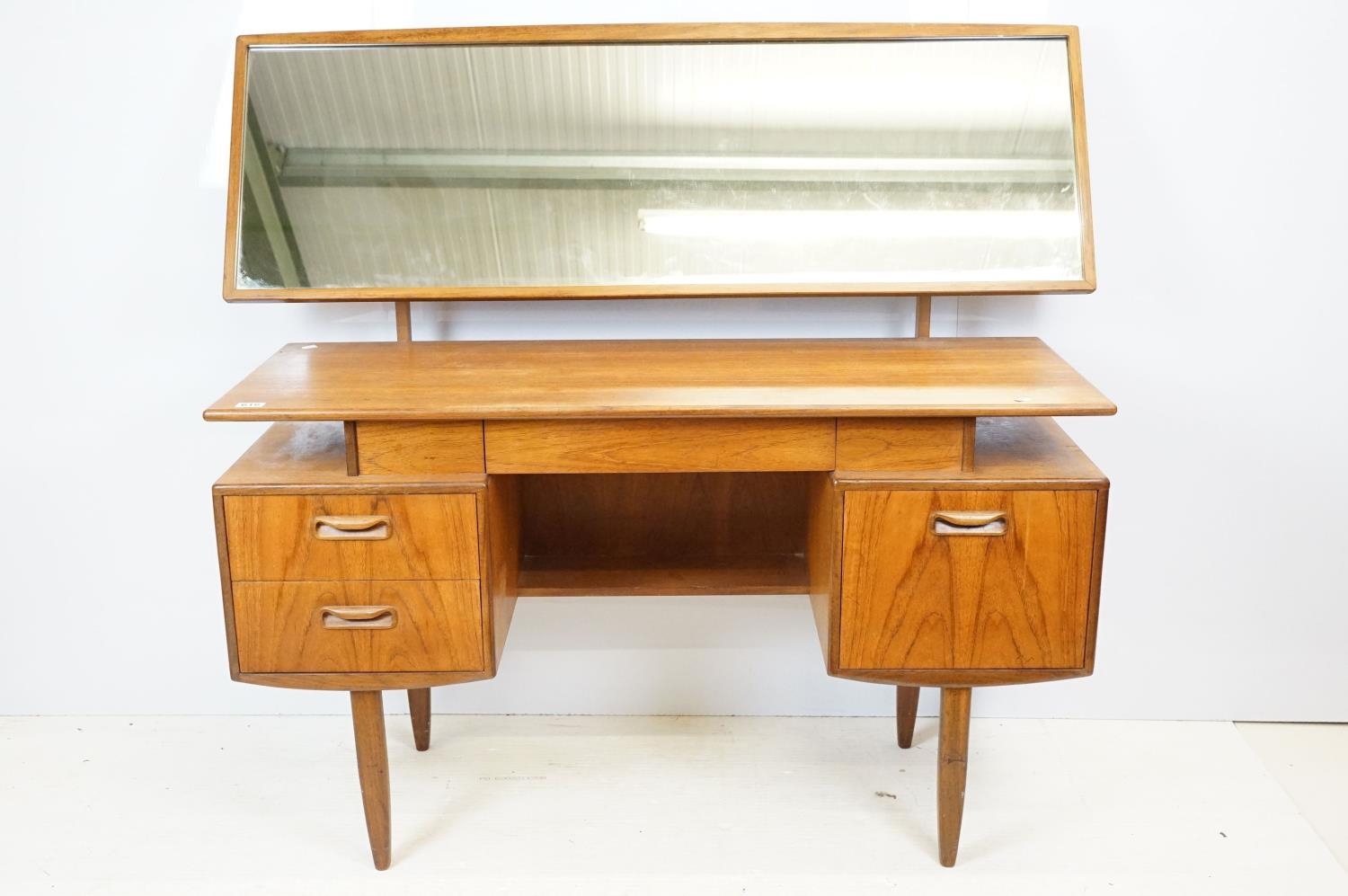 G Plan teak dressing table, with angled mirrored back, above an arrangement of three drawers and a cupboard on tapering leg, label inside cupboard, 74cm high x 138cm wide x 49cm deep