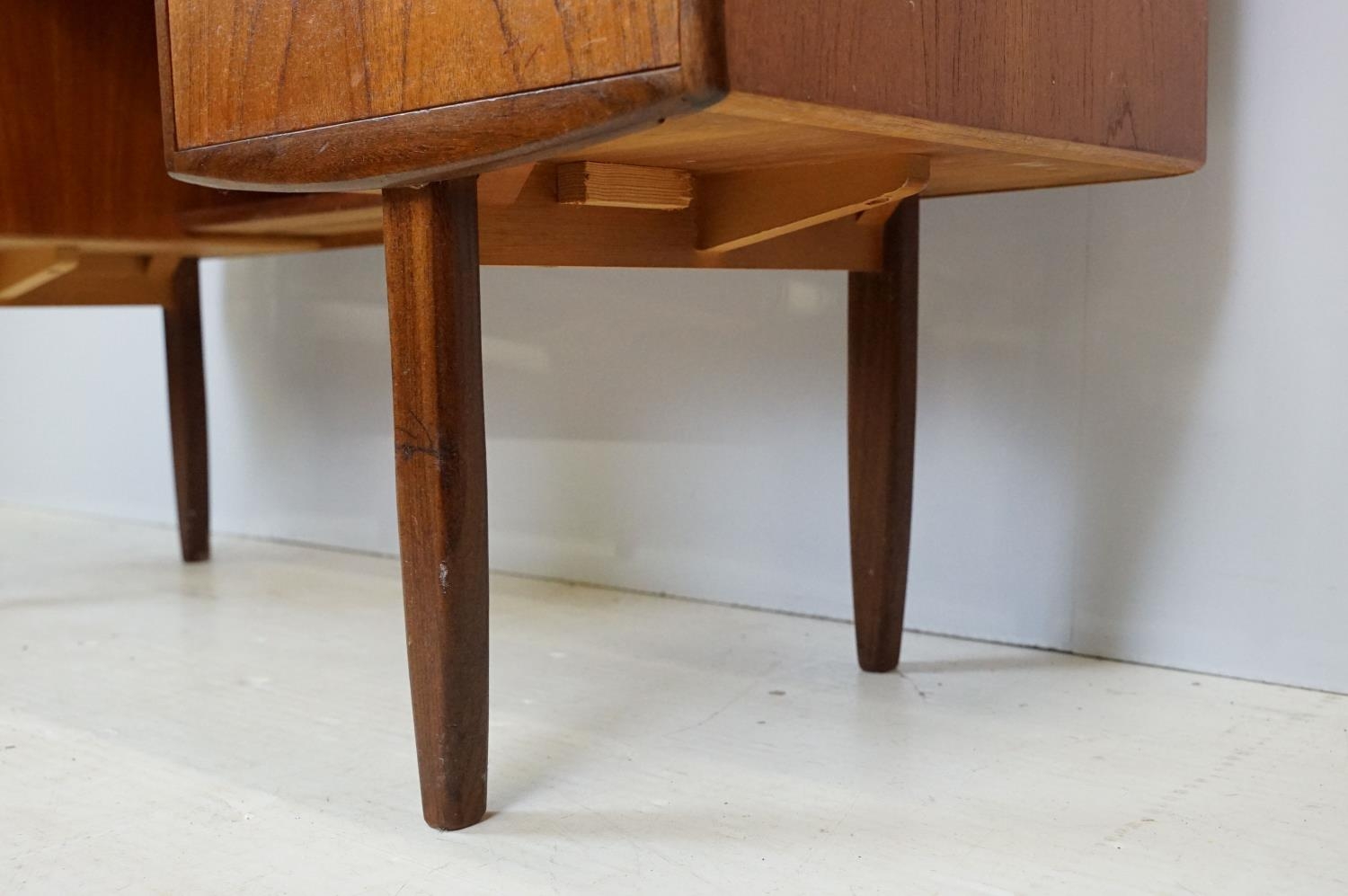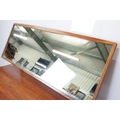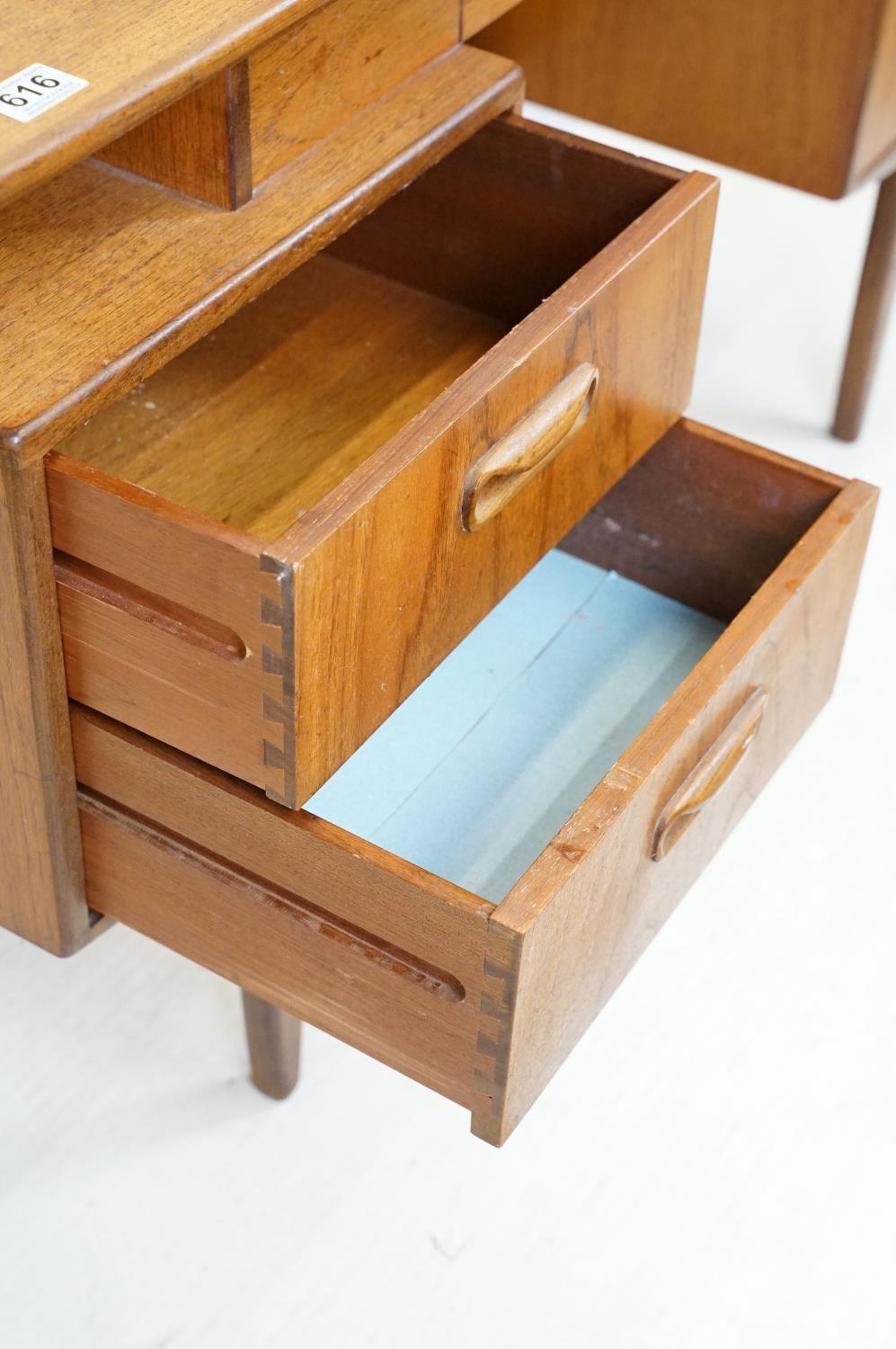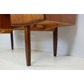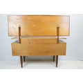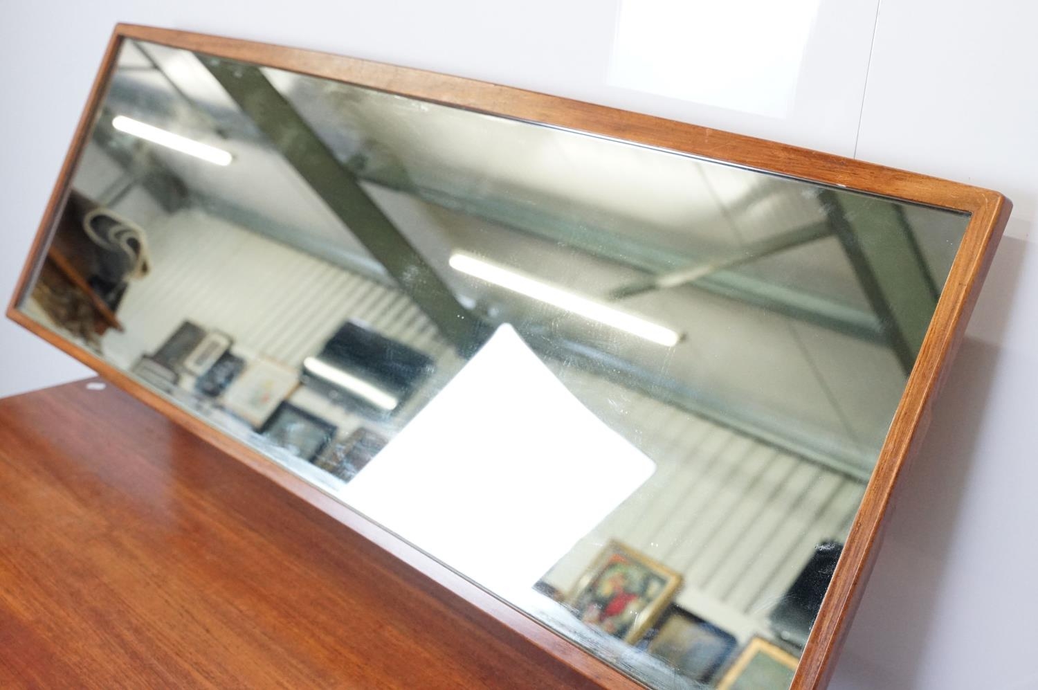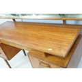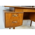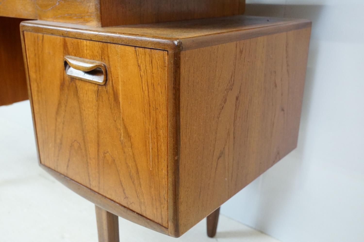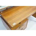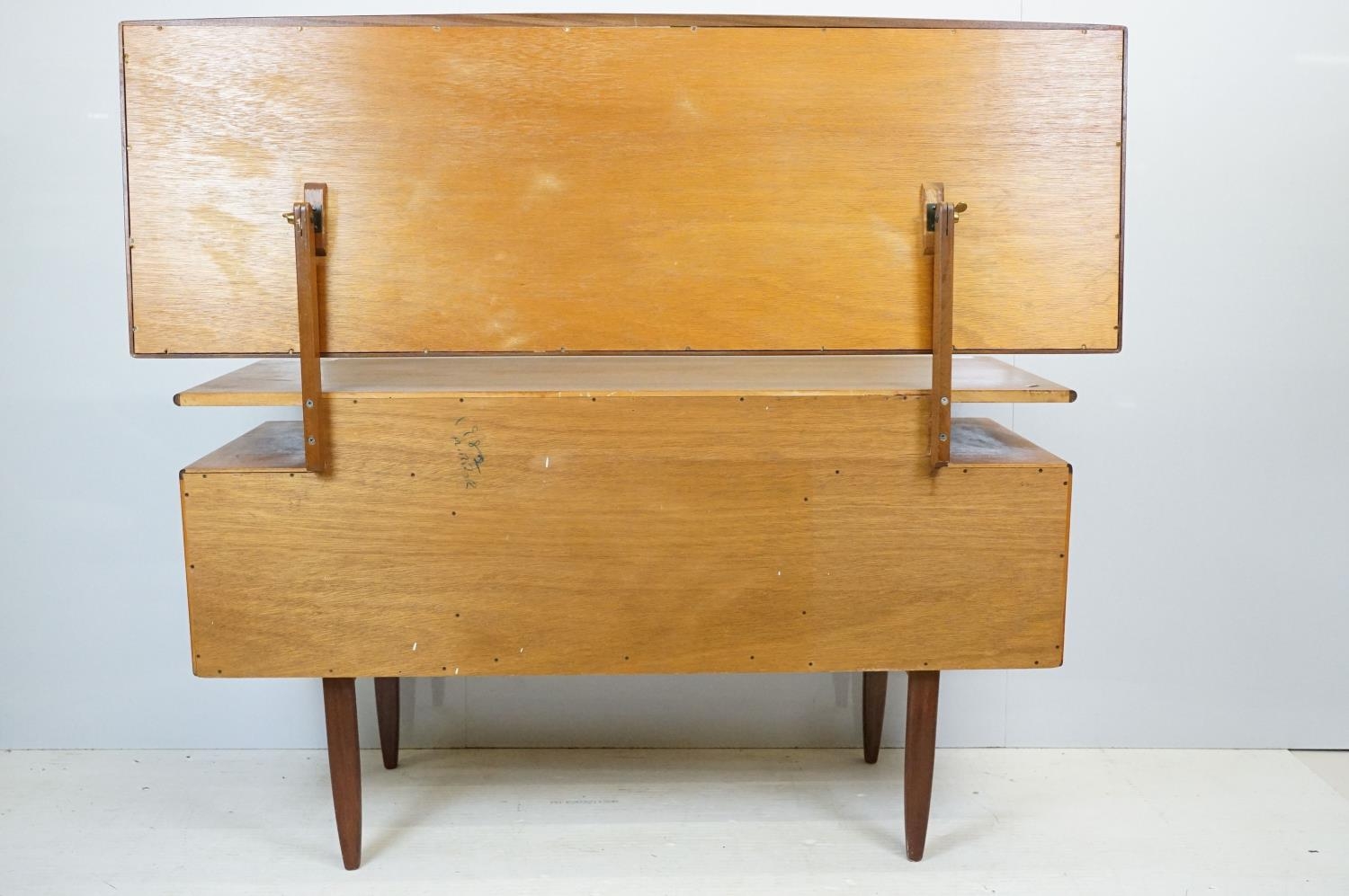 G Plan teak dressing table, with angled mirrored back, above an arrangement of three drawers and a cupboard on tapering leg, label inside cupboard, 74cm high x 138cm wide x 49cm deep