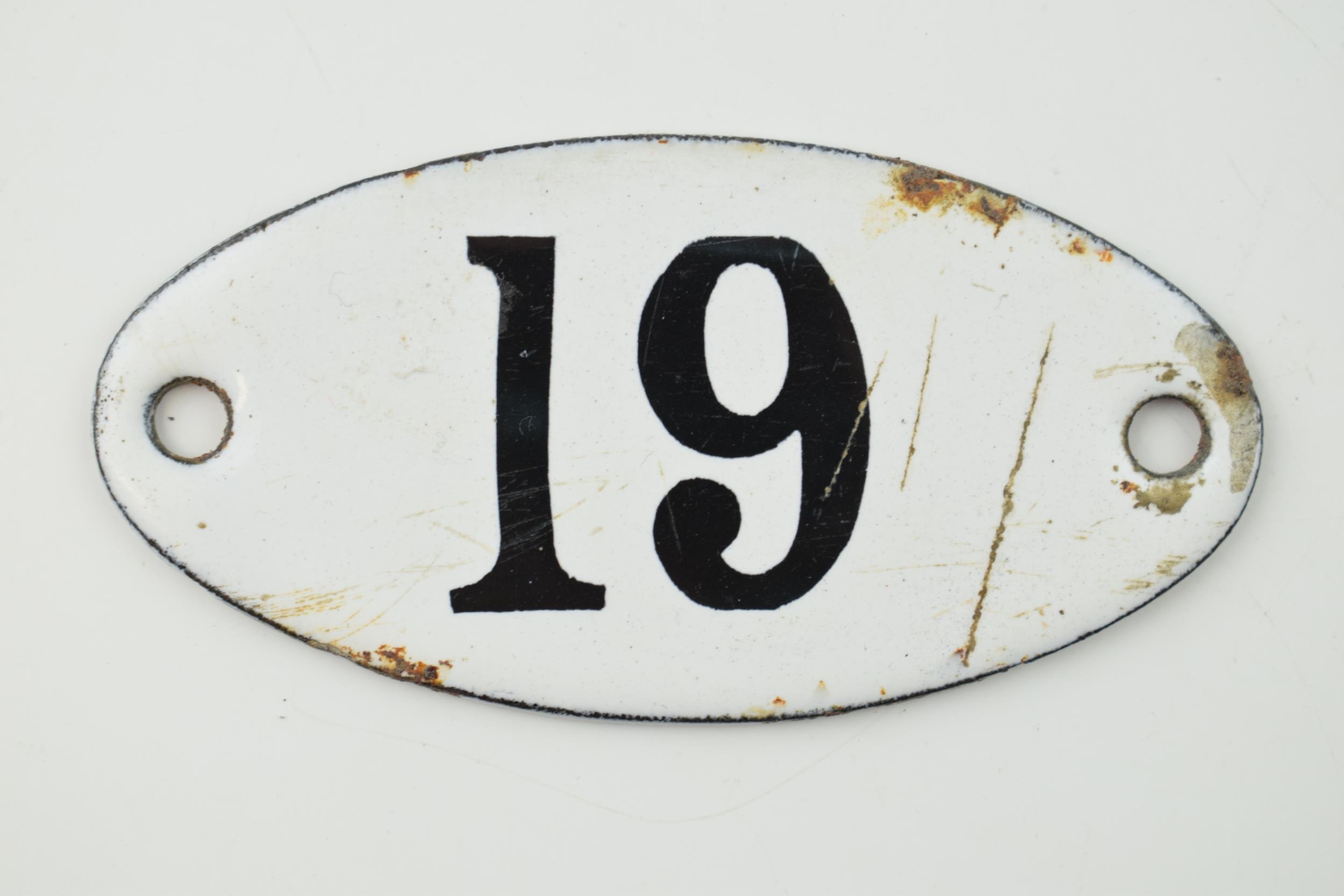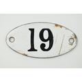Vintage enamel sign with number '19', ideal for a house name, 7.5cm wide.