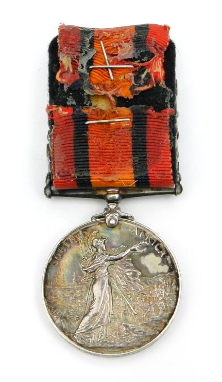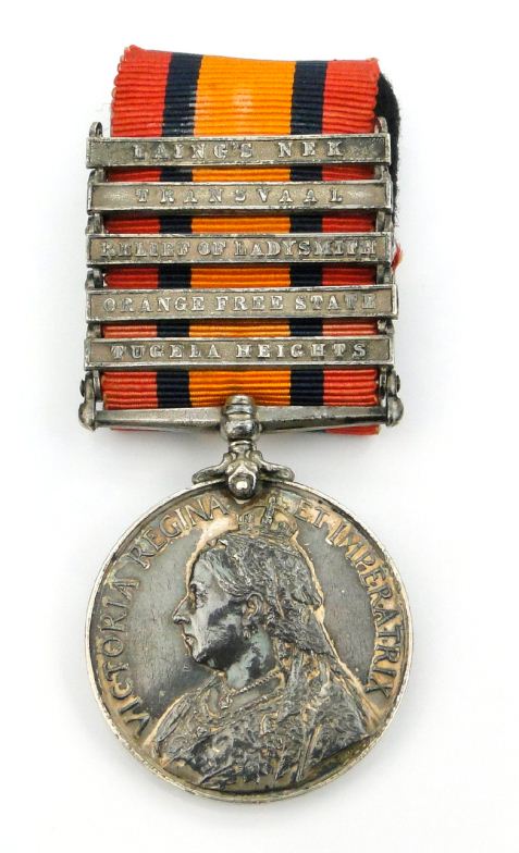 Victorian British military South Africa with Laings Nek, Transvaal, Relief of Ladysmith, Orange Free State and Tugela Heights bars, marked 4284 PTE.W.TAYLOR, 2ND E.SURREY REGT. to the rim