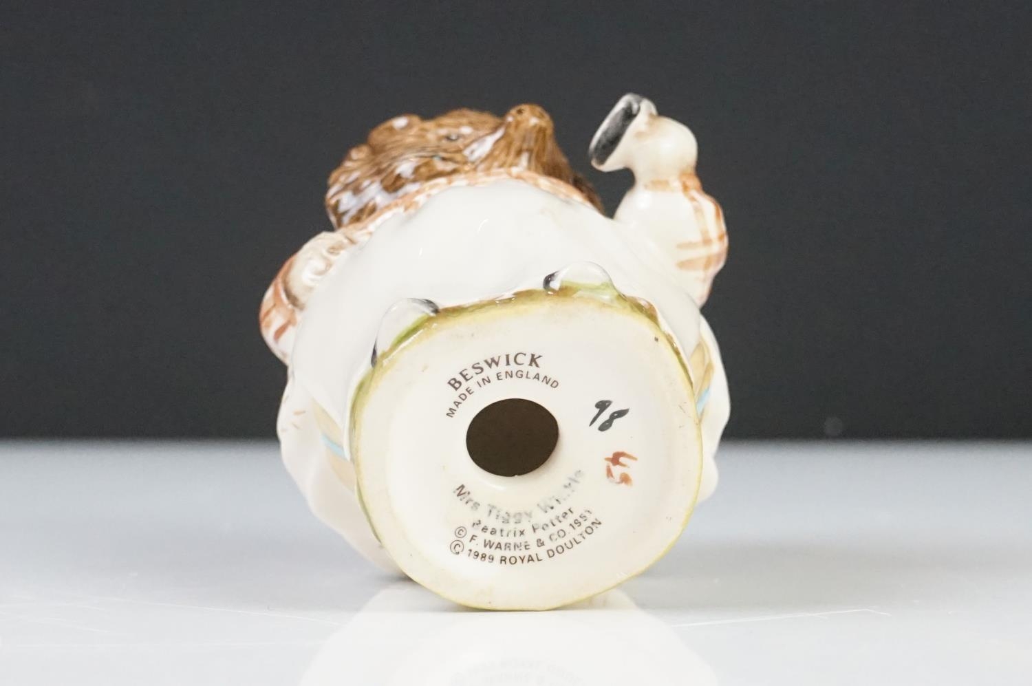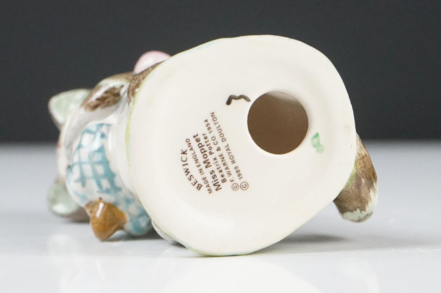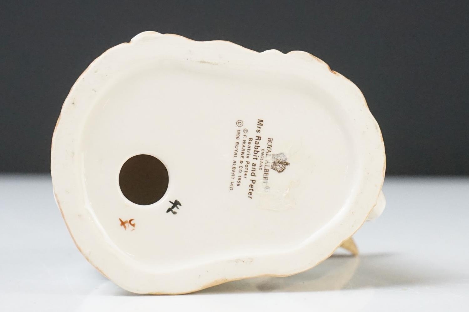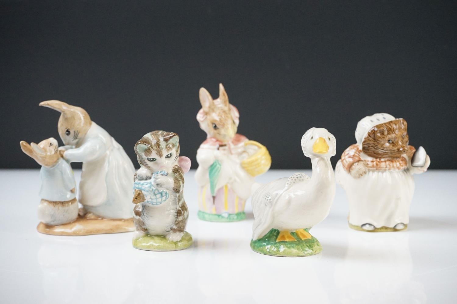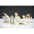 Five Beatrix Potter Figures including Beswick Miss Tiggy-winkle, Miss Moppet, Rebeccah Puiddle-duck and Mrs Rabbit plus Royal Albert Mrs Rabbit and Peter