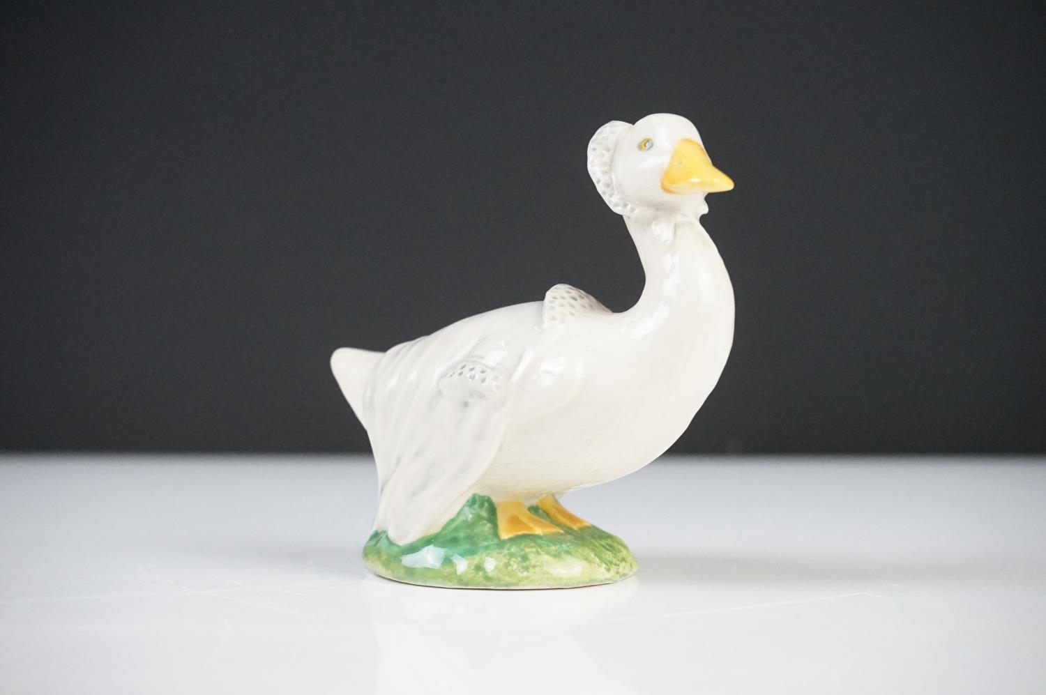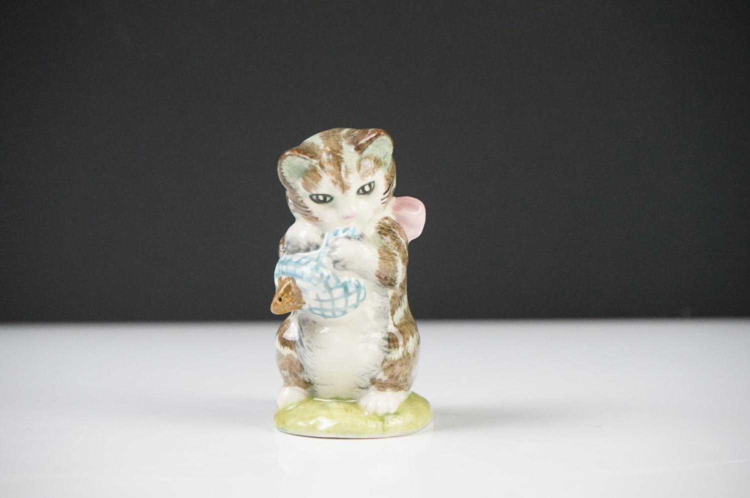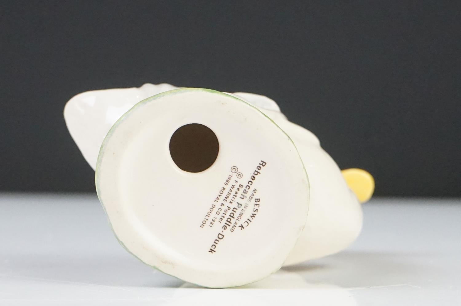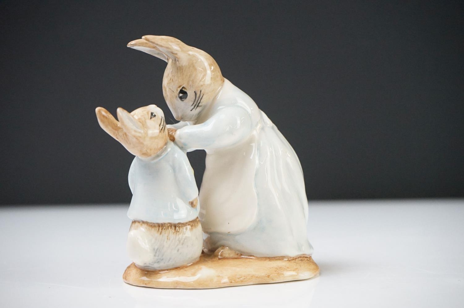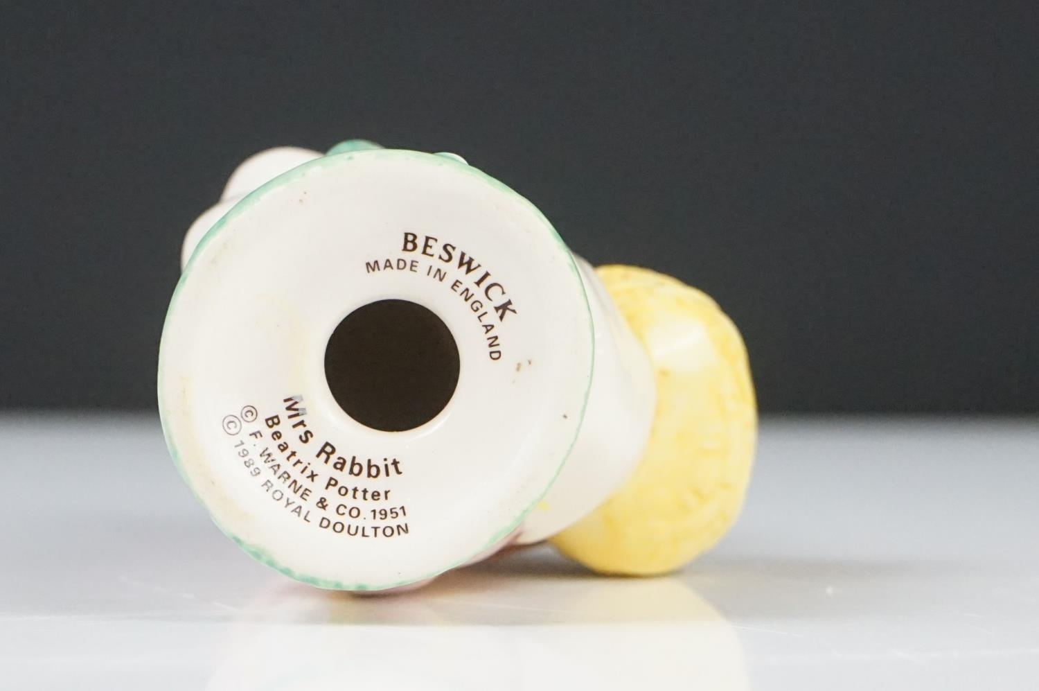 Five Beatrix Potter Figures including Beswick Miss Tiggy-winkle, Miss Moppet, Rebeccah Puiddle-duck and Mrs Rabbit plus Royal Albert Mrs Rabbit and Peter