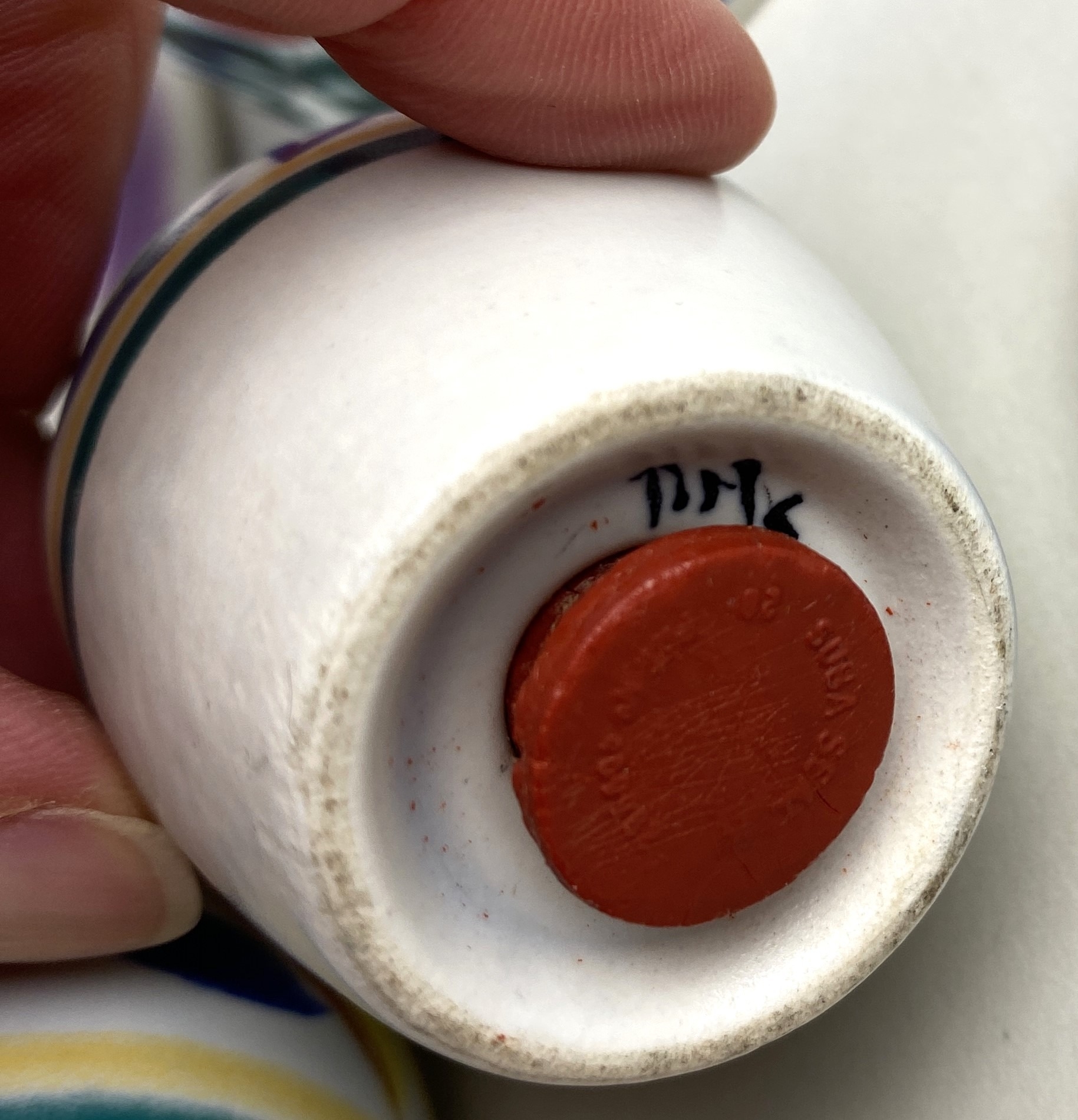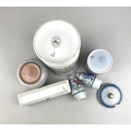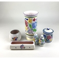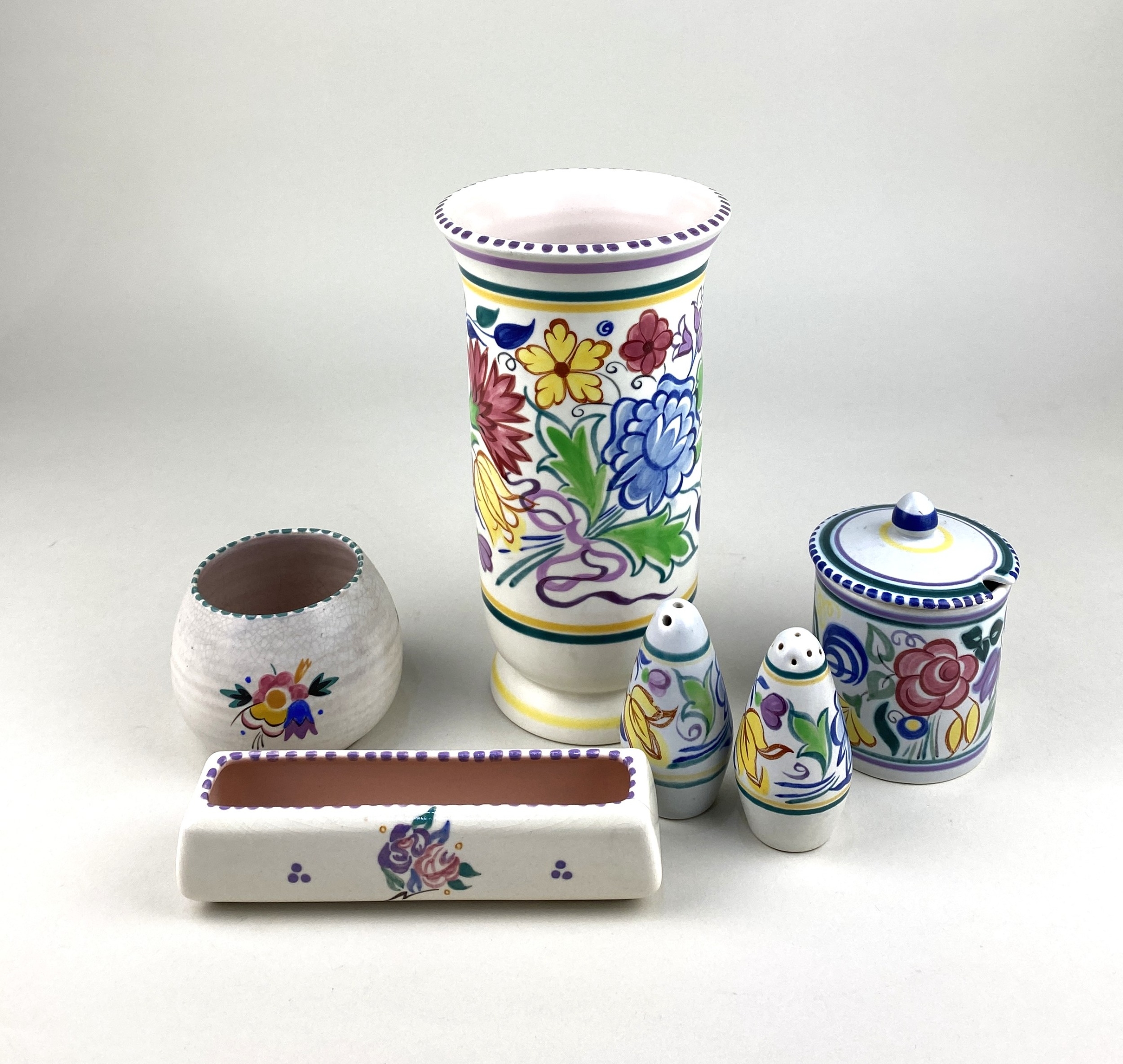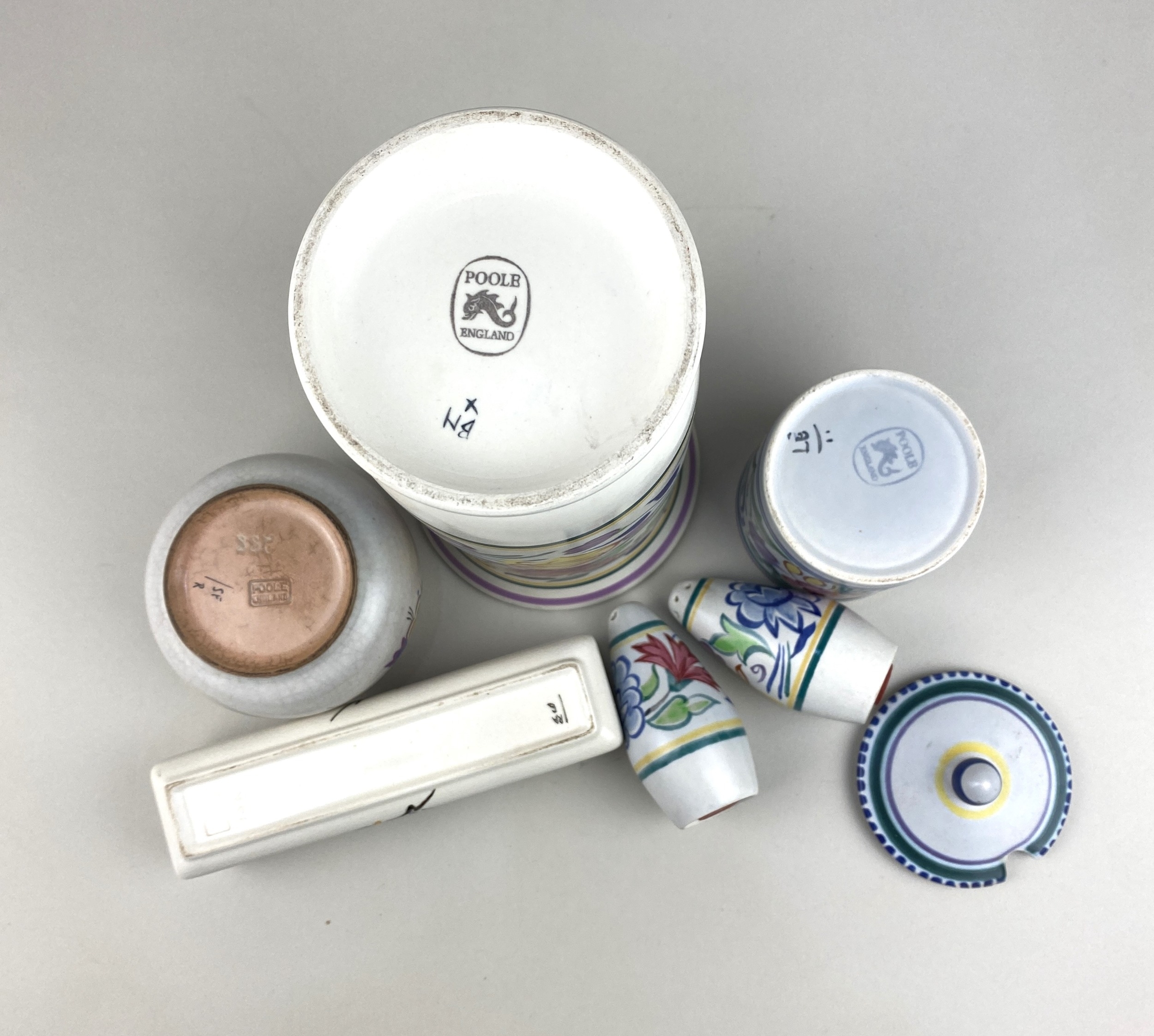 A collection of Poole pottery with floral pattern on white ground, comprising cylinder vase 22cm high, small baluster vase, trough shaped posy vase, condiment pot and cover and a salt and pepper