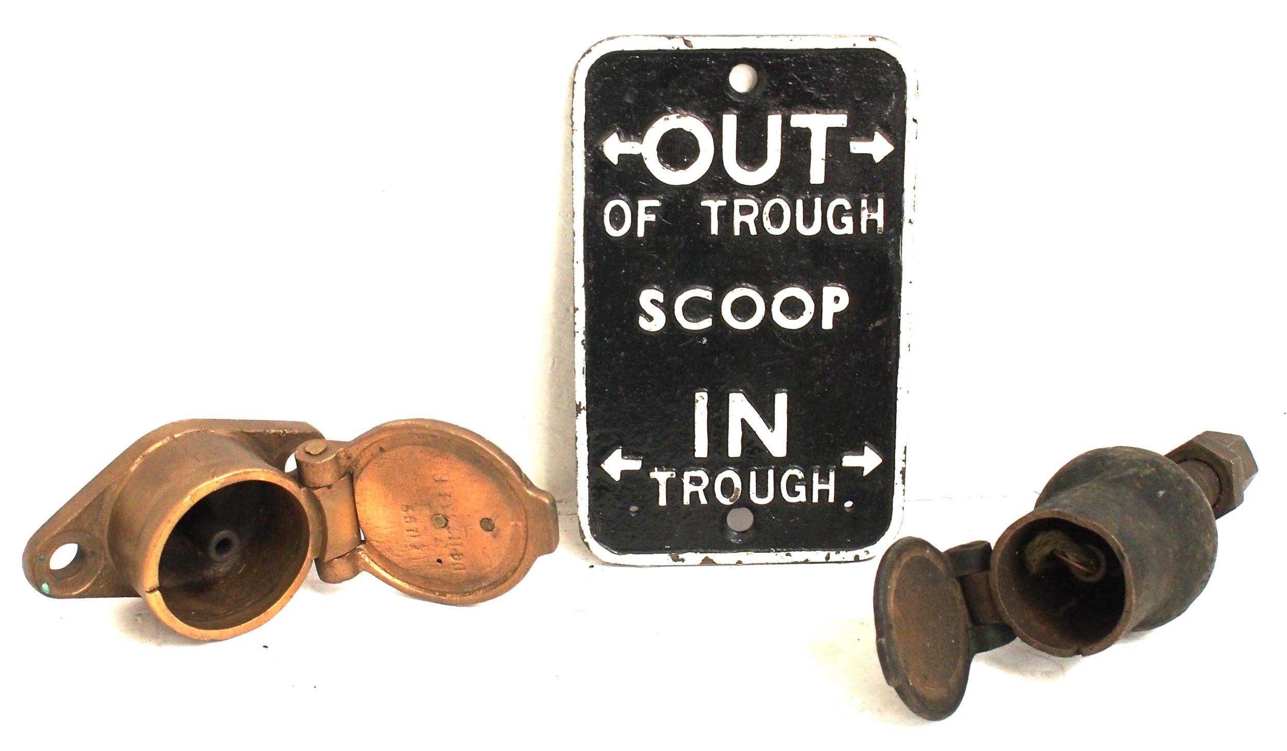 Locomotive tender water scoop plate, two oil lubrication feed cast brass pots. (3) (A2X) (Dispatch by Mailboxes/Collect from Banbury Depot)