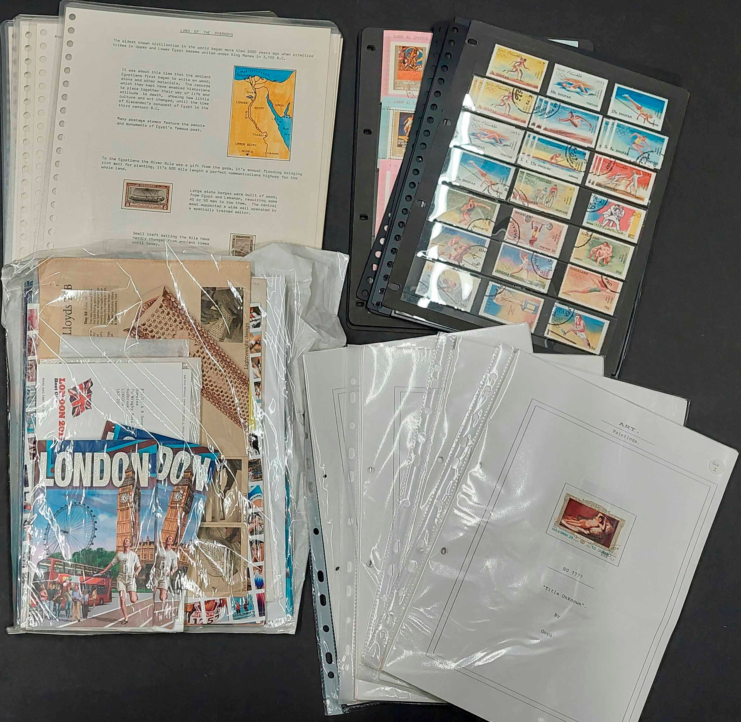 MISCELLANEOUS FOREIGN COLLECTIONS: Carton containing USA, mostly modern with mint multiples, souvenir sheets, etc.; Arabian Gulf inc Aden RSW 10r & KGVI to 10/-; modern Russia mini. sheets, etc. on stock sheets; a 'Historical Egypt' thematic display and a large Art thematic collection. Also 2012 London Olympics FDCs and ephemera. (Many 100s) Cross Reference: ART AND ARTISTS, UNITED STATES OF AMERICA, RUSSIA, OLYMPICS