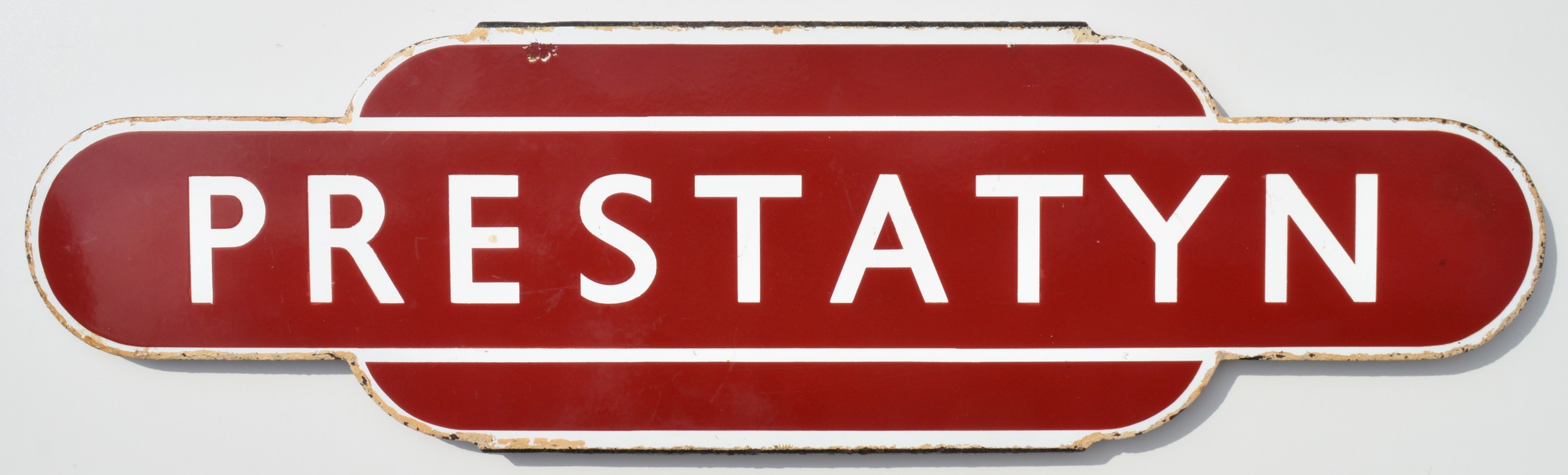 Totem, British Railways Midland Region H/F PRESTATYN. A North Wales location famous for its holiday camp, this station is located between Flint and Rhyl. Good colour, loss of gloss, one retouched chip top left, and so older retouches to the white edge. Rear repainted. Nice and straight. 36 x 10 inches. Shipping band - D.
