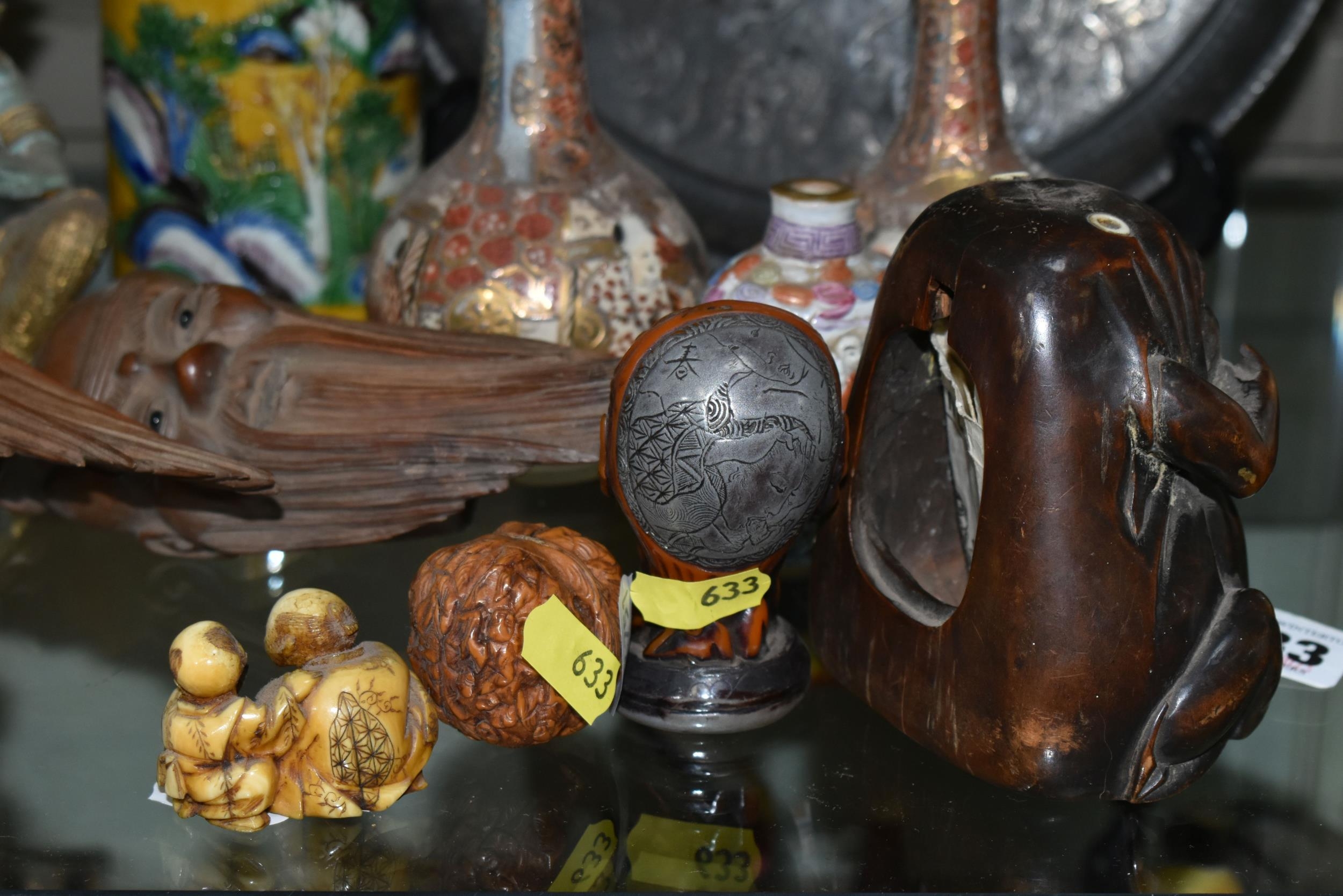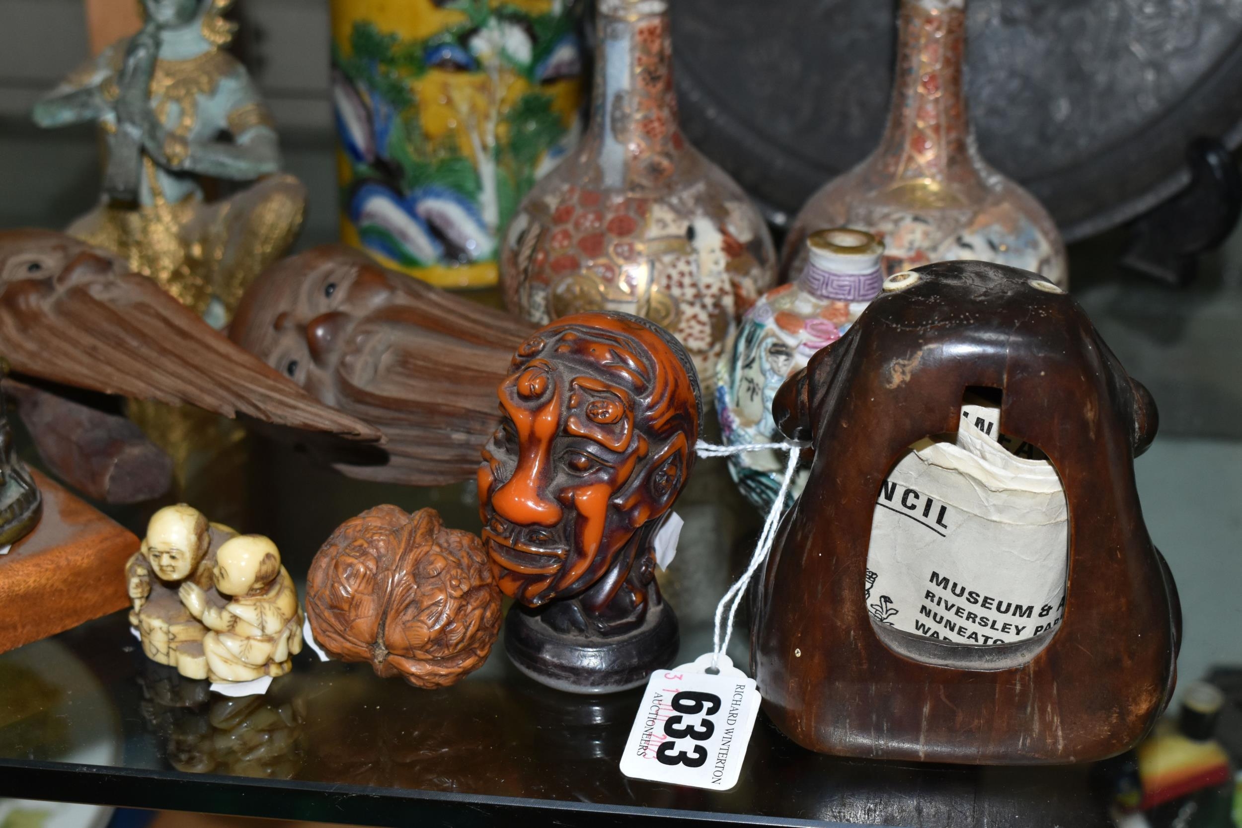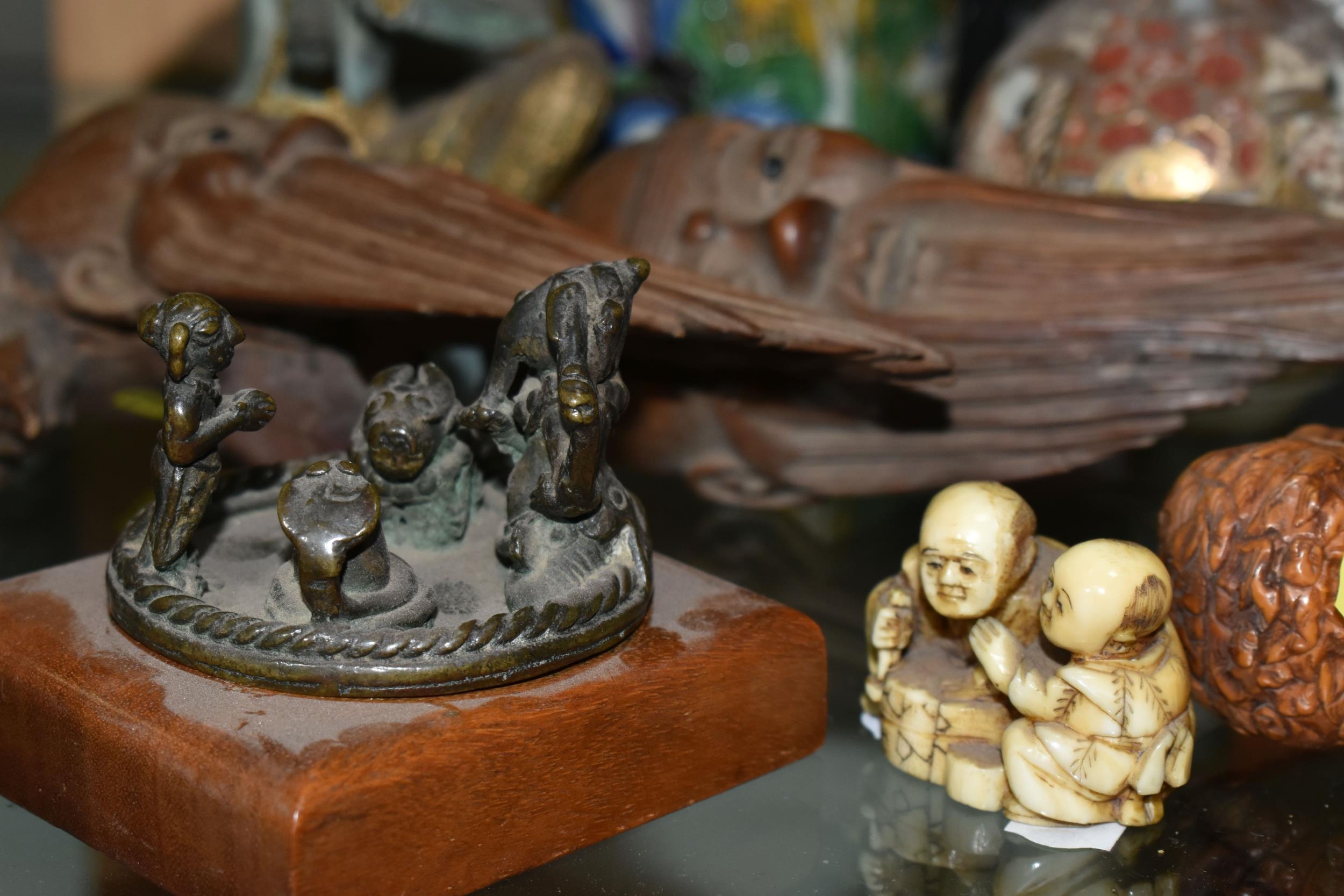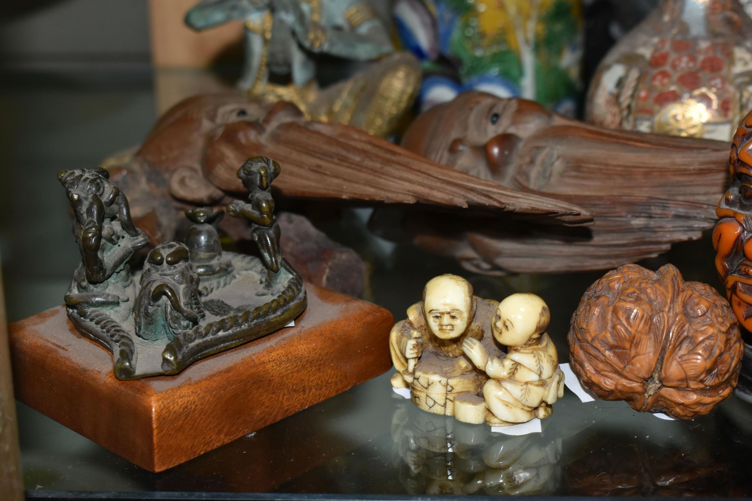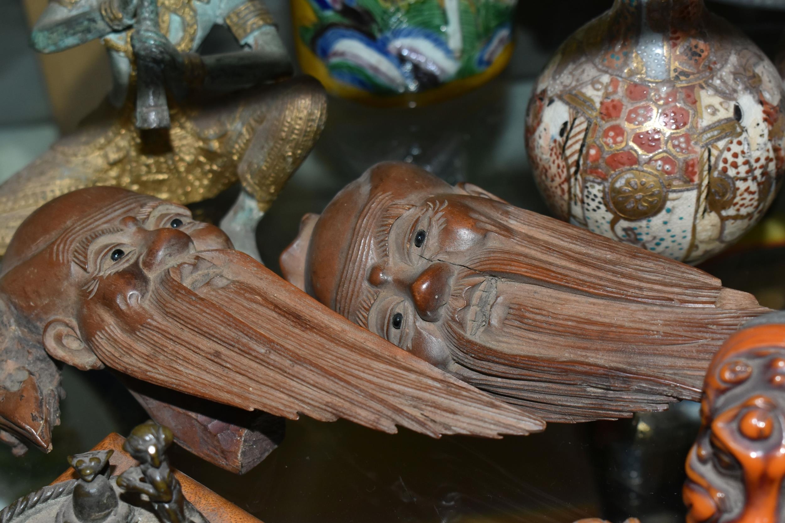 A GROUP OF ORIENTAL AND ASIAN CERAMICS, TREEN, METALWARE, ETC, including a late 19th century Japanese treen tobacco box /tonkotsu, with mother of pearl eyes, lacks back and base, height 9.5cm, a porcelain snuff bottle with relief decoration, height 7.5cm, a bone netsuke of two figures, two carved bearded male faces, two Satsuma pottery onion shaped vases, a resin and metal mounted erotic seal, small bronze group on a wooden plinth, etc (12)